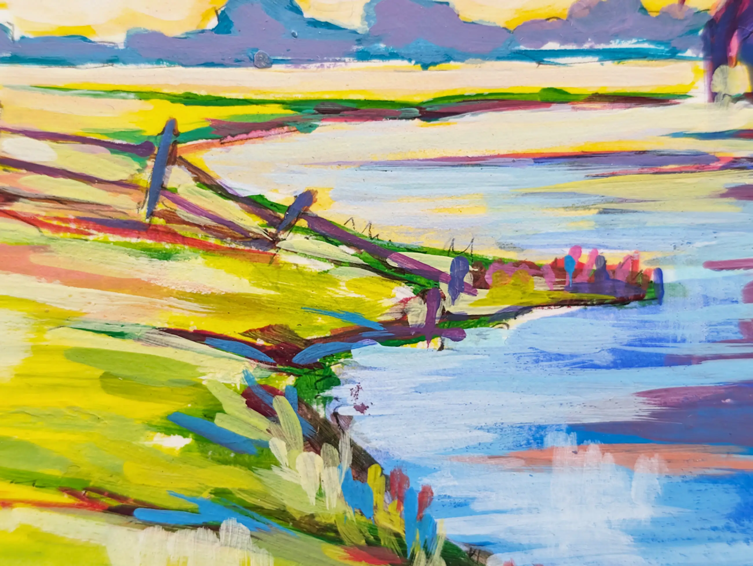 De compositie is evenwichtig opgebouwd: links leidt een glooiende oever het oog het beeld in, richting de bomenpartij in het midden. Het water vormt een brede, horizontale zone die de ruimte opent. De horizon is laag gehouden, zodat de lucht – met gelaagde banen van blauw, paars en warm geel – een belangrijke rol krijgt.