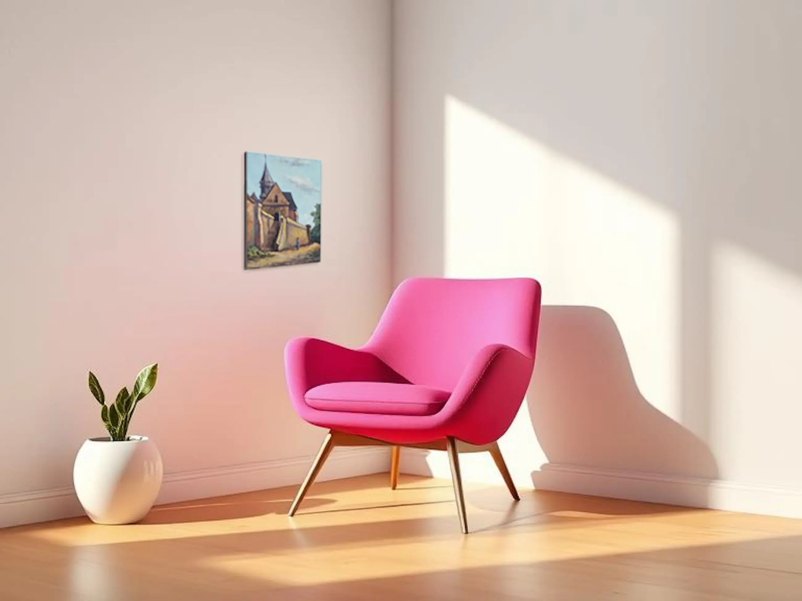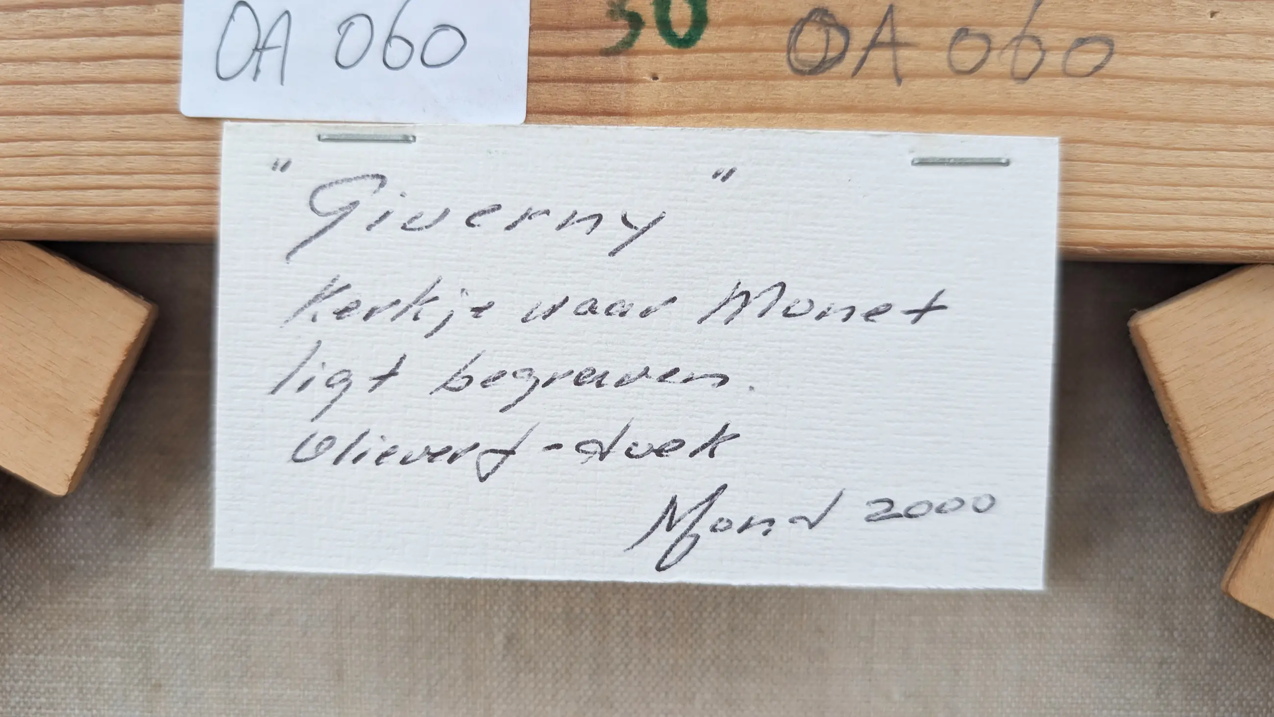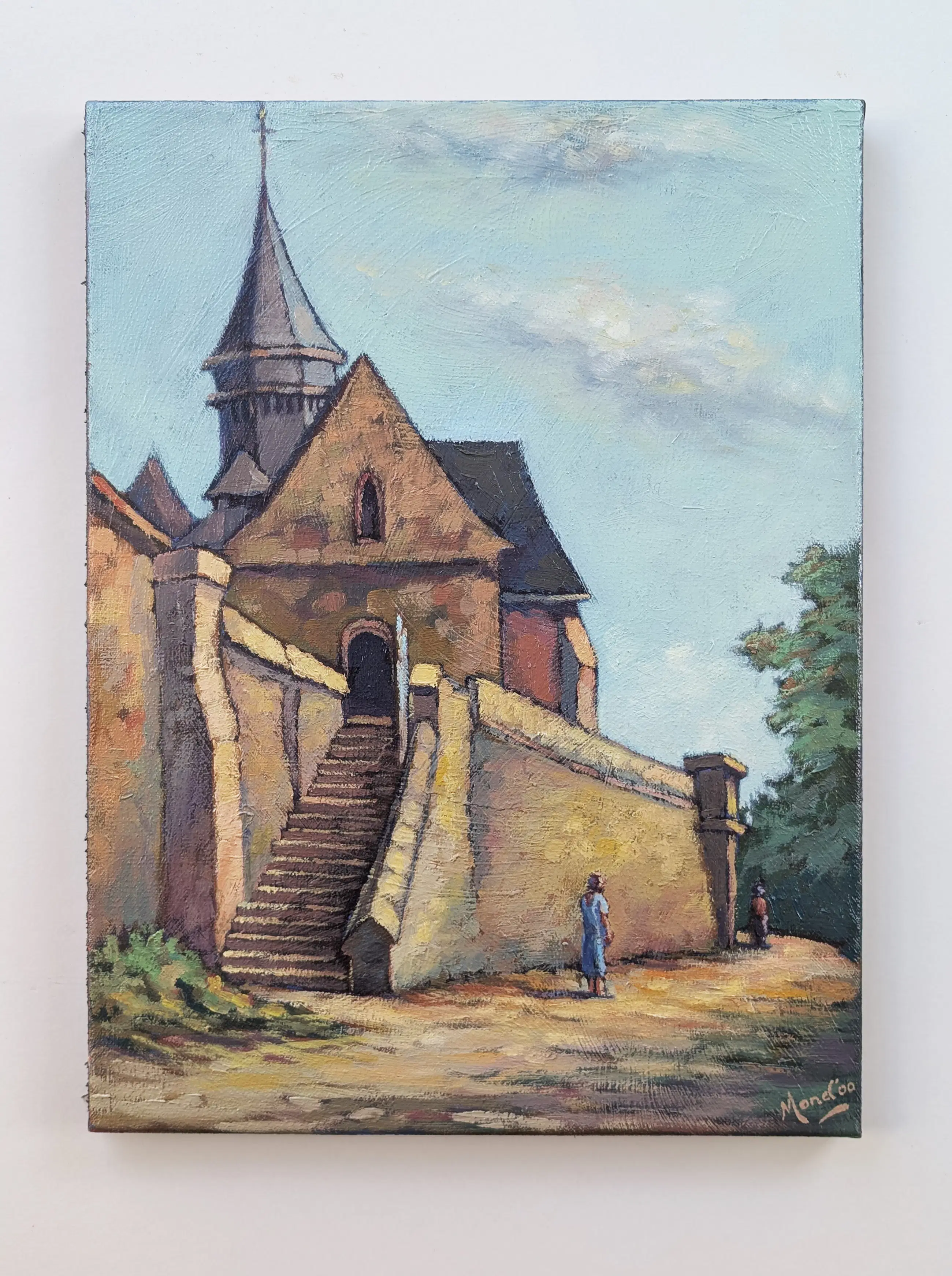 De laatste rustplaats van Monet ligt achter deze kerk. Van Egmond schilderde het kerkje in een sterk realistische stijl met een getemperd kleurenpalet. Het licht in de late middag valt op de muur die rond de kerk staat.