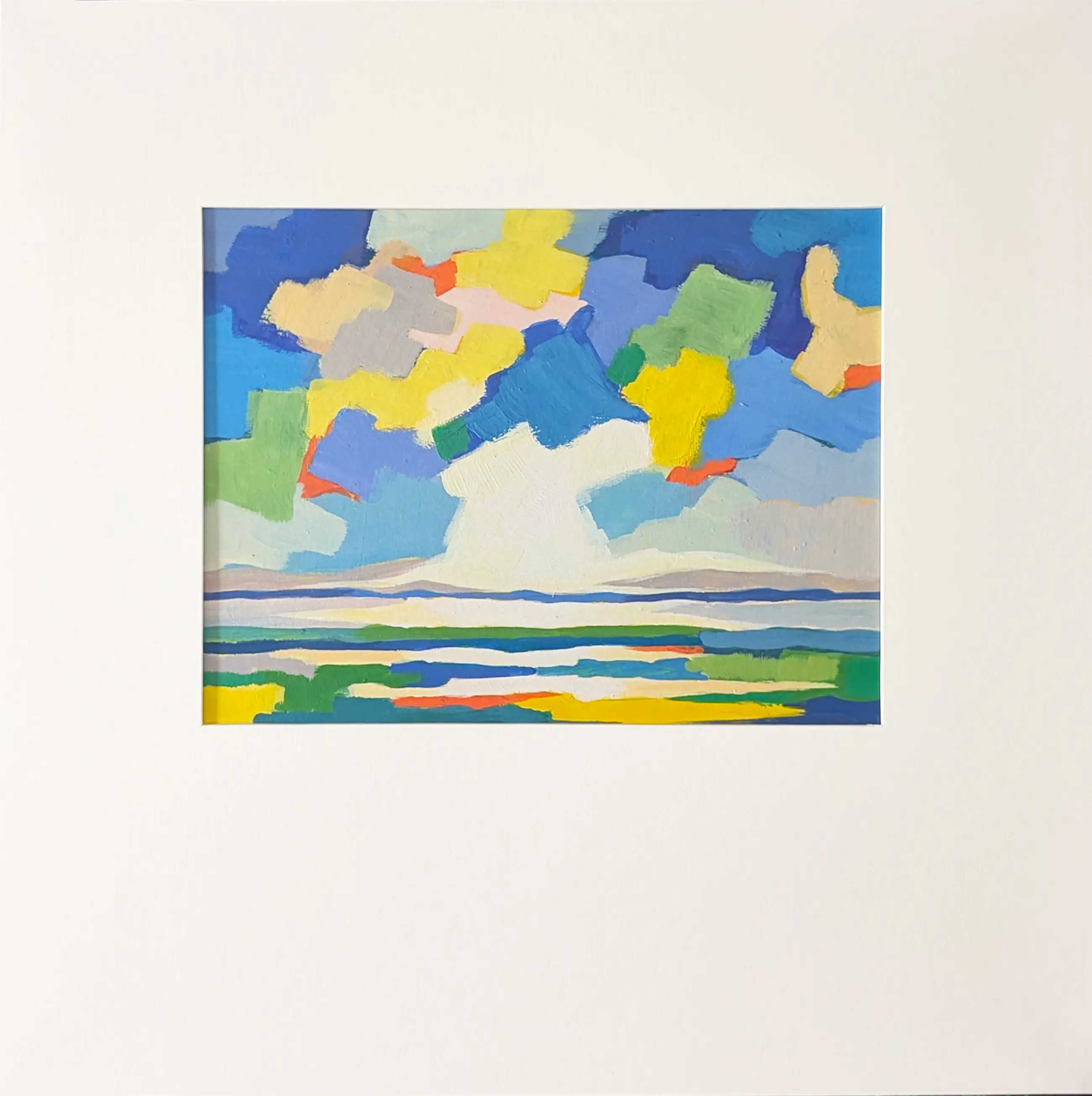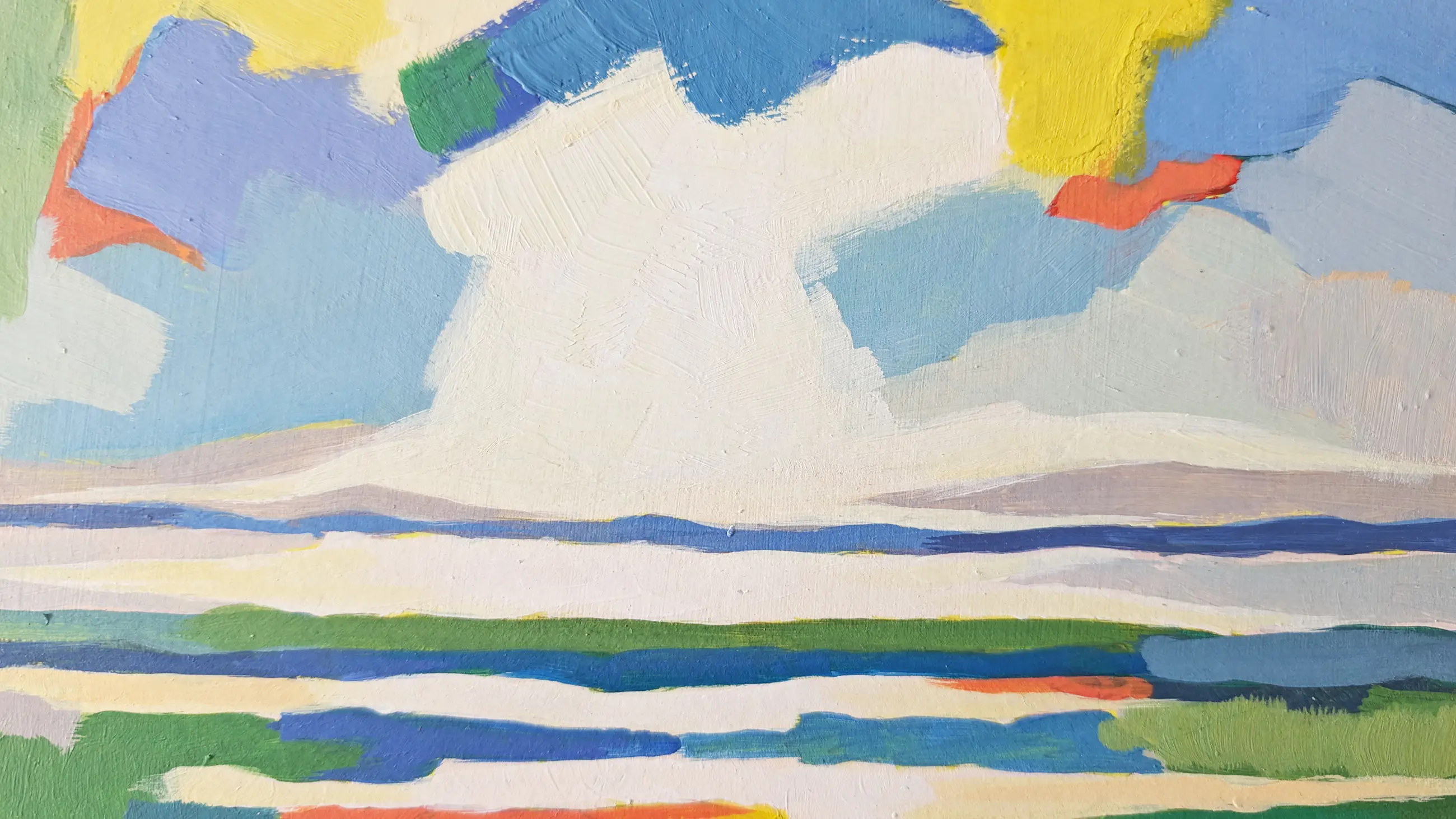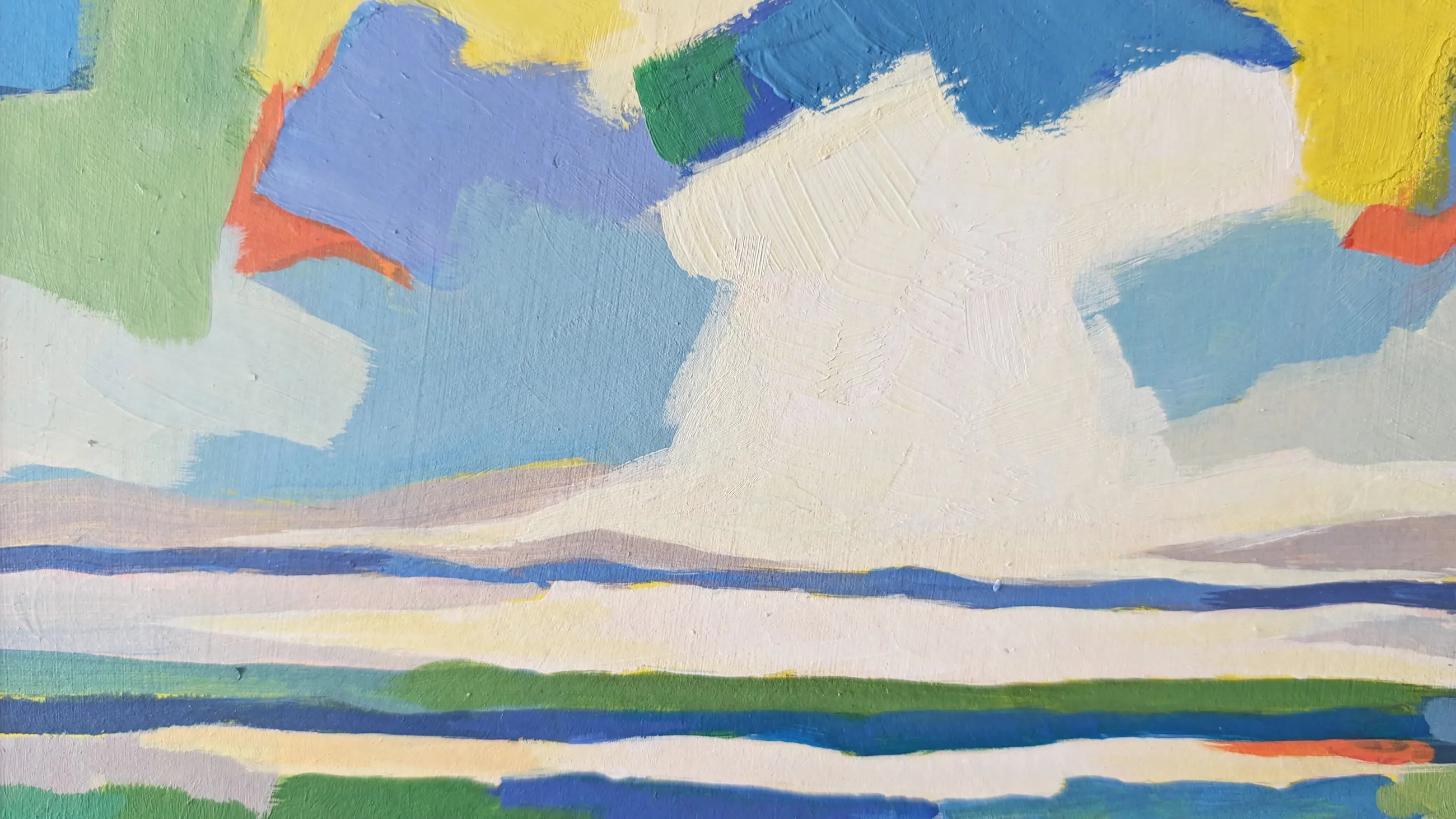 De horizon ligt laag, wat de lucht dominant maakt. Dit past bij het waddengebied, waar de ruimte en de lucht altijd overheersen. Blauwen en groenen overheersen, afgewisseld met geel, wit en accenten van rood/oranje. Deze warme kleuren doorbreken de koelte van zee en lucht en brengen beweging en spanning. Dit is karakteristiek voor het werk van Joop van Egmond (1943-2018).