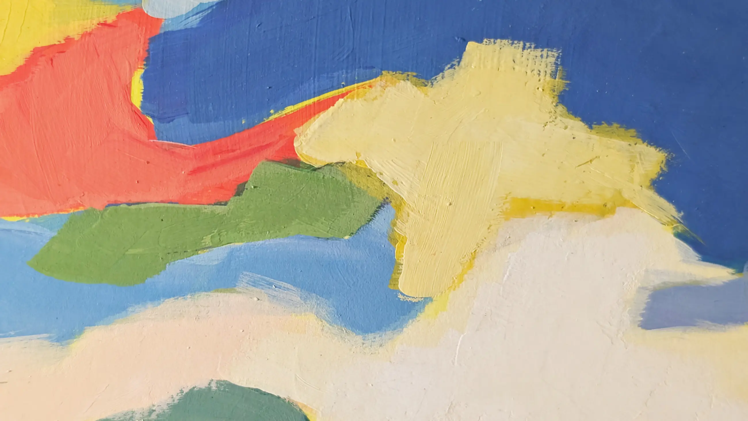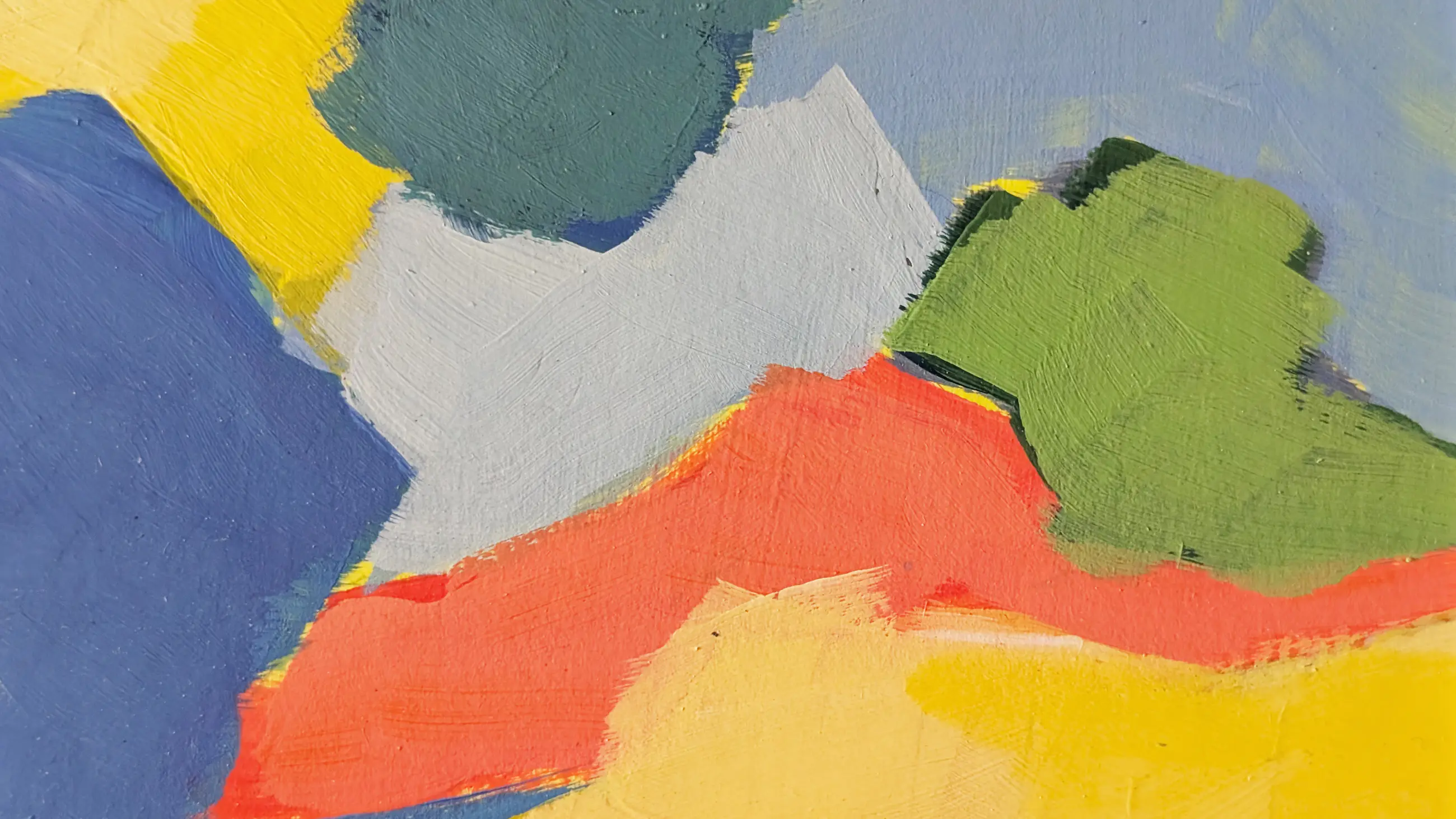 De kleuren zijn helder en verzadigd: blauw, groen en geel vormen de basis, aangevuld met krachtige accenten van rood en oranje. Deze warme kleurtoetsen brengen spanning en levendigheid, alsof het landschap oplicht onder wisselend zonlicht. De kleuren zijn niet naturalistisch, maar emotioneel geladen, wat past bij het werk van Van Egmond.