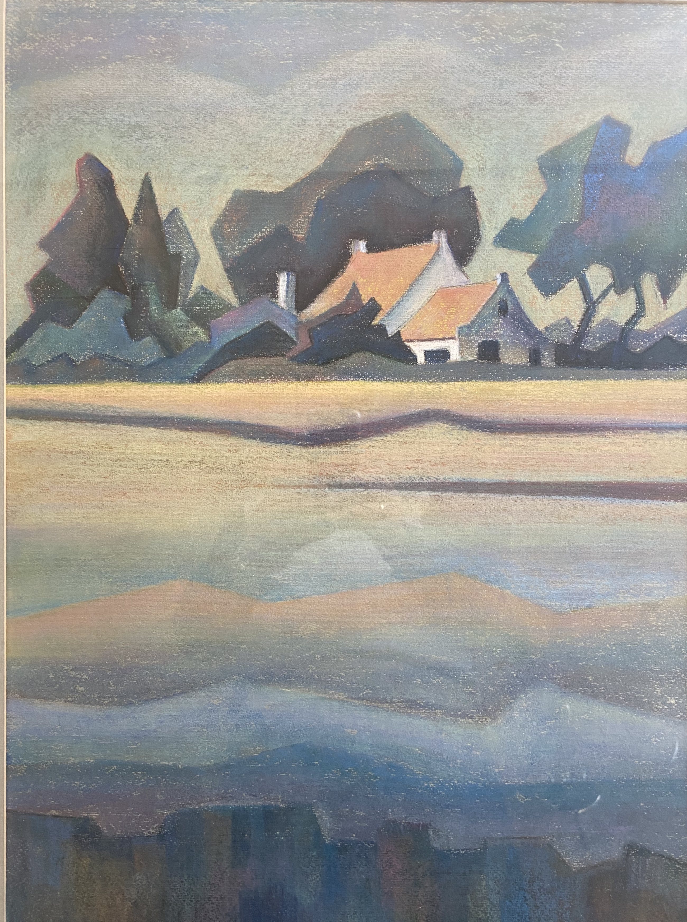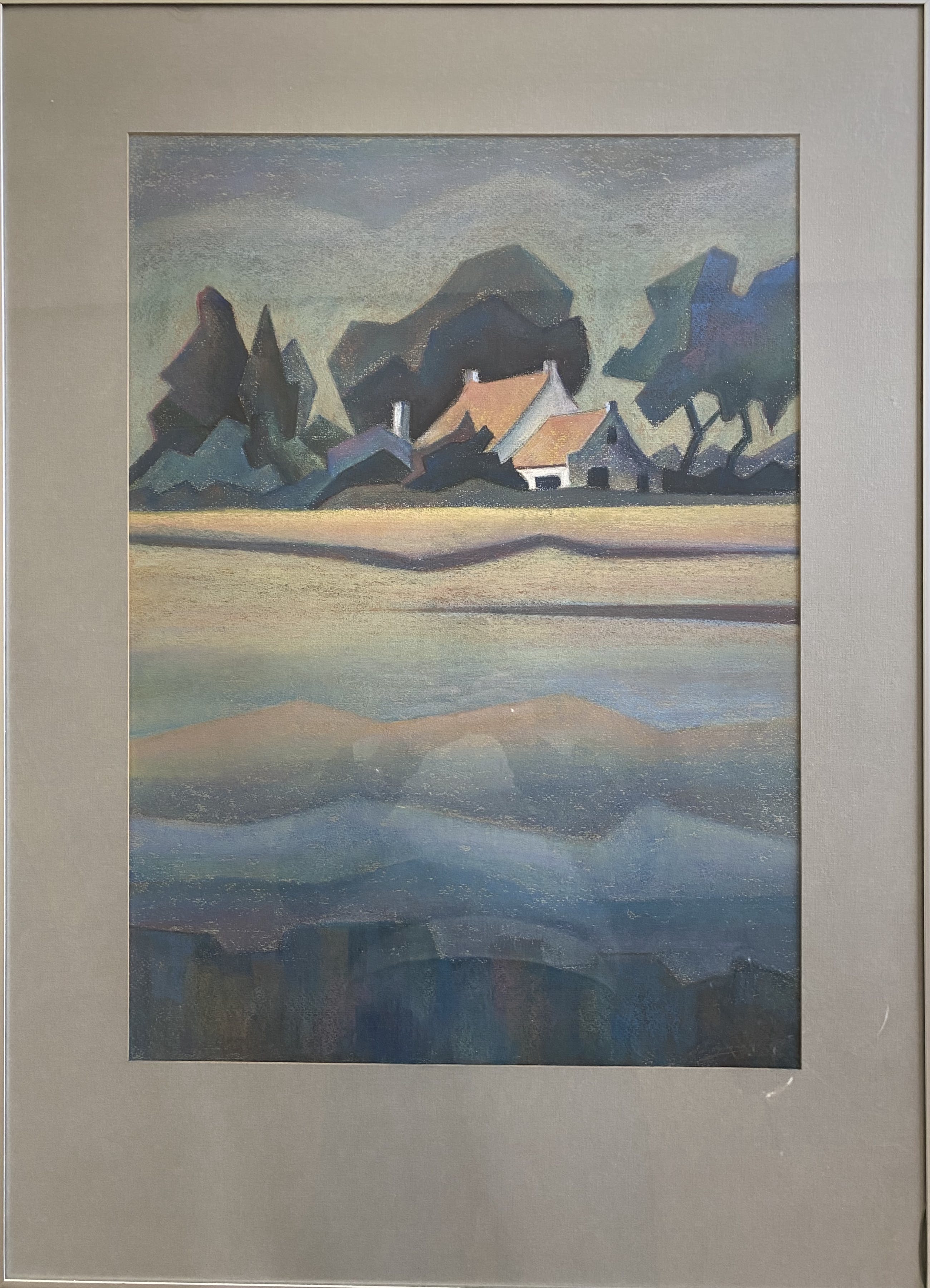 Mooi landschap van de Rijnsburgse kunstenaar Joop van Egmond. Werk uit 1984 genaamd Voorne Putten.