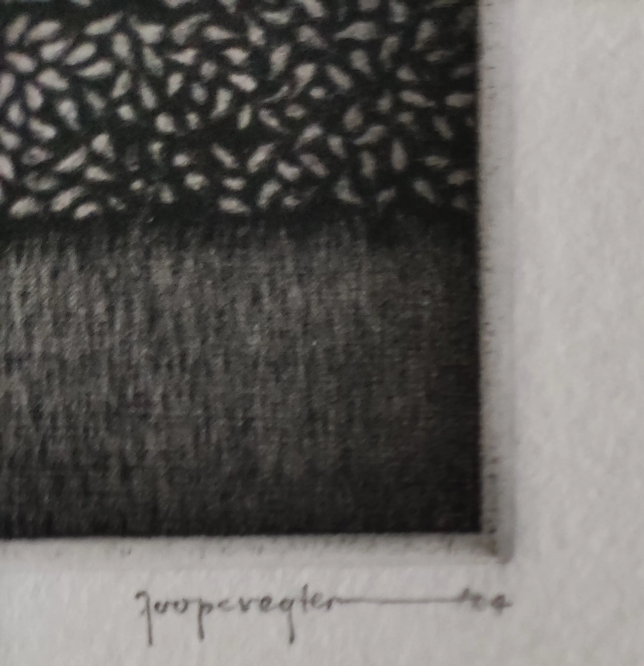 Getiteld linksonder. Losbladig. Joop C. Vegter werd geboren te Rijswijk op 9 november 1931 en overleed te Doorn op 8 september 2017. Opgeleid aan het Instituut voor Kunstnijverheid te Amsterdam en het Rijksinstituut tot Opleiding van Tekenleraren. Later docent aan de Academie voor Beeldende Kunstvorming te Amersfoort. Graficus (mezzotinten) en aquarellist. Lid van de Haagse Etsclub en het Amersfoorts Kunstgenootschap "De Ploeg".