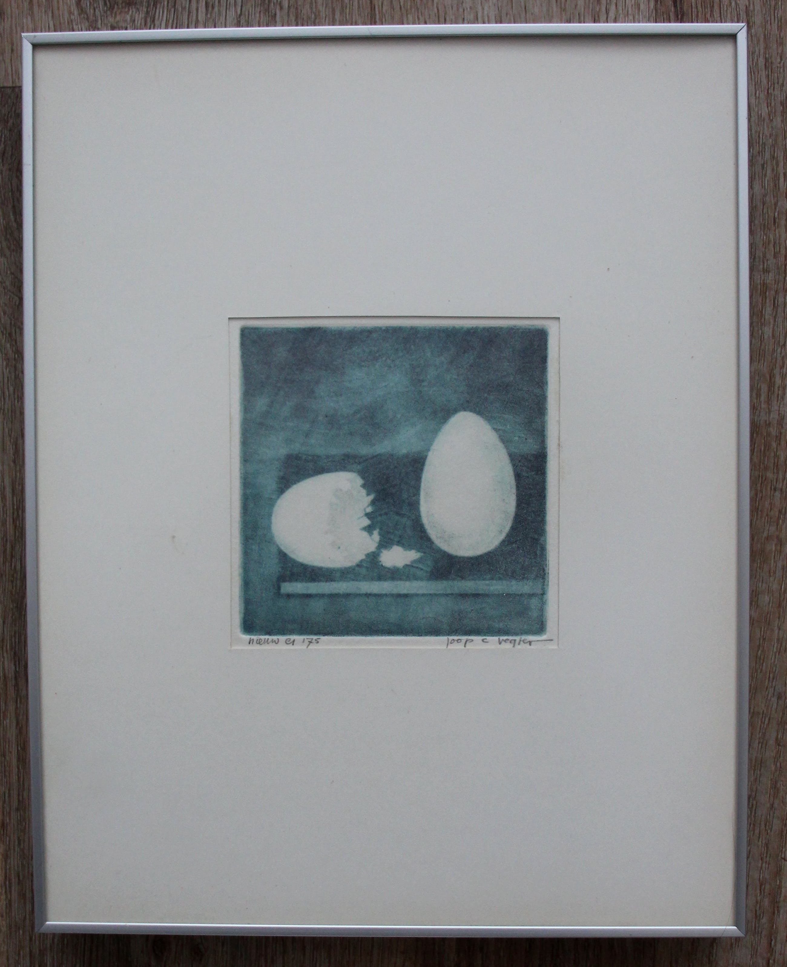 Ets van Joop Vegter. Jaar: 1975. Titel: Nieuw ei. Afmetingen incl lijst: H29.5 x b23.5cm. Afmetingen voorstelling: H10 x b10cm. Het werk is rechts onderaan, gesigneerd, door de kunstenaar. De authenticiteit van het aangeboden werk wordt volledig gegarandeerd. Een certificaat van echtheid kan, op aanvraag, worden gemaild.
