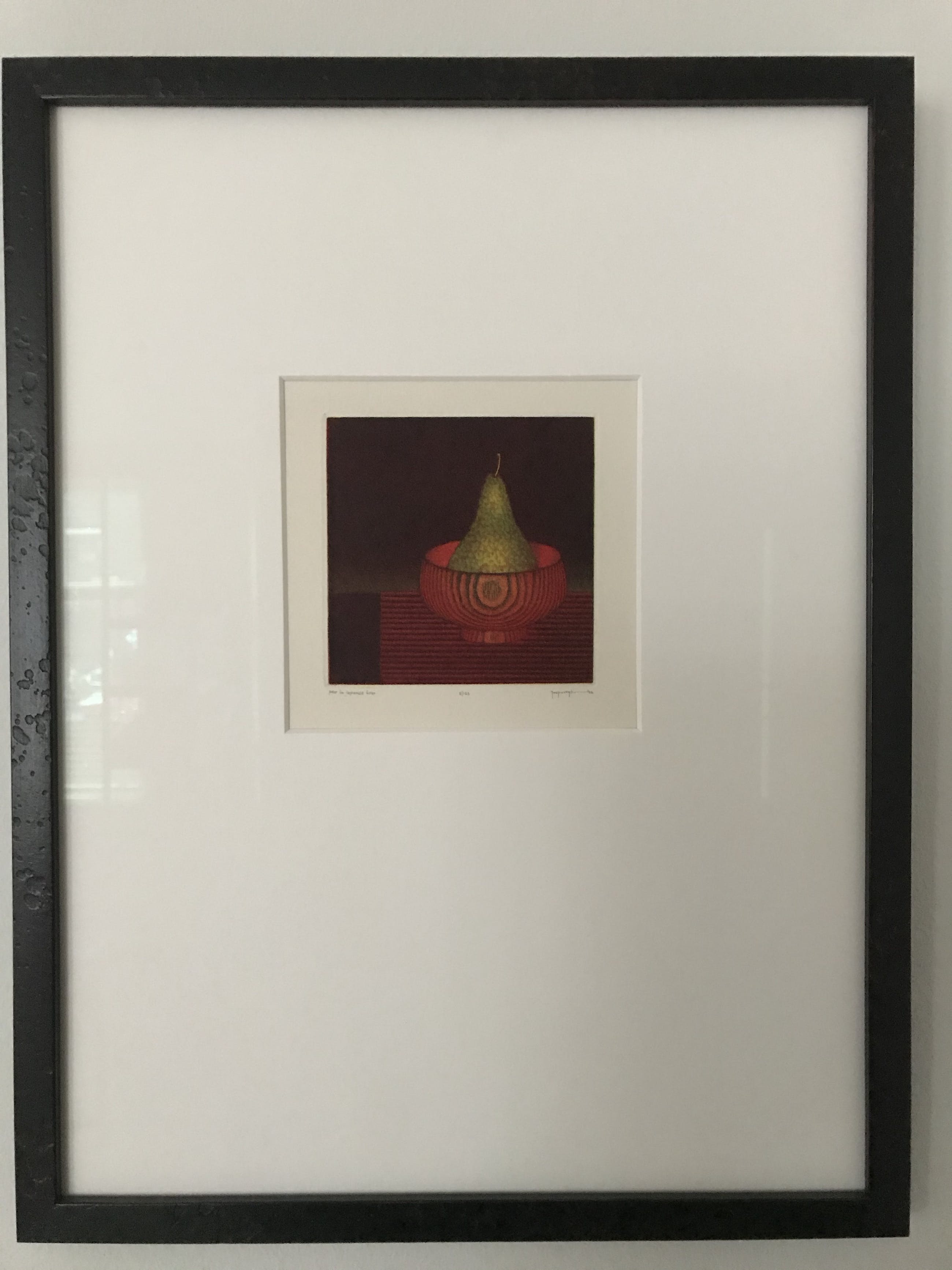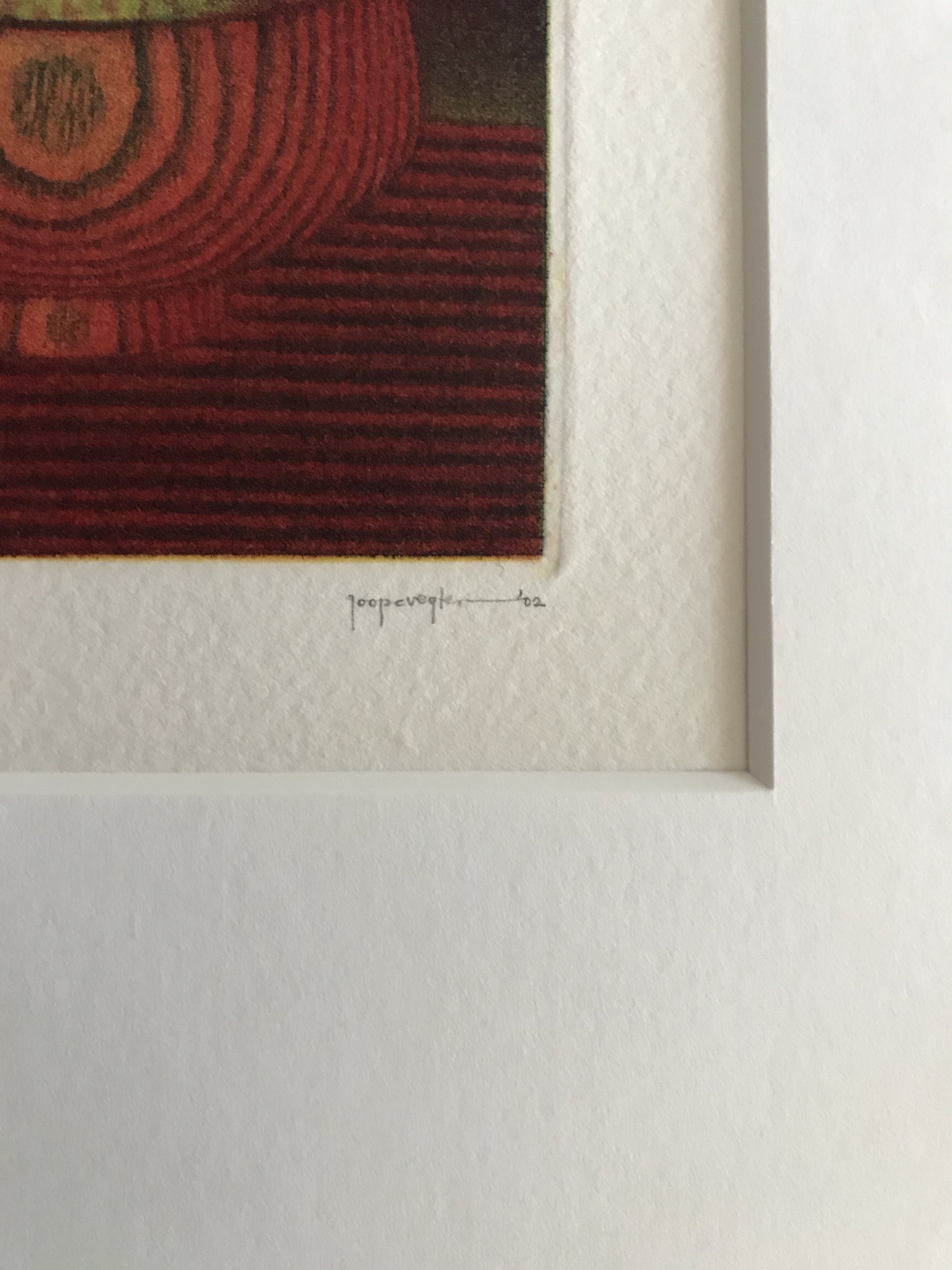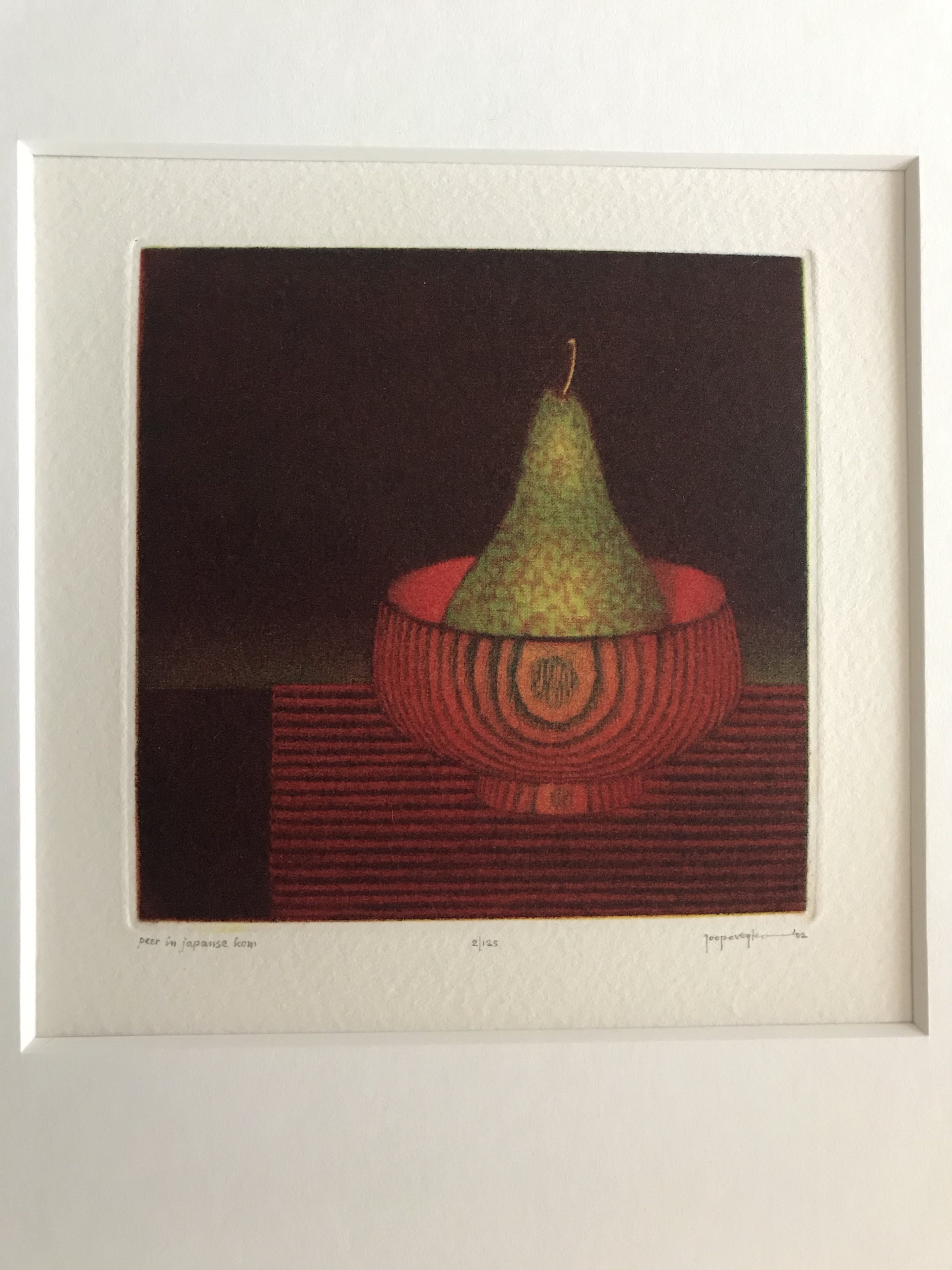 - In potlood beschreven en gesigneerd door de kunstenaar aan de onderrand: peer in japanse kom – 2/125 – joop vegter ‘02