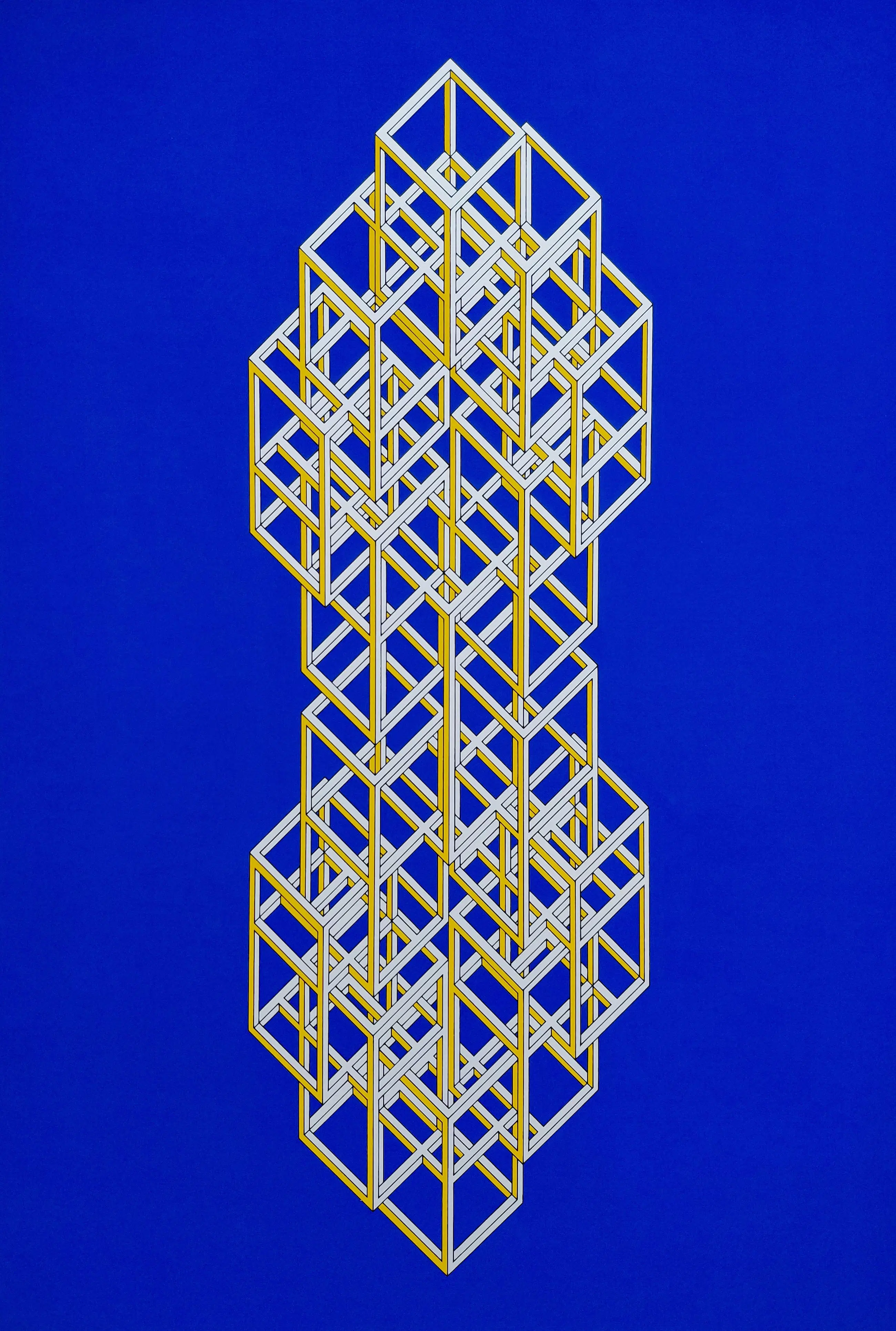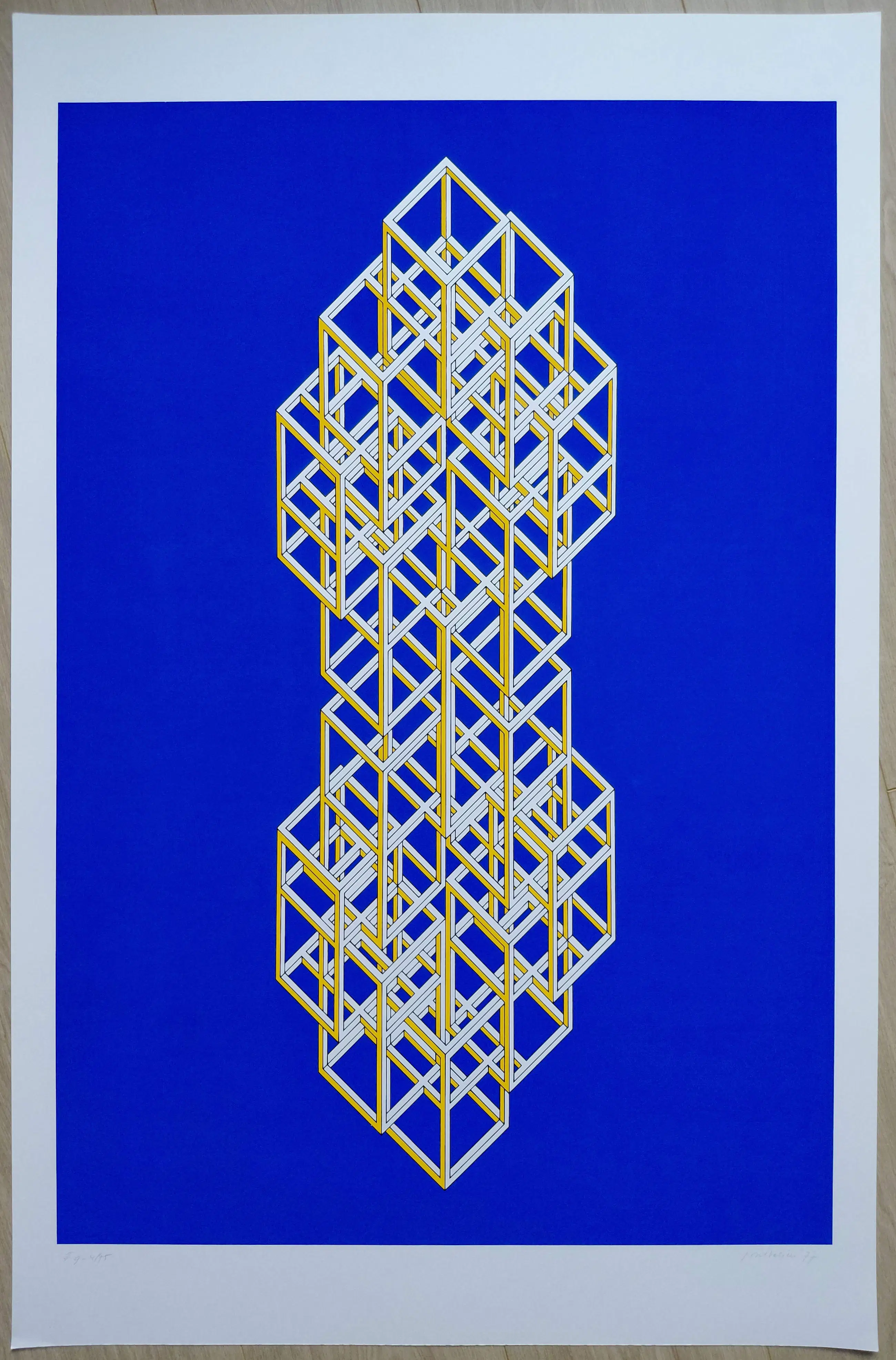 Zeer mooie, geometrische compositie van Joost Baljeu. Zeefdruk op papier, met potlood gesigneerd, gedateerd (‘77) en genummerd (4/75). In zeer goede conditie.