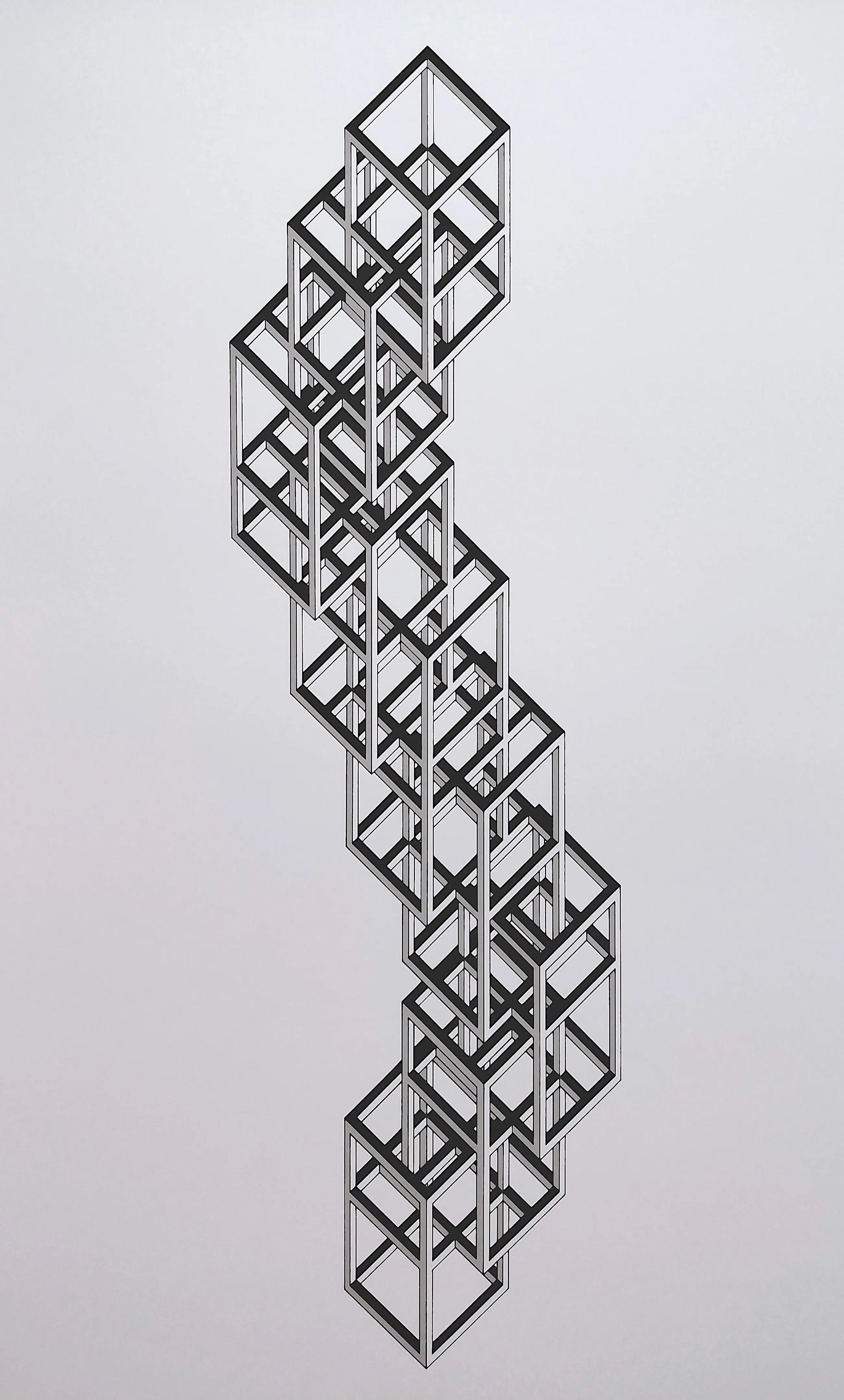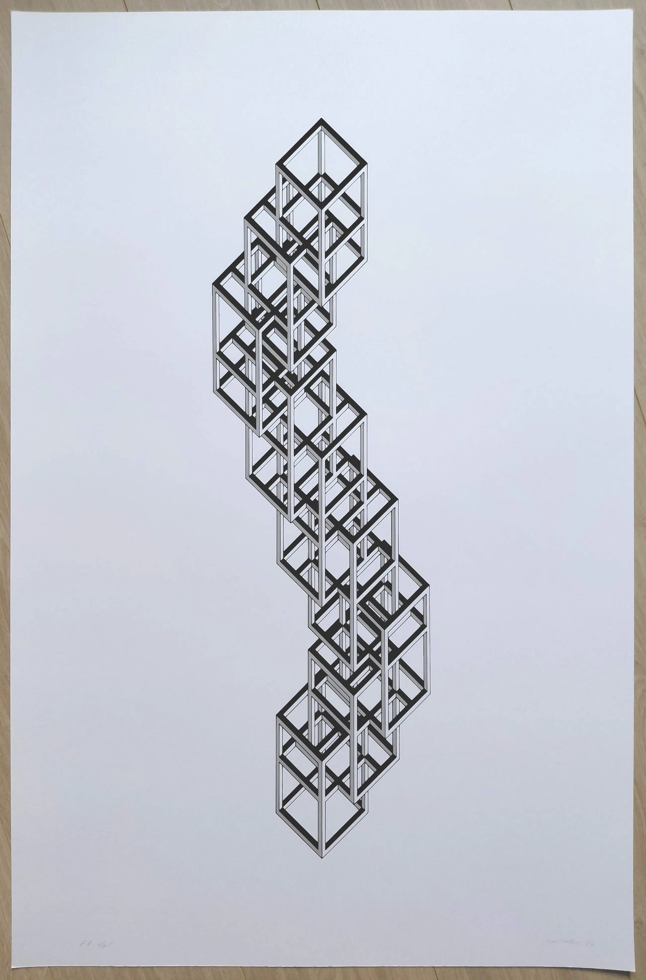 Zeer mooie, geometrische compositie van Joost Baljeu. Zeefdruk op papier, met potlood gesigneerd, gedateerd (‘77) en genummerd (4/75). In zeer goede conditie.