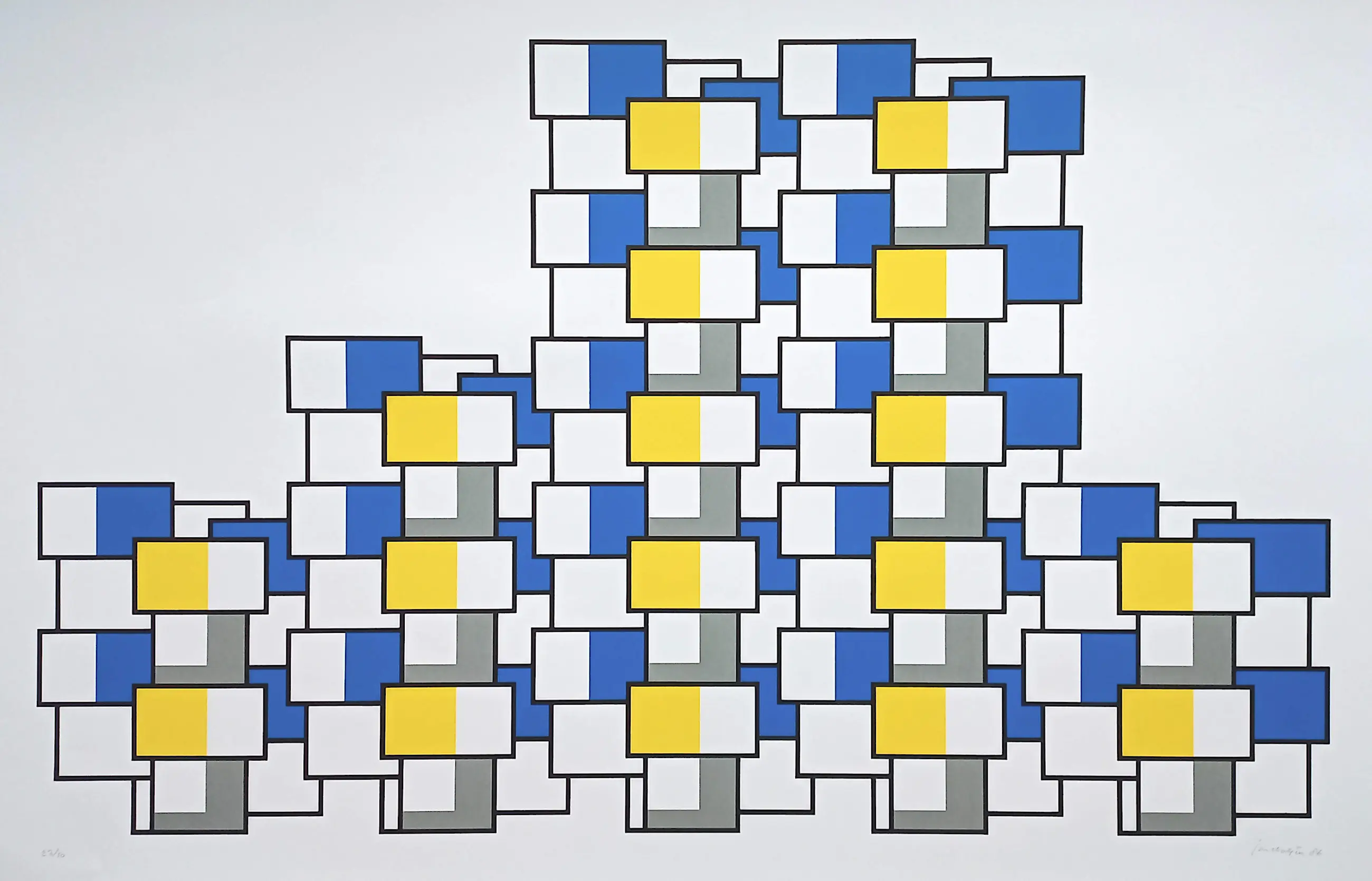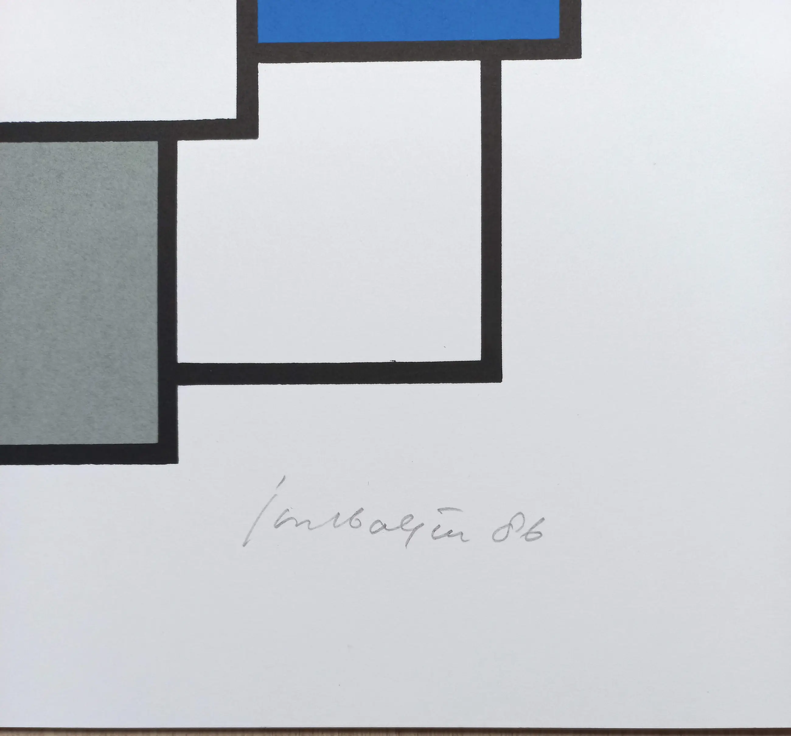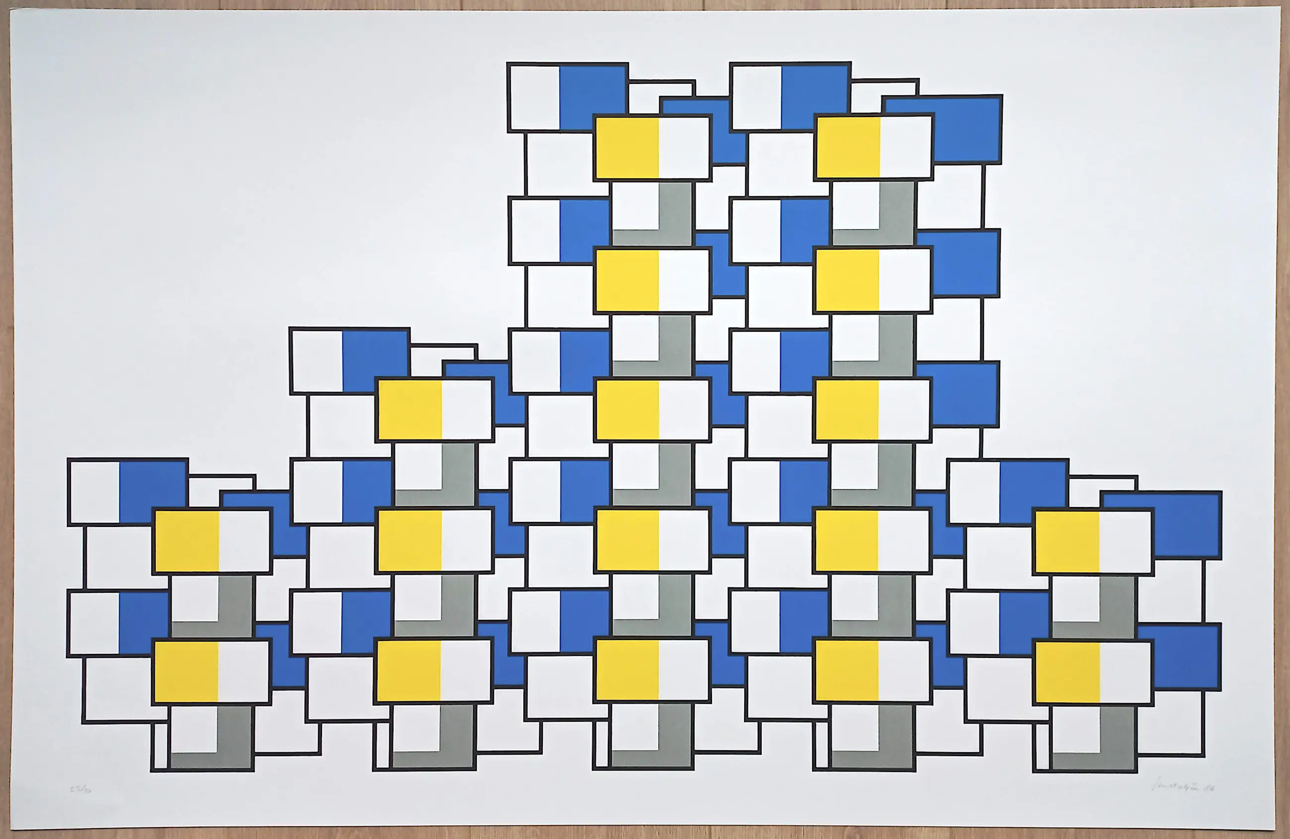 Zeer mooie, geometrische compositie van Joost Baljeu. Zeefdruk op papier, met potlood gesigneerd, gedateerd (‘86) en genummerd (23/50). In zeer goede conditie.