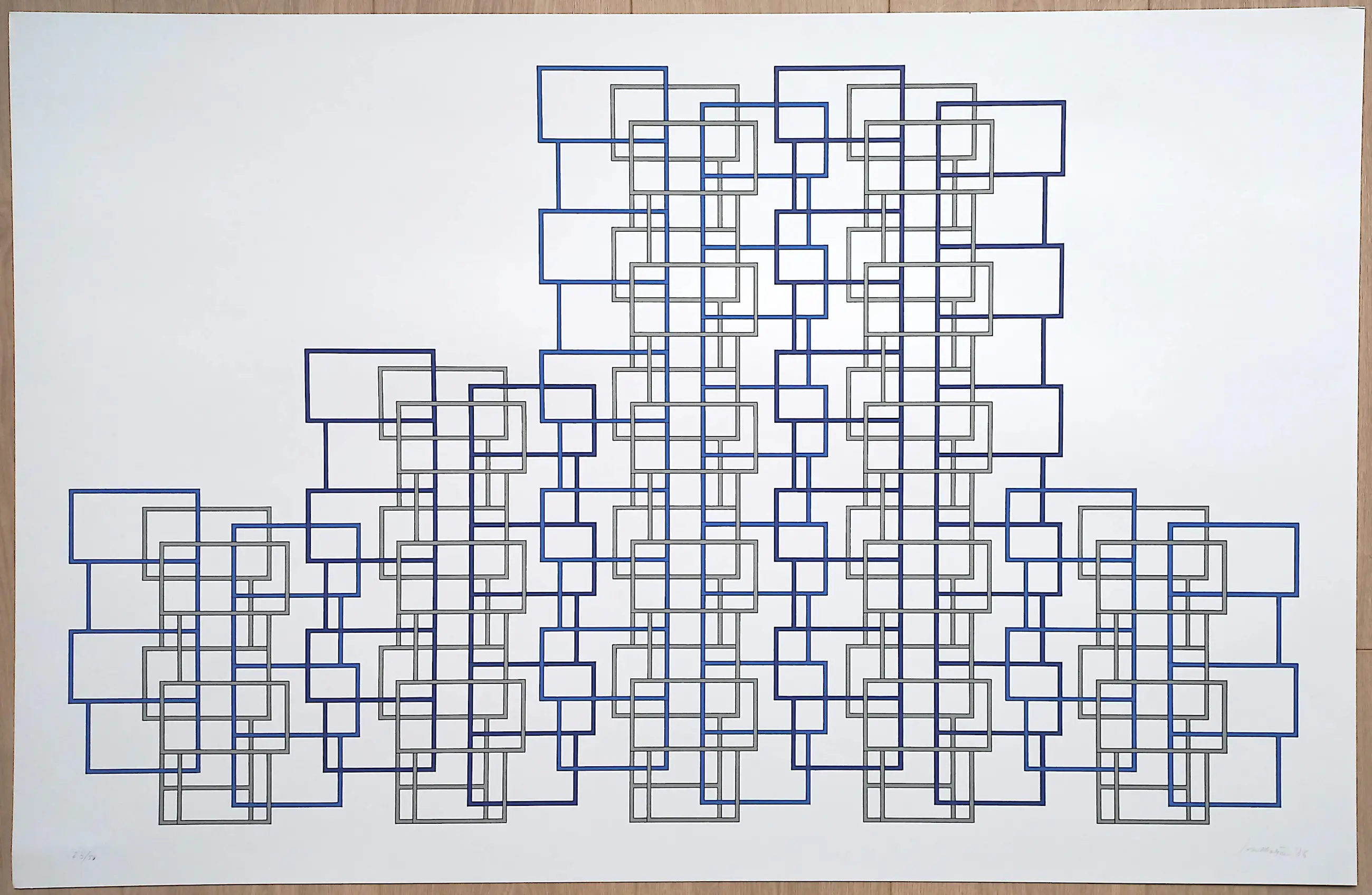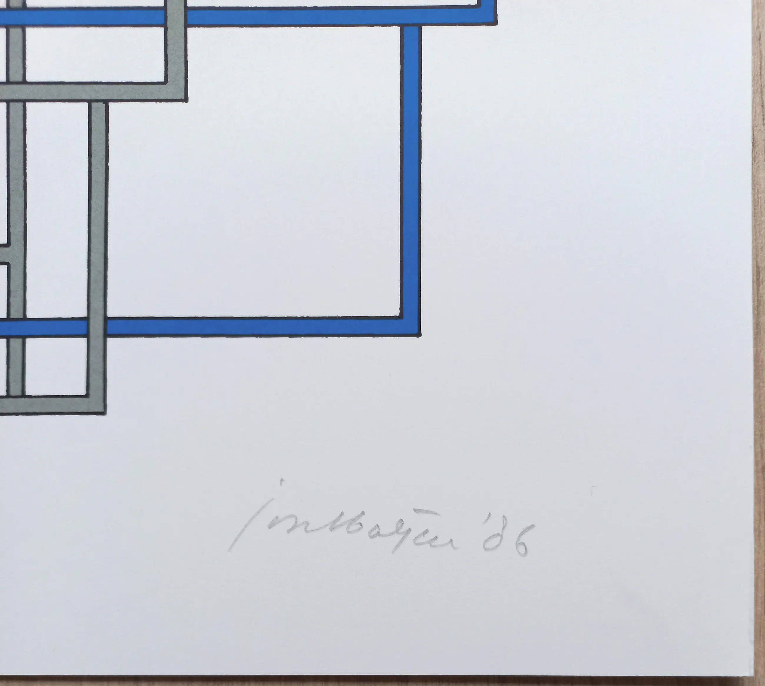 Zeer mooie, geometrische compositie van Joost Baljeu. Zeefdruk op papier, met potlood gesigneerd, gedateerd (‘86) en genummerd (23/50). In zeer goede conditie.