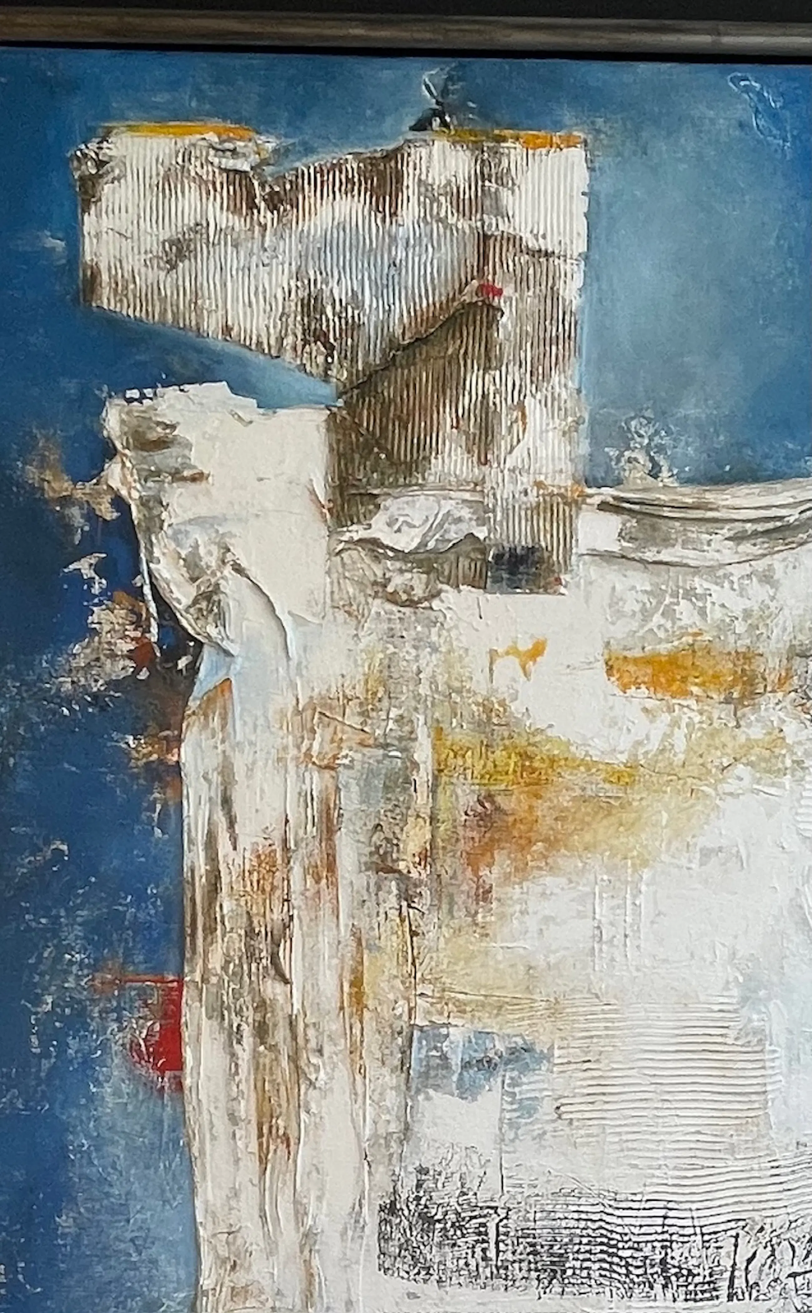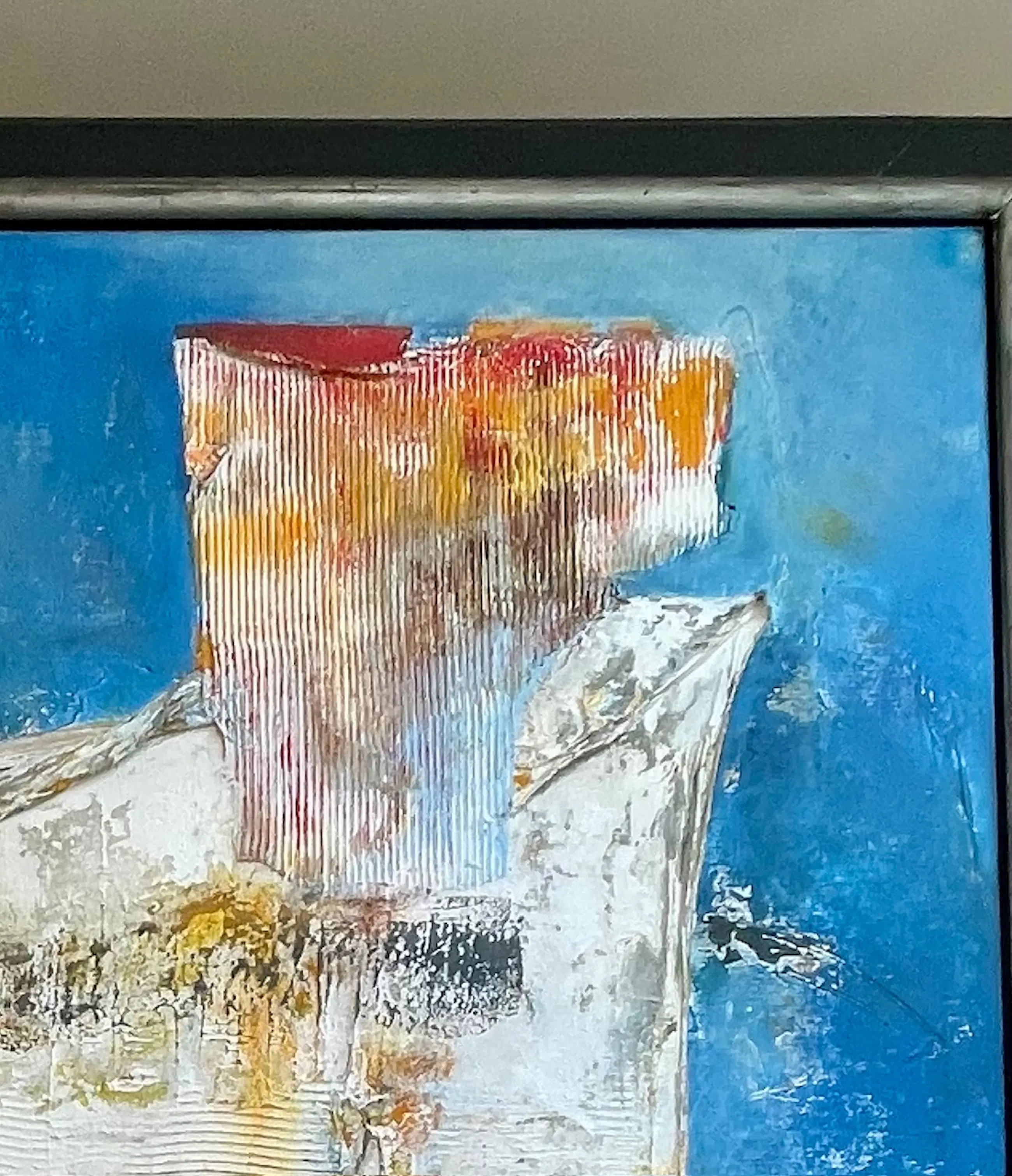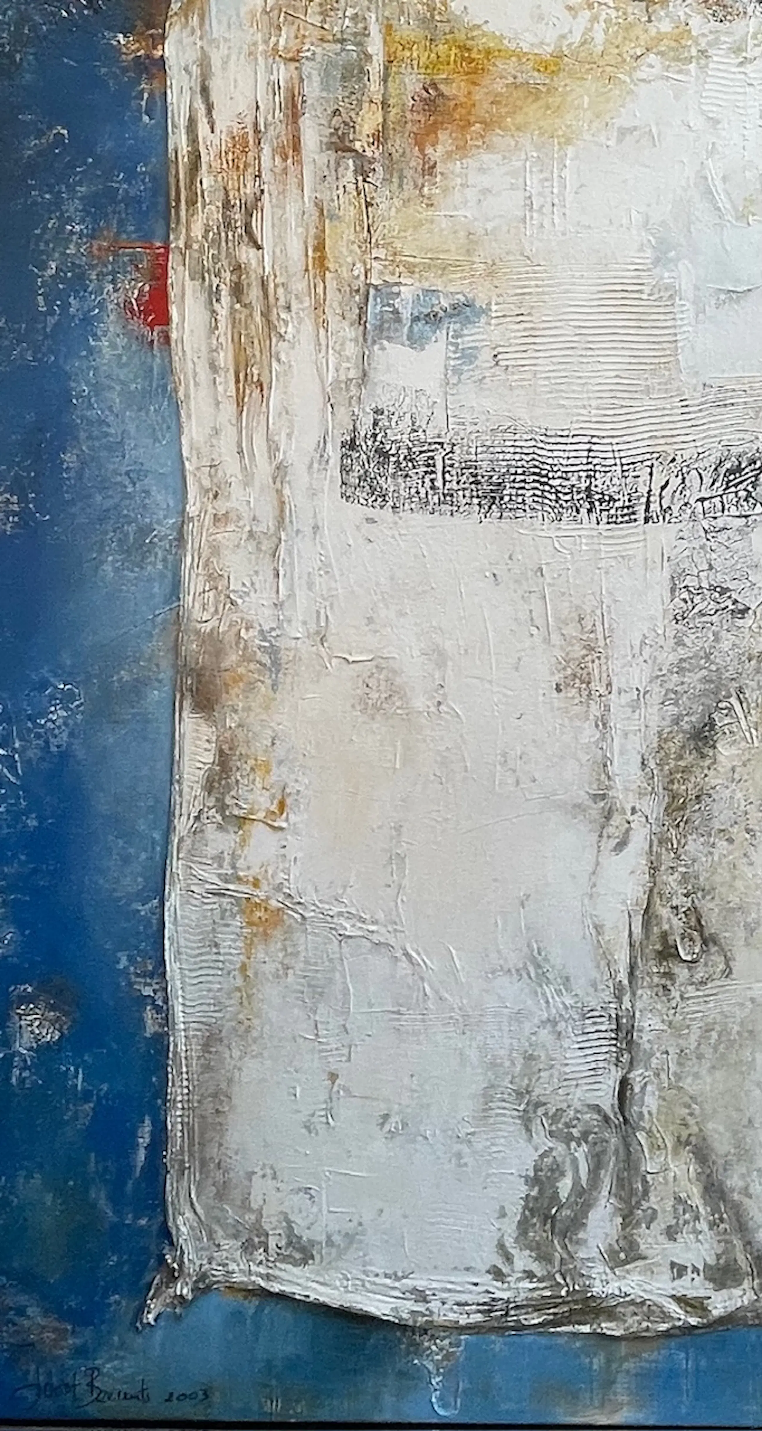 Mooi schilderij van Joost Beerents met een aansprekende blauwe kleur waar je vrolijk van wordt. In de olieverf is op sommige plaatsen textiel en karton verwerkt waardoor het werk wat reliëf krijgt.