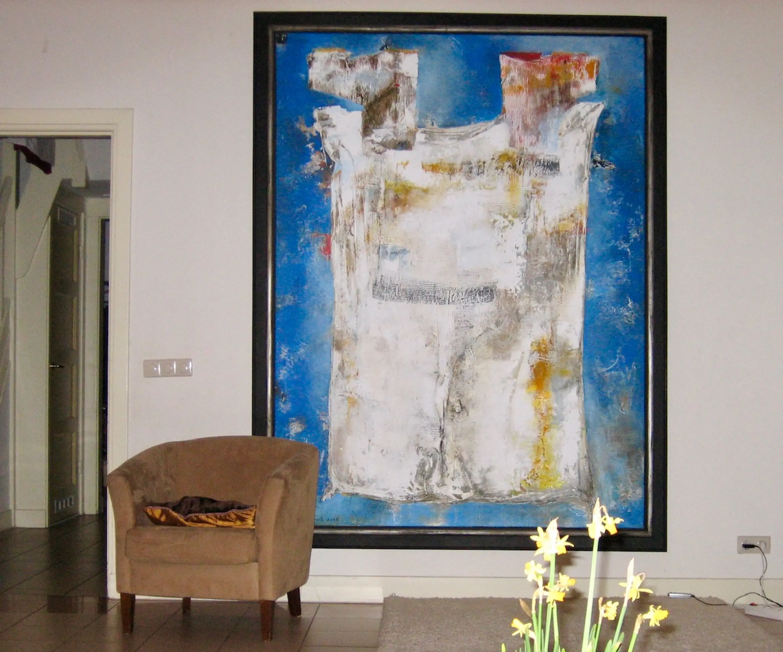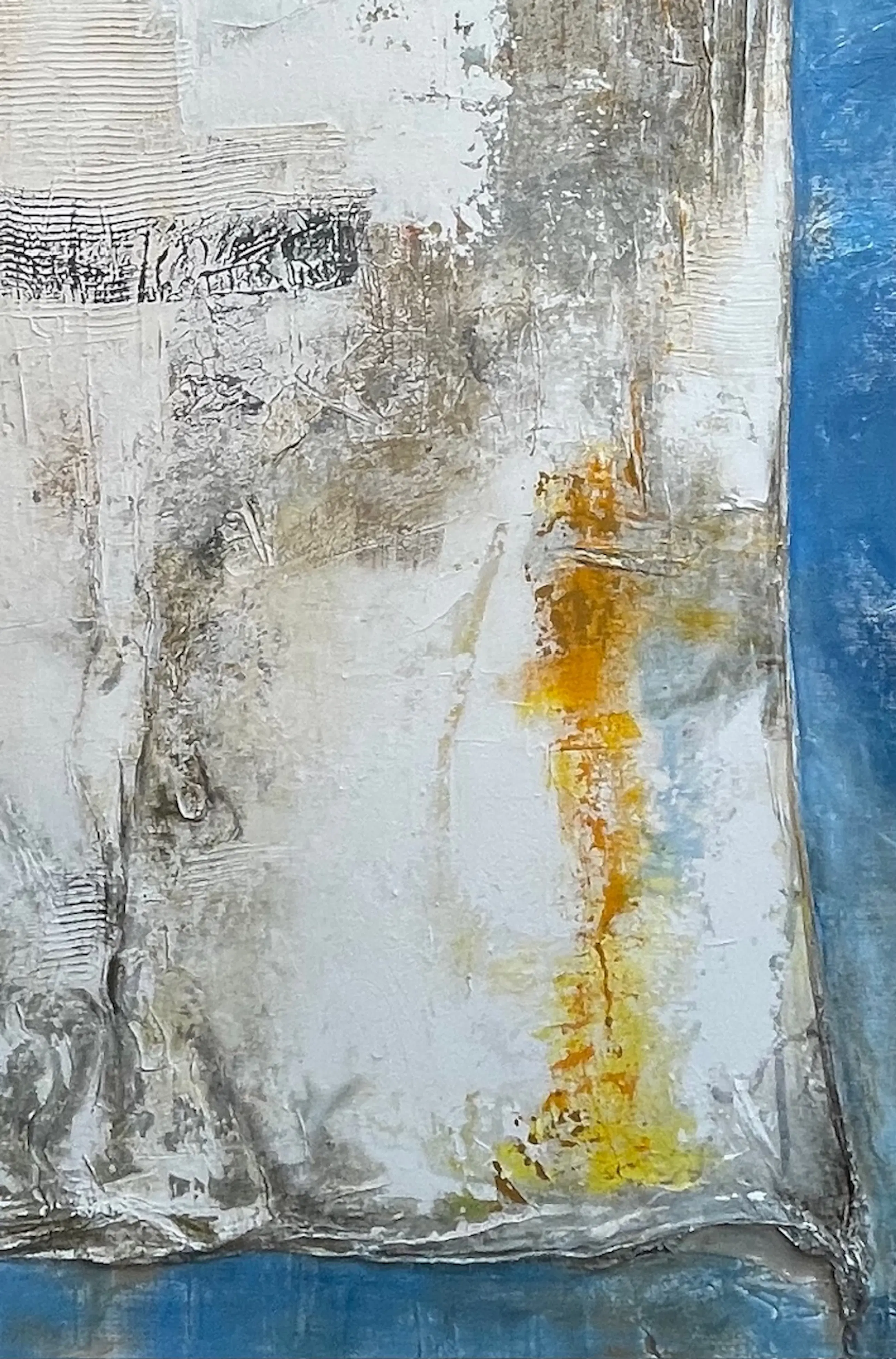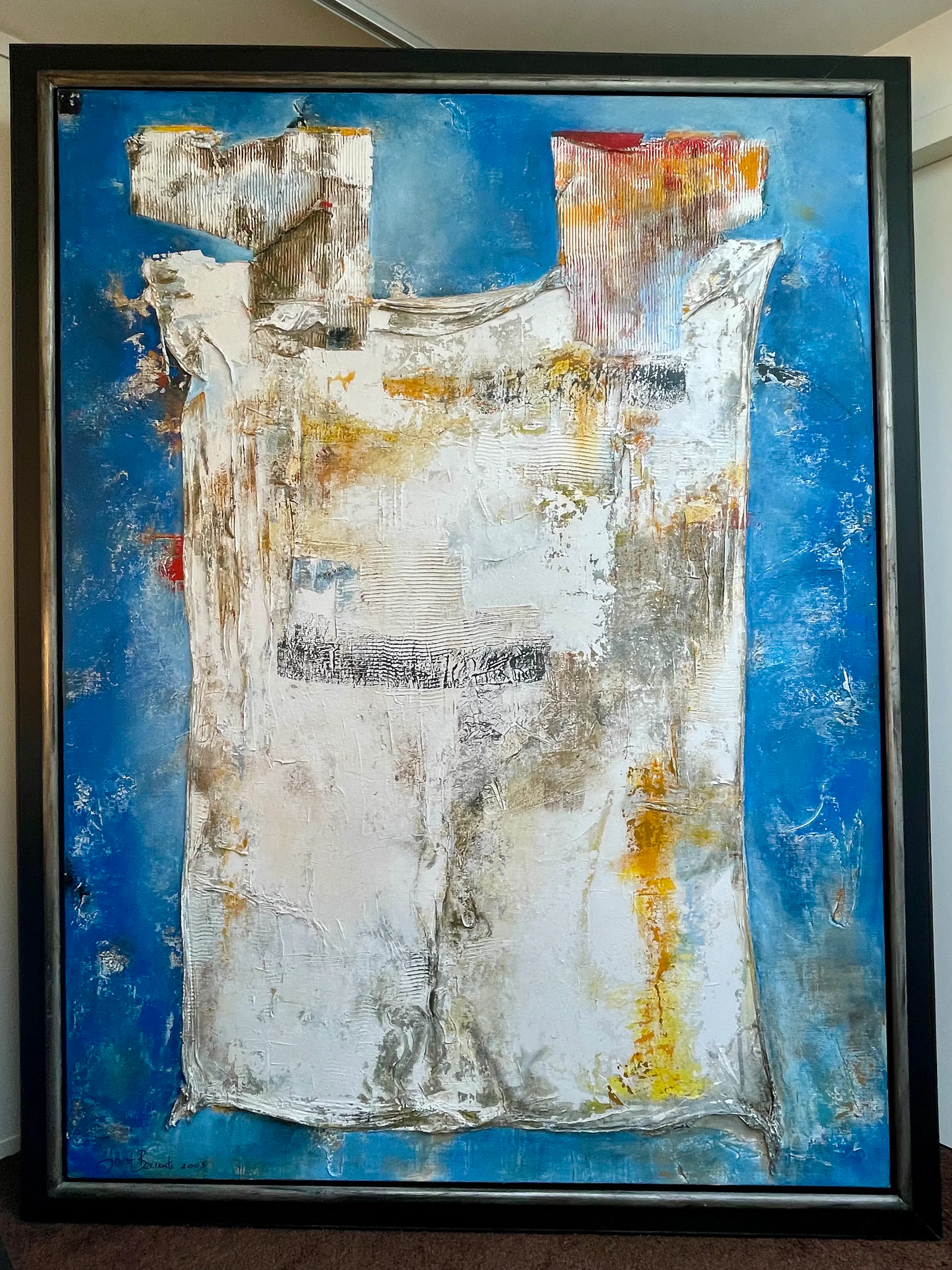 Mooi schilderij van Joost Beerents met een aansprekende blauwe kleur waar je vrolijk van wordt. In de olieverf is op sommige plaatsen textiel en karton verwerkt waardoor het werk wat reliëf krijgt.