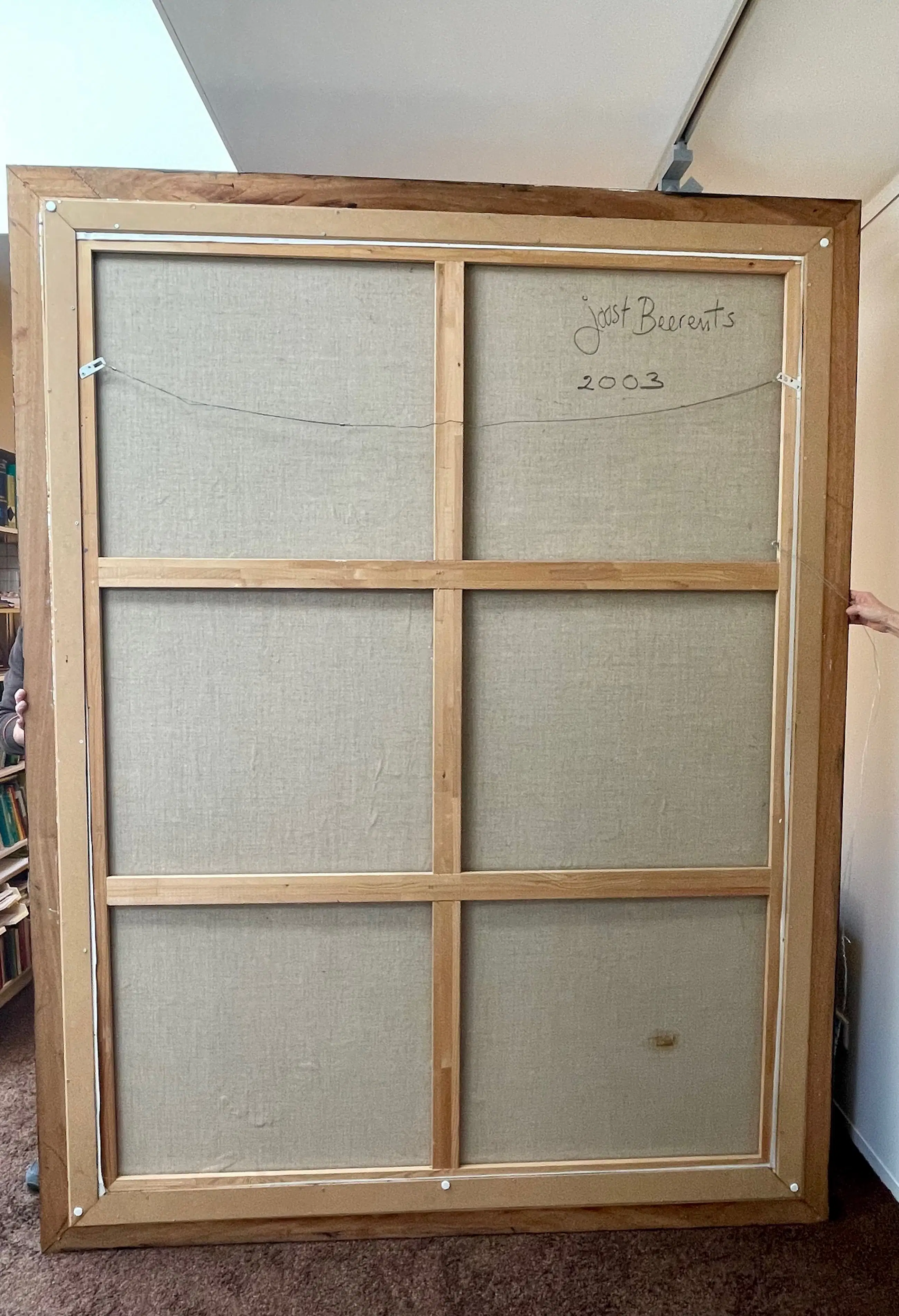 Het houten frame van het schilderij is een tikje scheef getrokken.