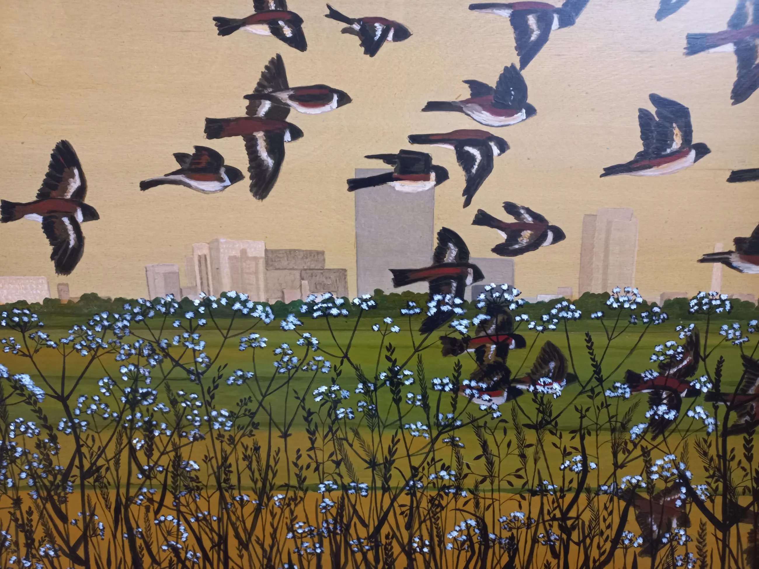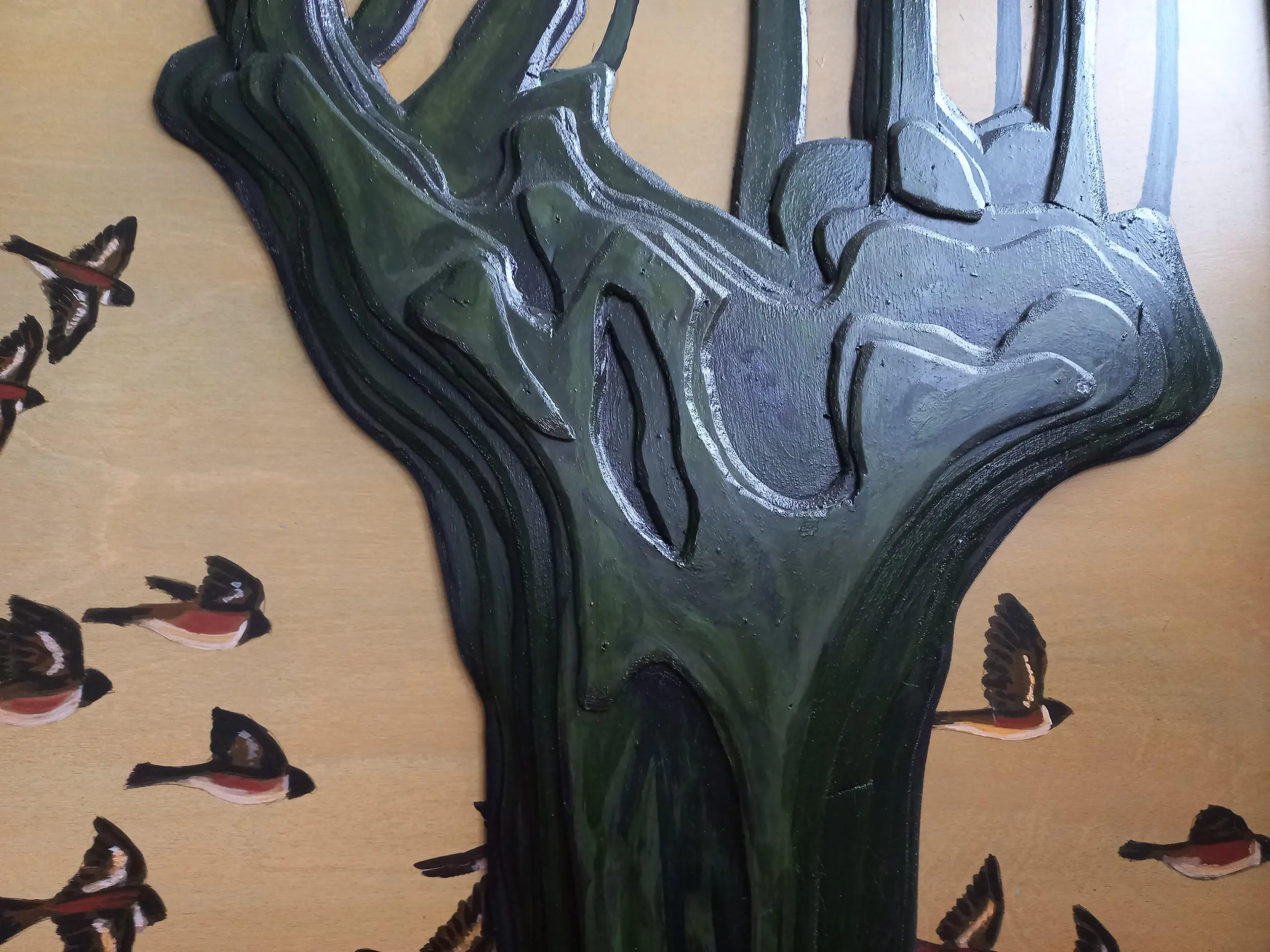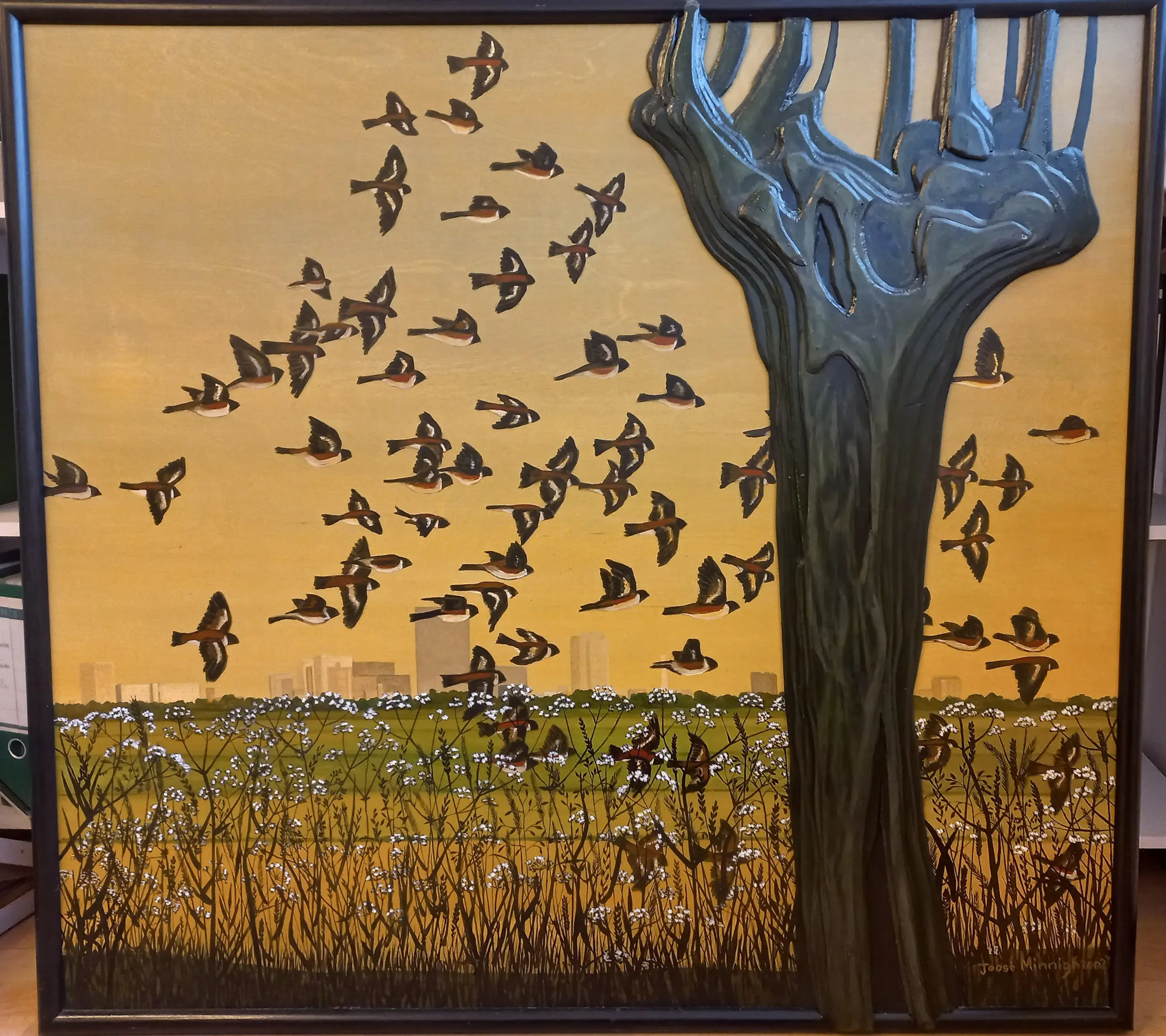 Acryl op paneel van beukenhout met (boom) reliëf van triplex
