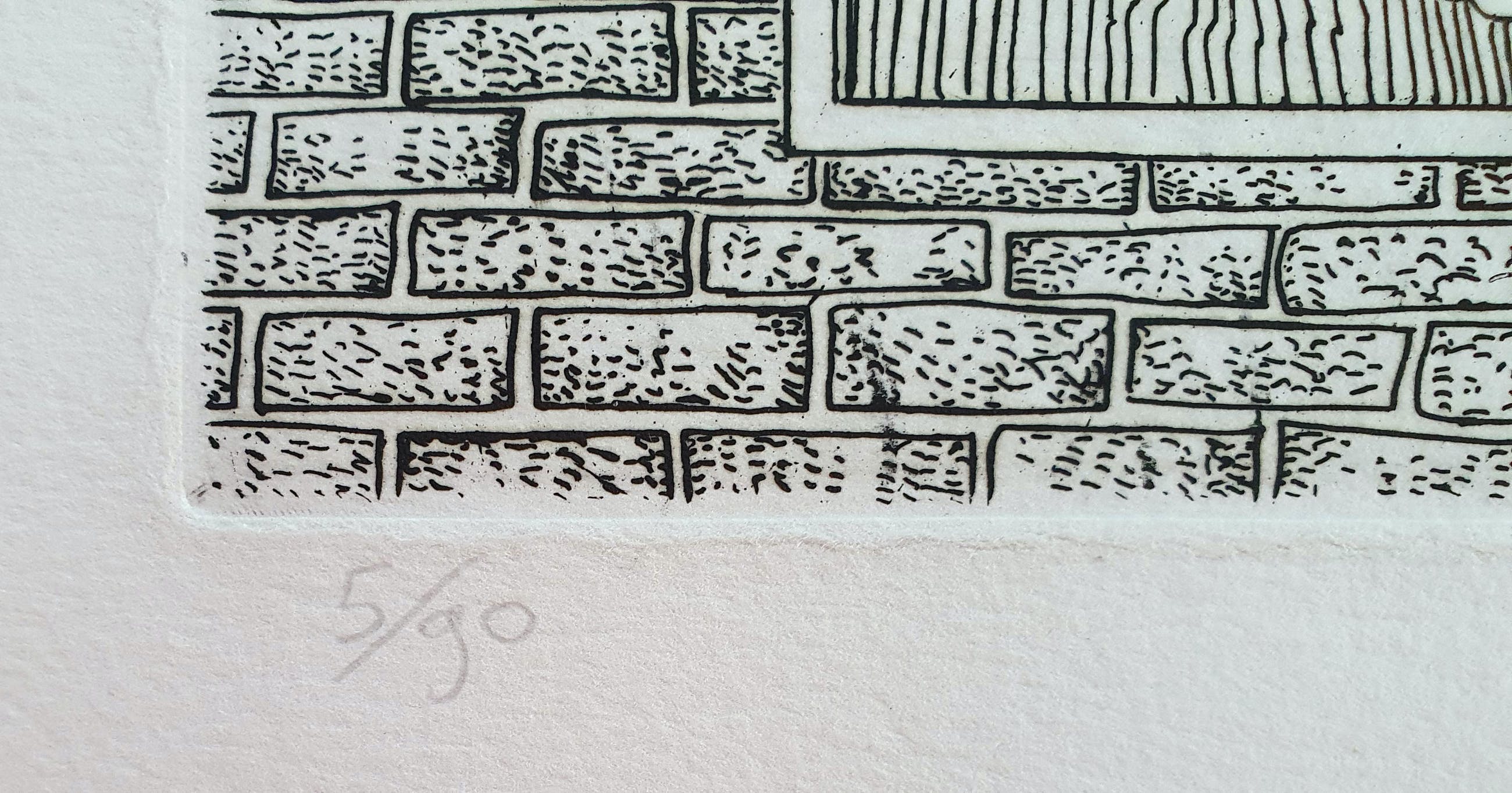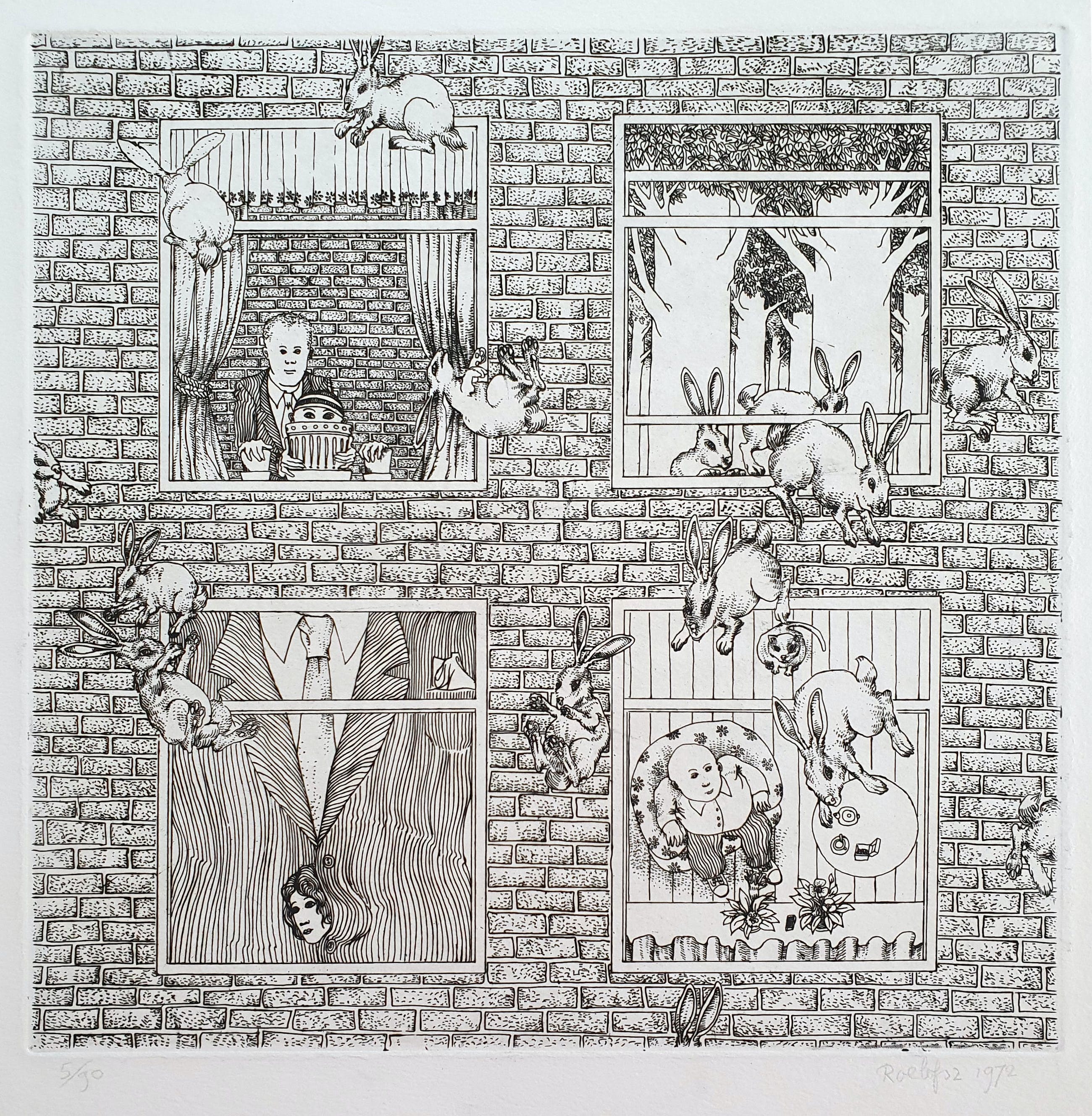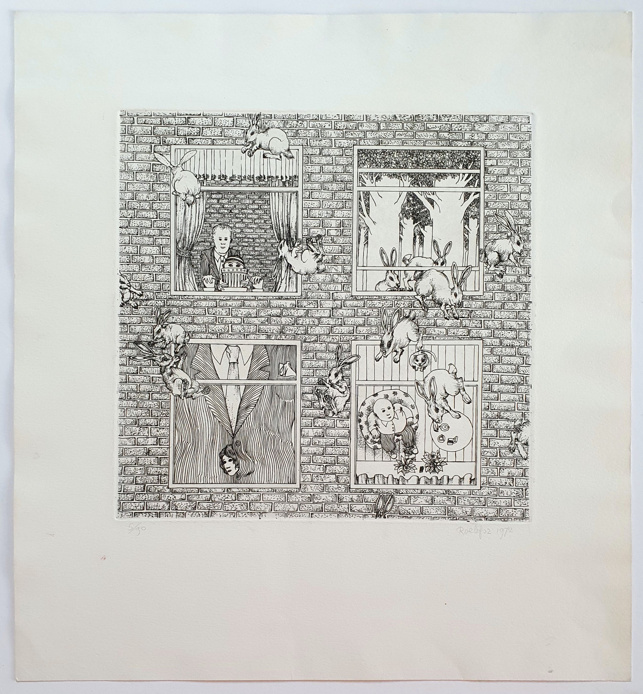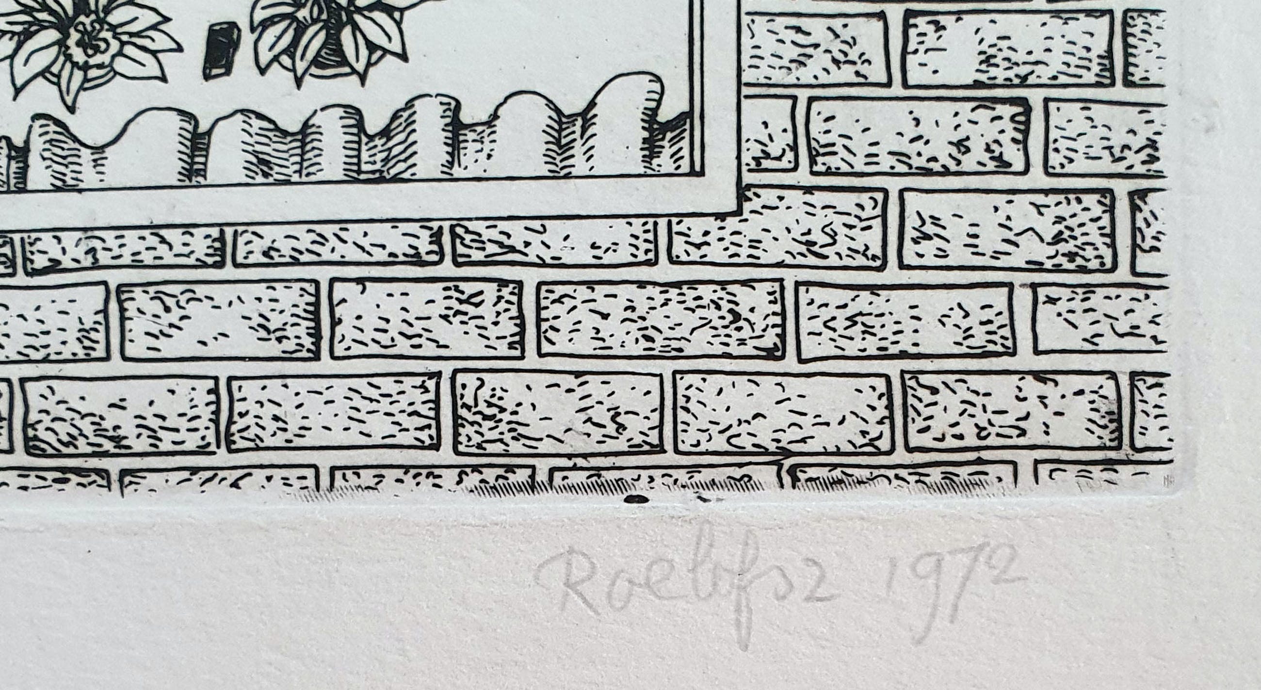 Fraaie ets van Joost Roelofsz, beeldmaat 31x31, bladmaat 50x46 Gesigneerd en gedateerd r.o. 'Roelofsz' en '1972'. Genummerd l.o. '5/90'