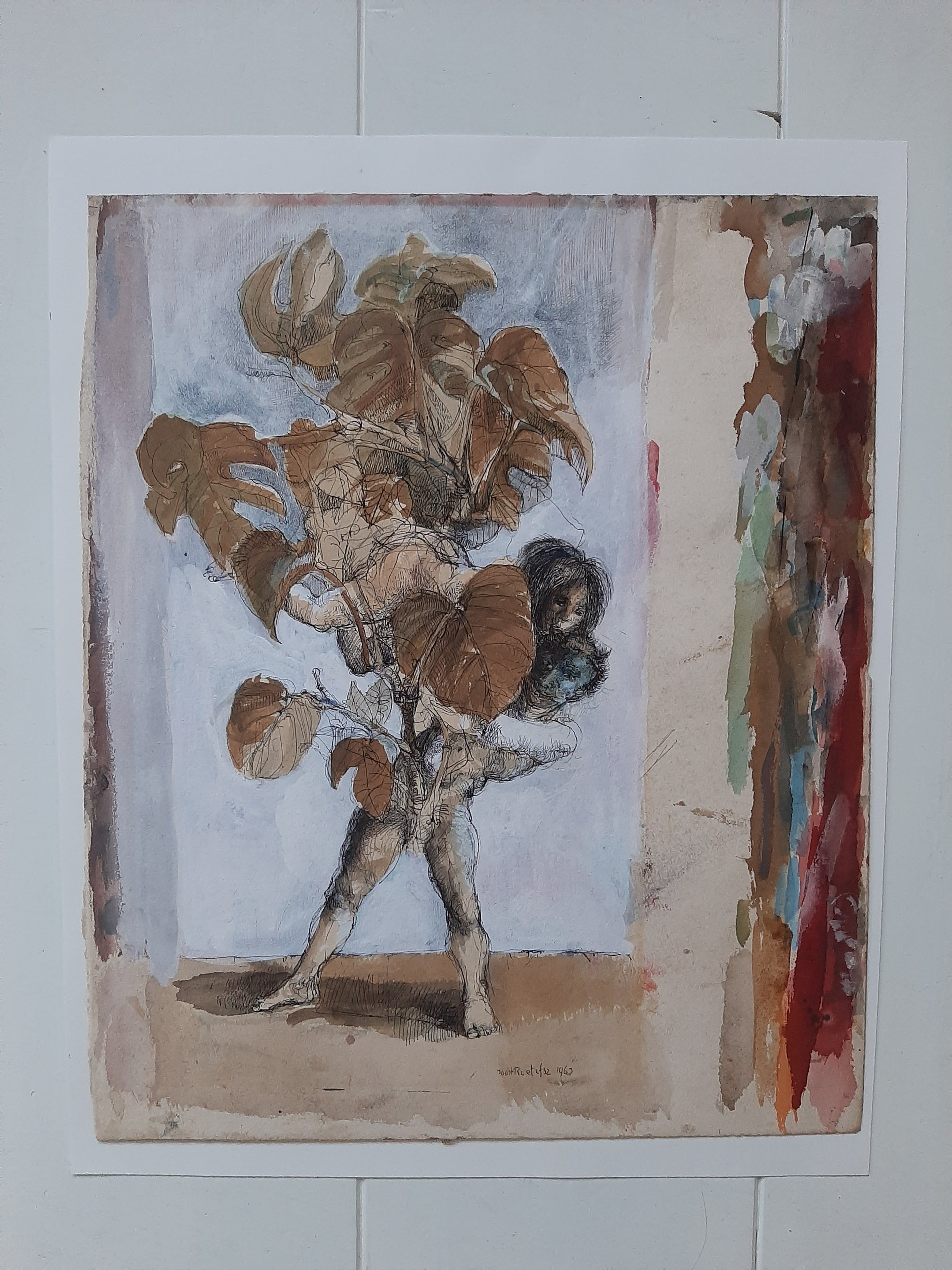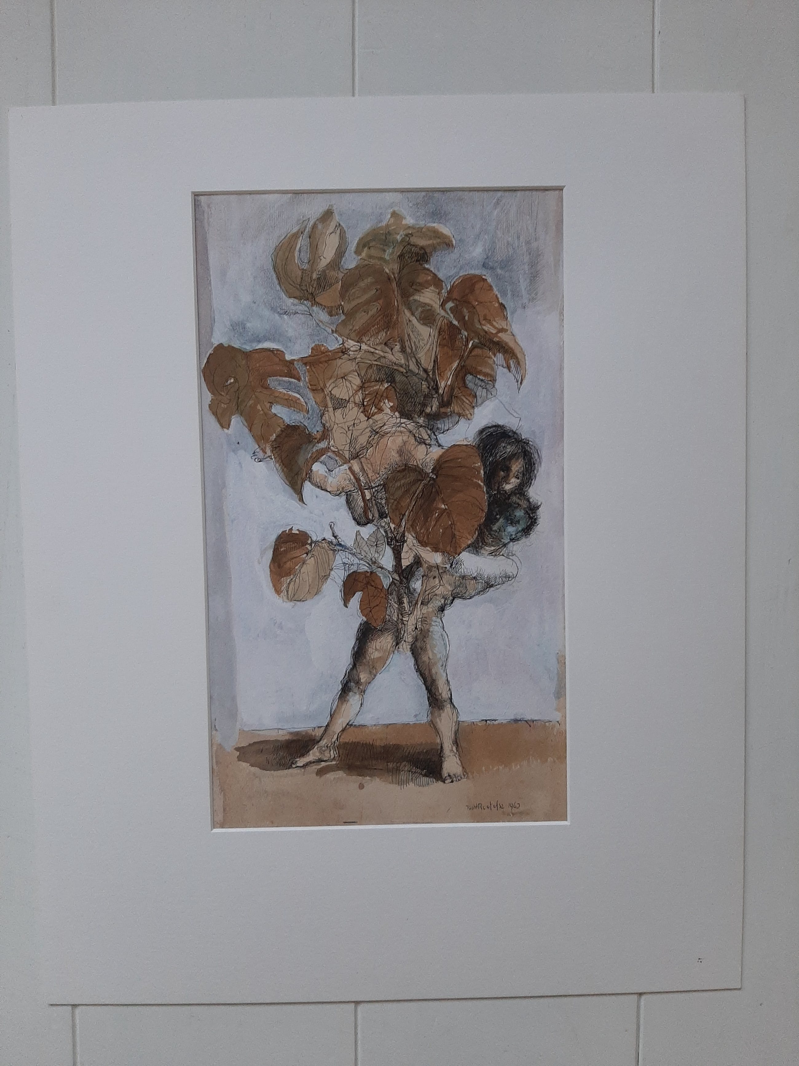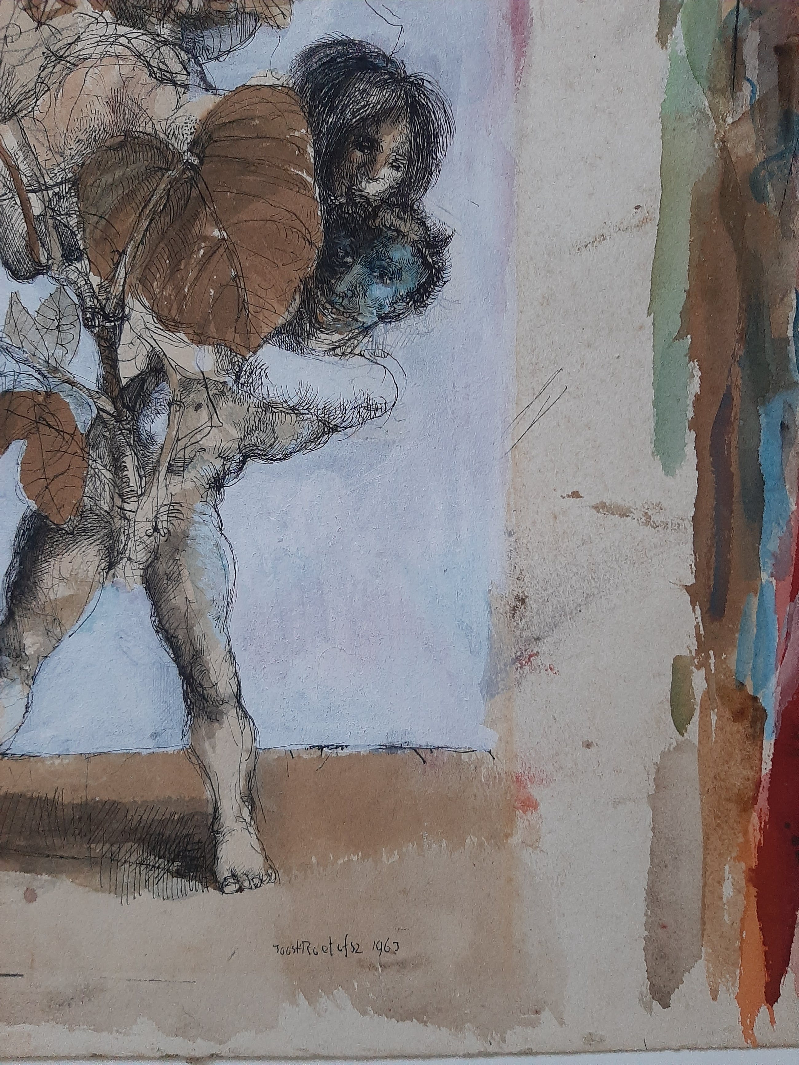 Tekening gemengde techniek. De tekening heeft een passepartout dat kleiner is dan het blad waarop Roelofsz aan de zijkant kleurproeven heeft gemaakt. Het tekenvel meet 37 x 31 cm. De tekening is door Roelofsz ingelijst voor een tentoonstelling in Utrecht.