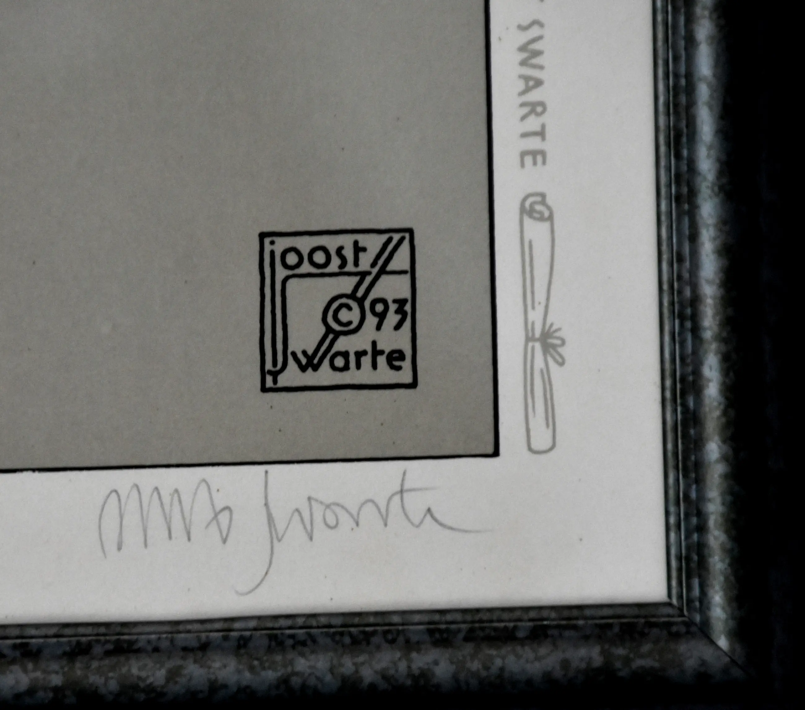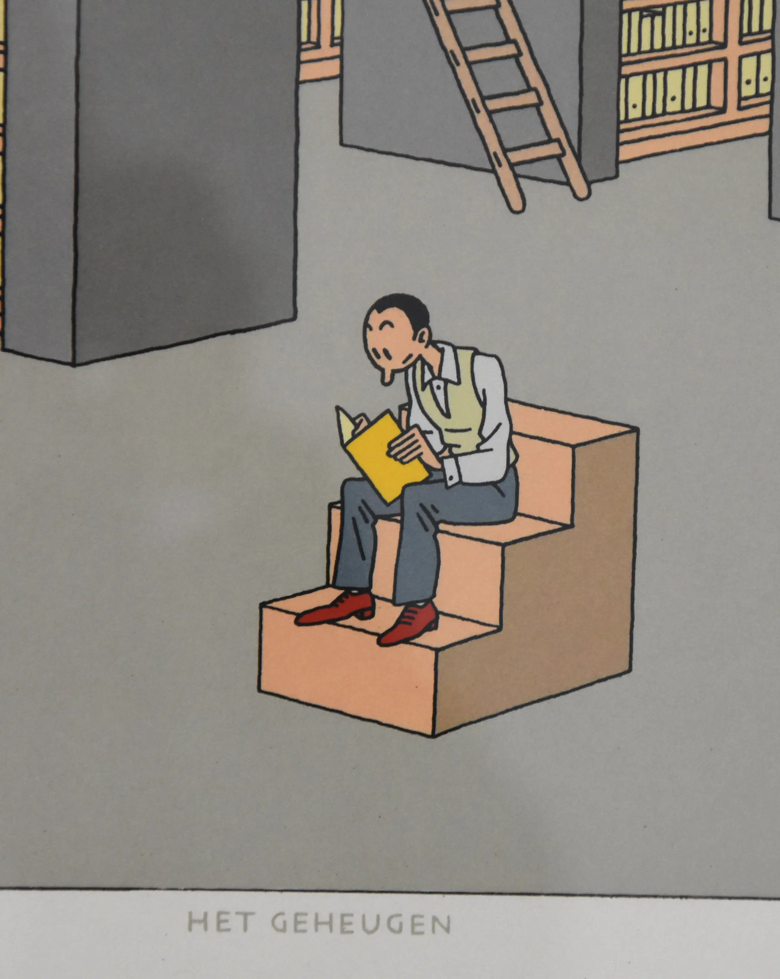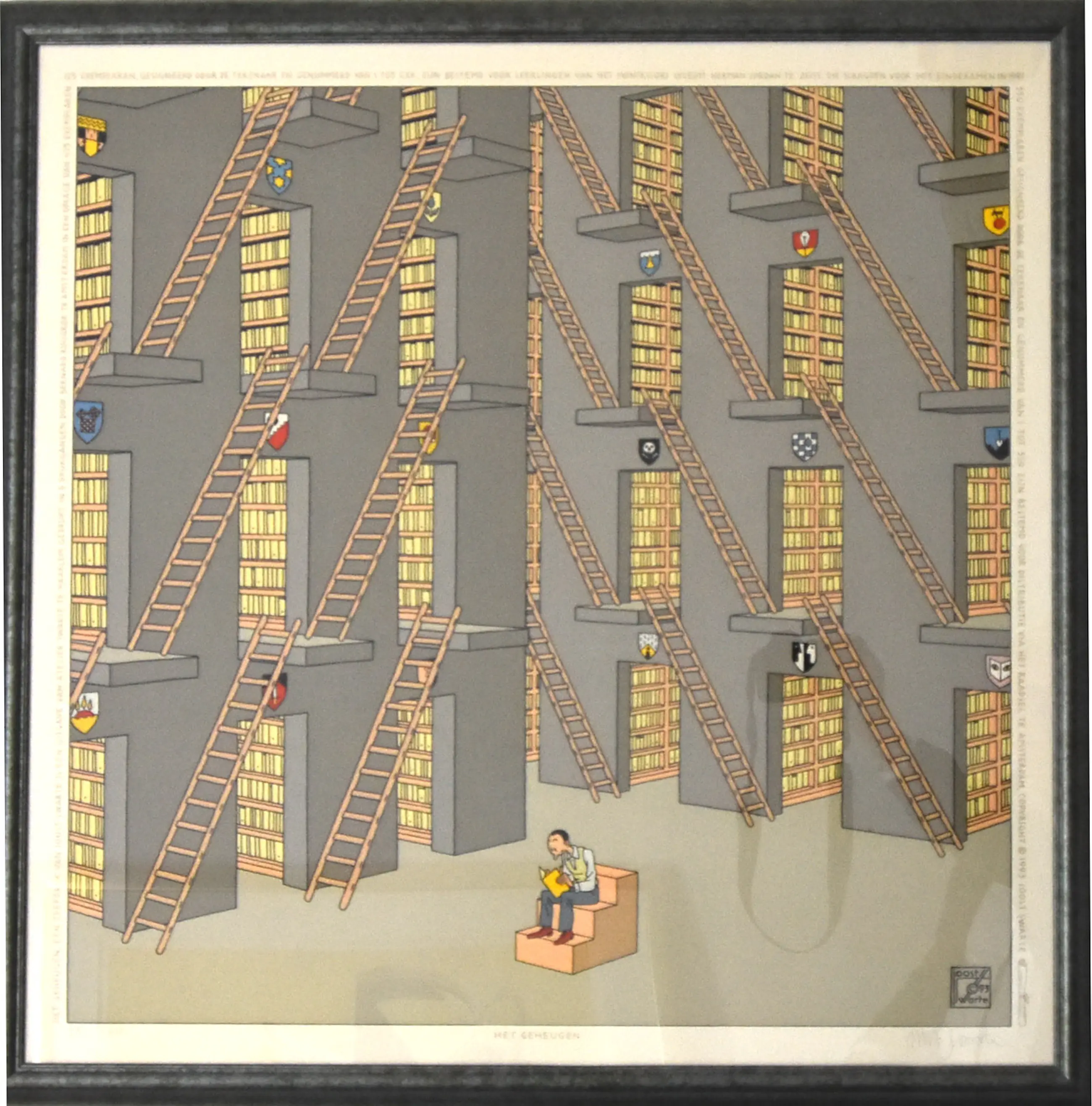 Zeefdruk van Joost Swarte in de Klare Lijn, uitgegeven door Atelier Joost Swarte te Haarlem. Gedrukt door Bernard Ruigrok te Amsterdam in 9 drukgangen in een oplage van 475 exemplaren, waarvan 125 exemplaren bestemd voor leerlingen van het Montessori Lyceum Herman Jordan te Zeist die slaagden voor het eindexamen in 1993, genummerd 1 - CXX en 350 exemplaren bestemd voor verkoop door uitgeverij Het Raadsel, genummerd 1 - 350. Dit exemplaar is L.O. met potlood genummerd 25/350 en R.O. gesigneerd in potlood gesigneerd door Joost Swarte. Ingelijst achter glas in zware metalen lijst, kleur (donker) groen metallic.