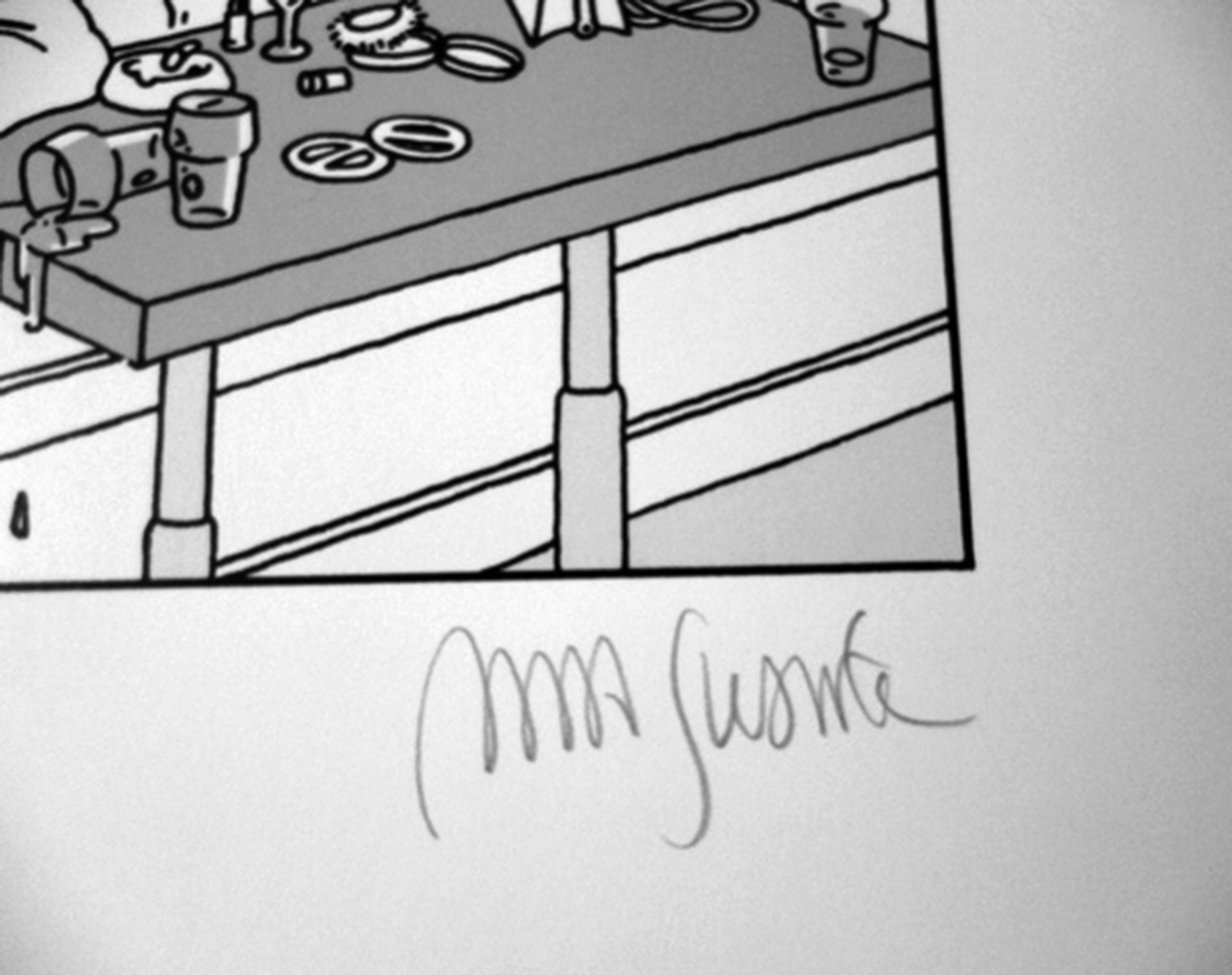 Zeefdruk, met potlood gesigneerd rechtsonder. In de afbeelding gemerkt Joost Swarte 77 linksonder.