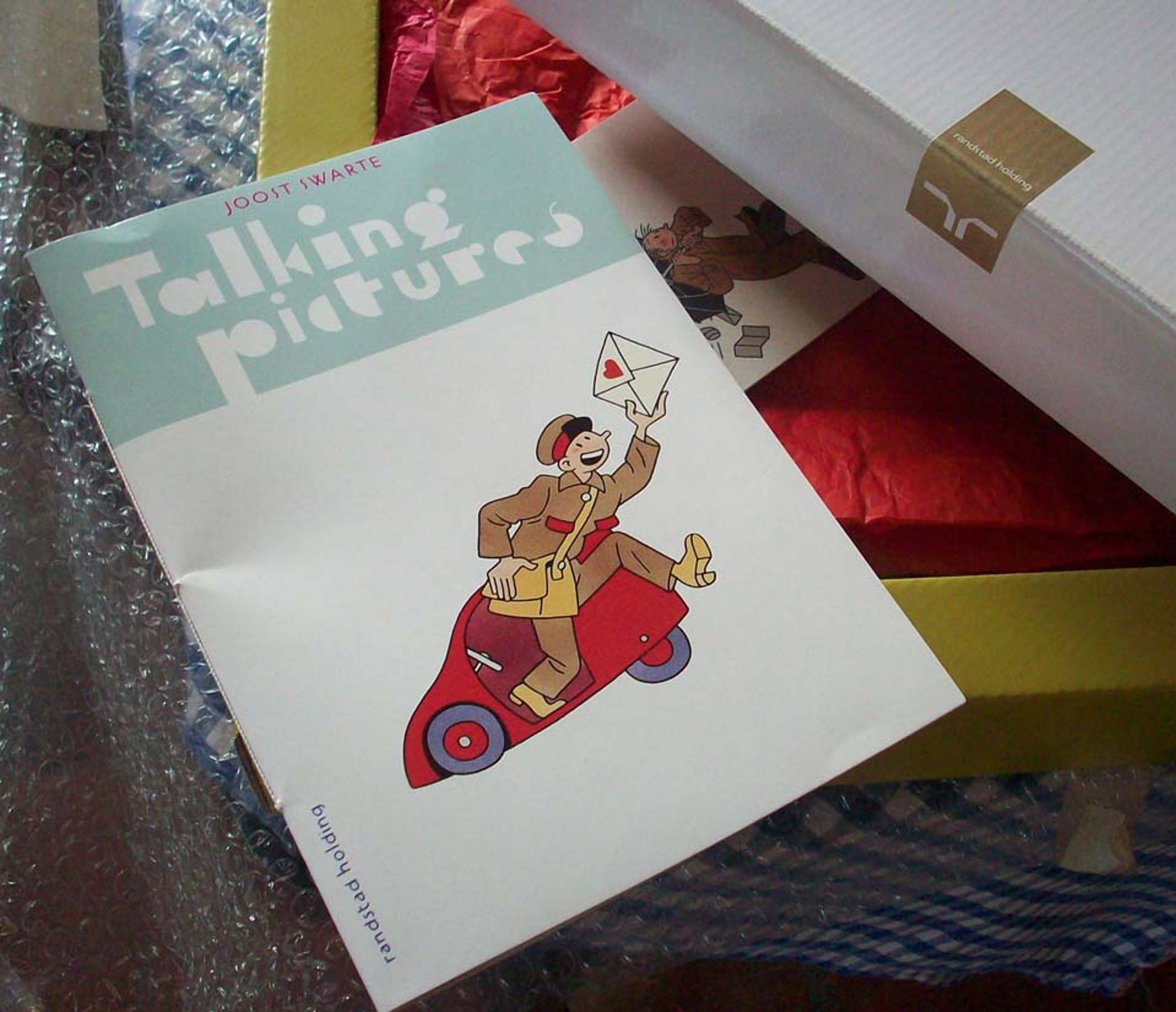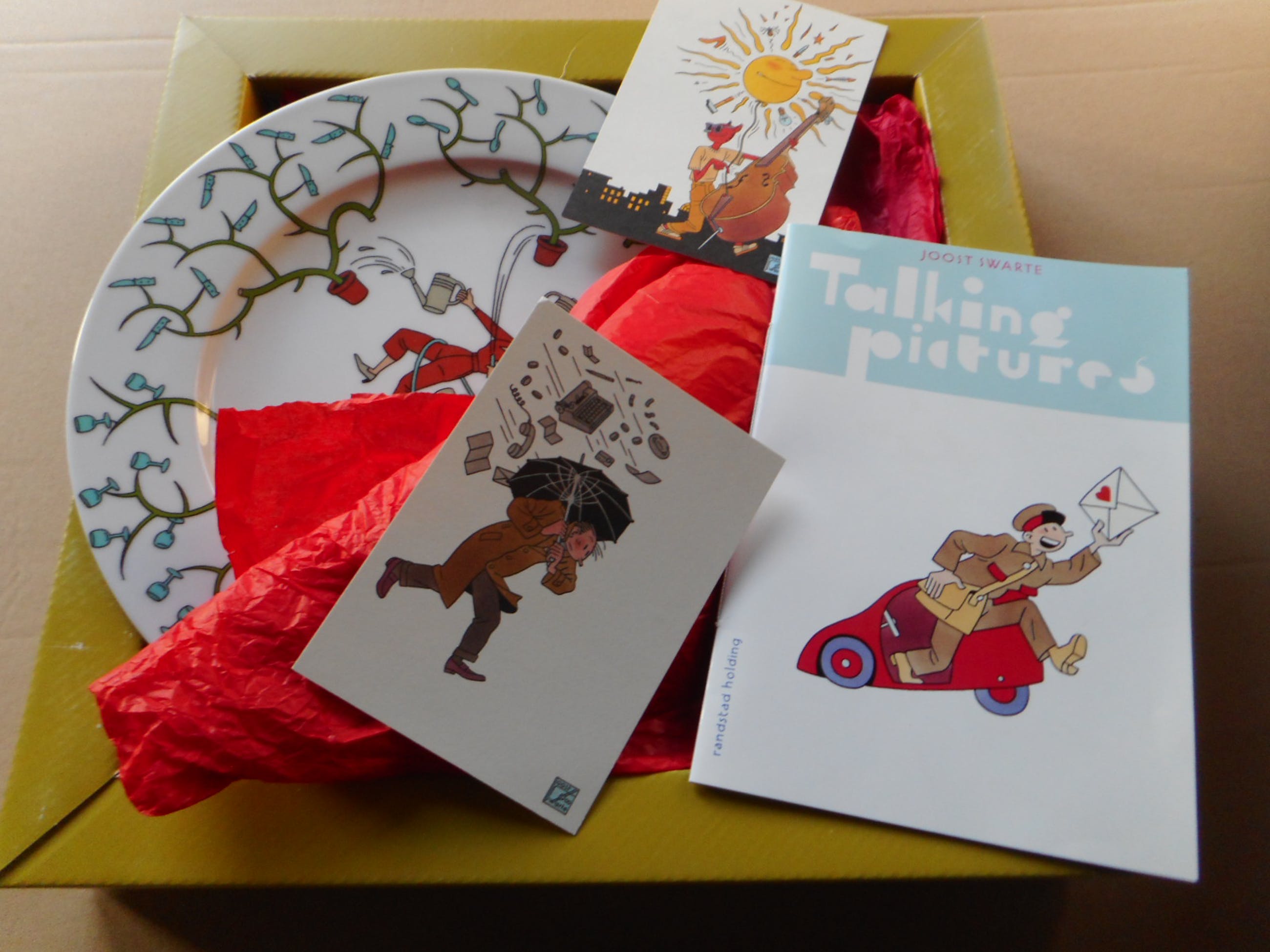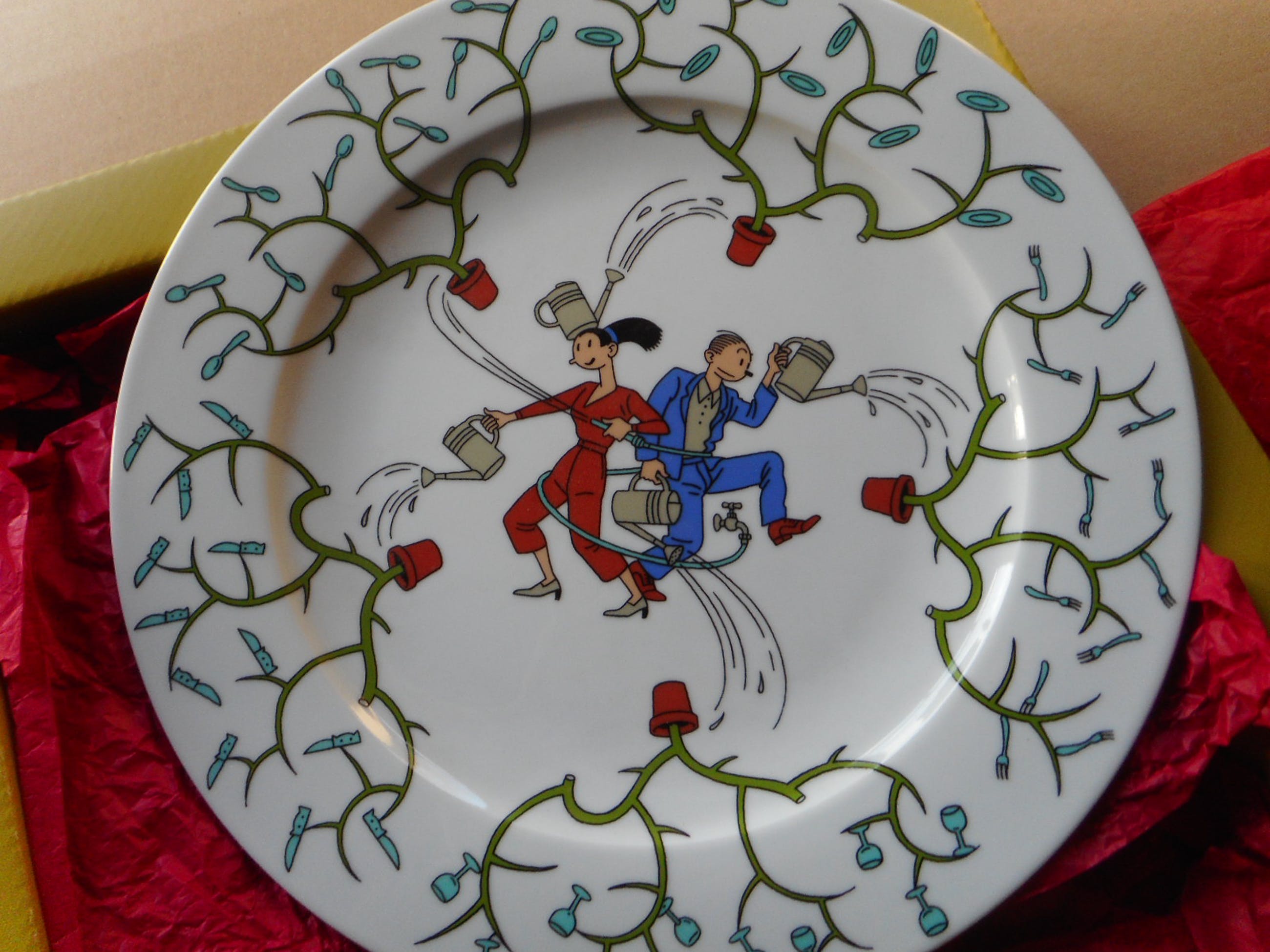 Prachtig bord ( diameter 30 cm ) ontworpen en gemaakt door JOOST SWARTE in opdracht van RANDSTAD HOLDING t.b.v. het stafpersoneel , incl. gave box , boekje TALKING PICTURES , 2 bijhorende ansichtkaarten.