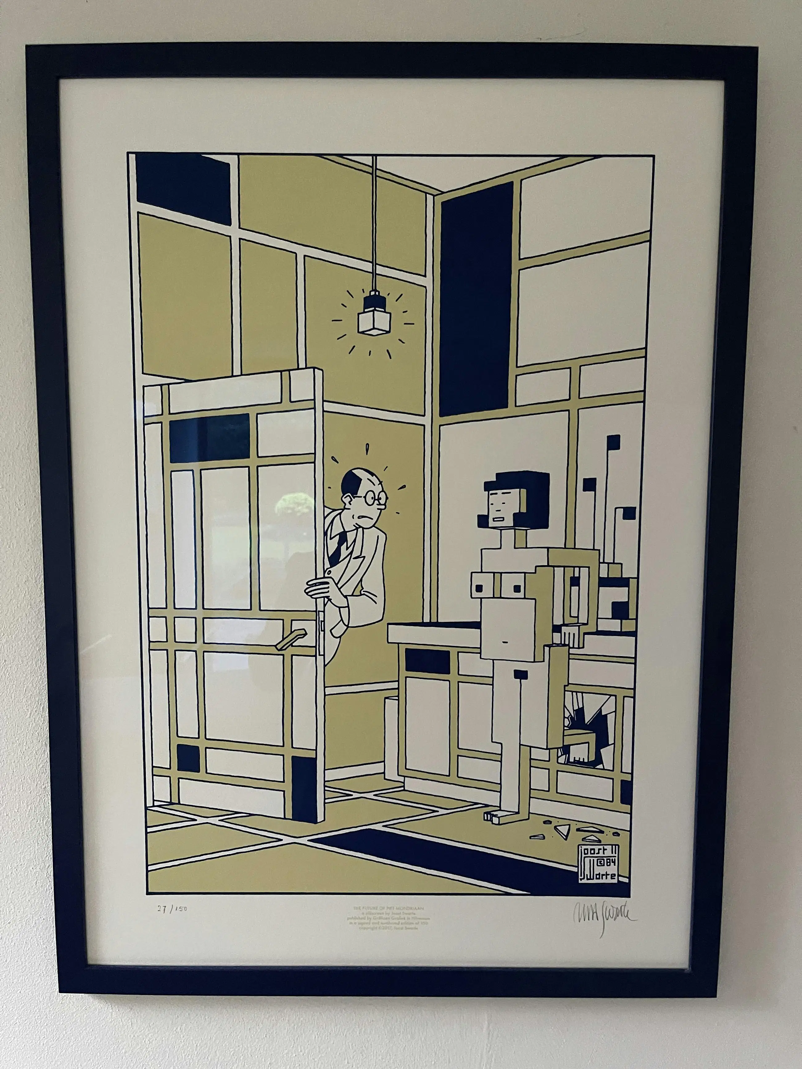 Zeldzame zeefdruk van Joost Swarte, getiteld "The Future of Piet Mondriaan". Deze zeefdruk uit 2017 is gesigneerd en genummerd 27/150. De oplage is beperkt tot 150 exemplaren. De afmetingen van de zeefdruk zijn 70 x 50 cm. Het werk is professioneel ingelijst met ontspiegeld en UV-werend museumglas Artglass AR 92, de afmetingen inclusief lijst zijn 71 x 51 cm.