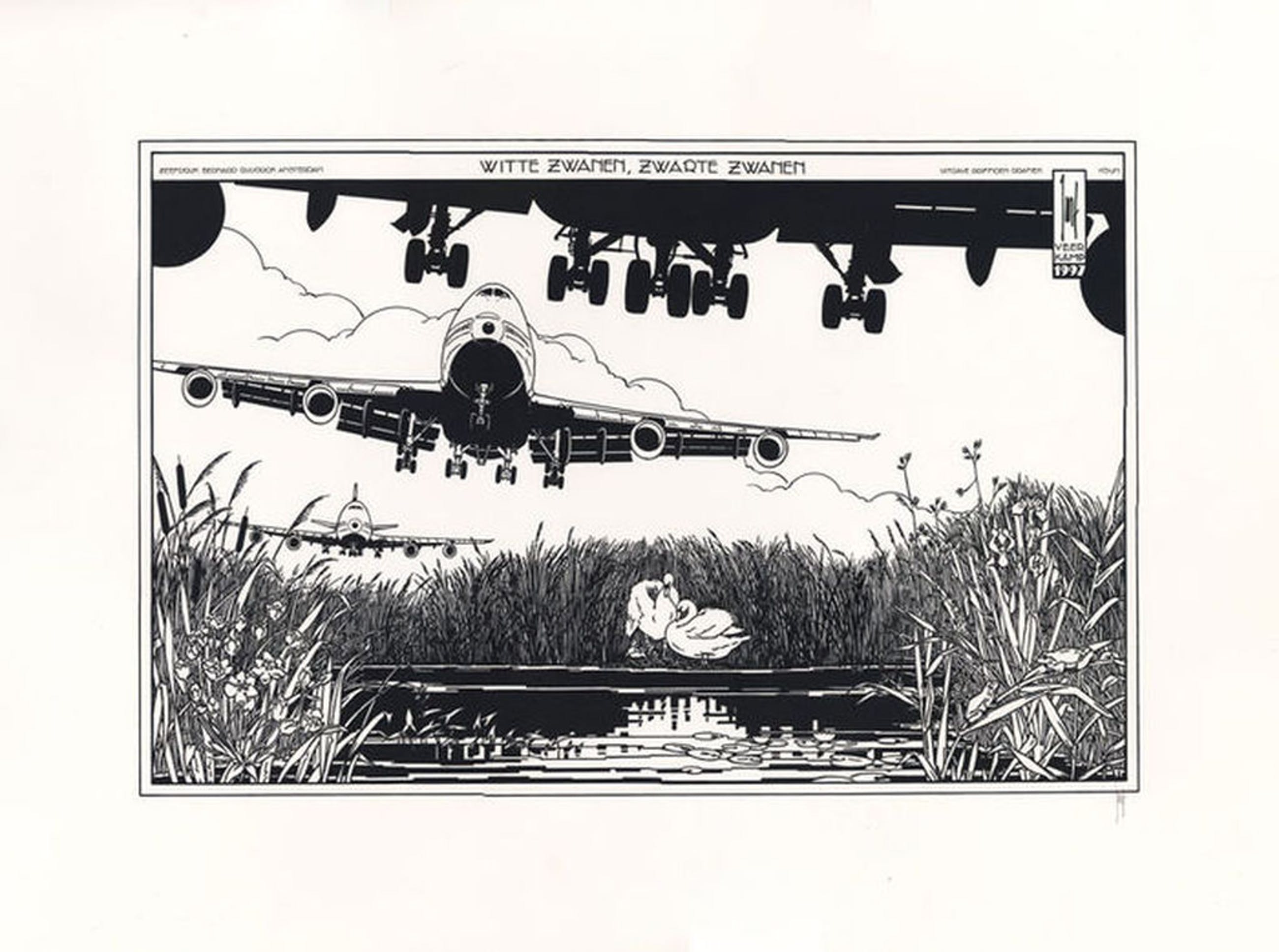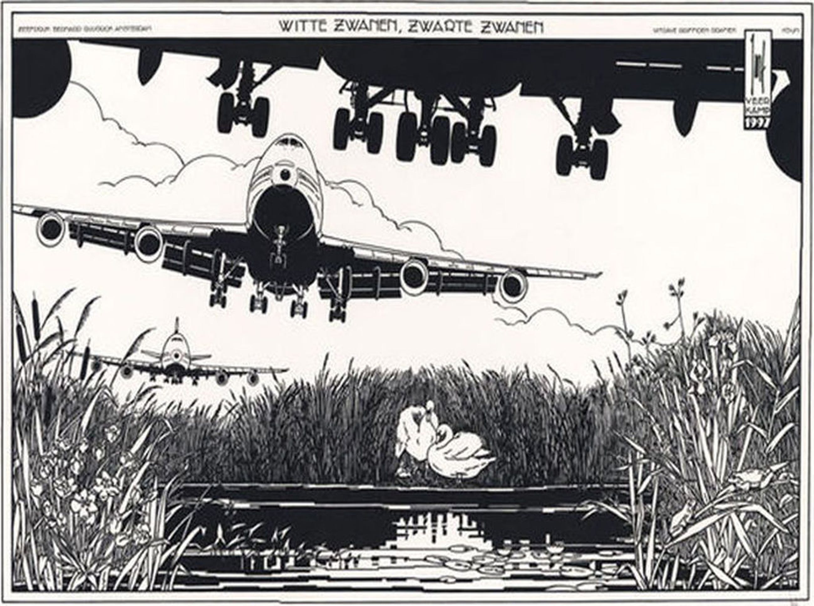 Gemaakt als protest tegen de toenmalige KLM - reclame waarin vliegtuigen als zwanen werden afgebeeld