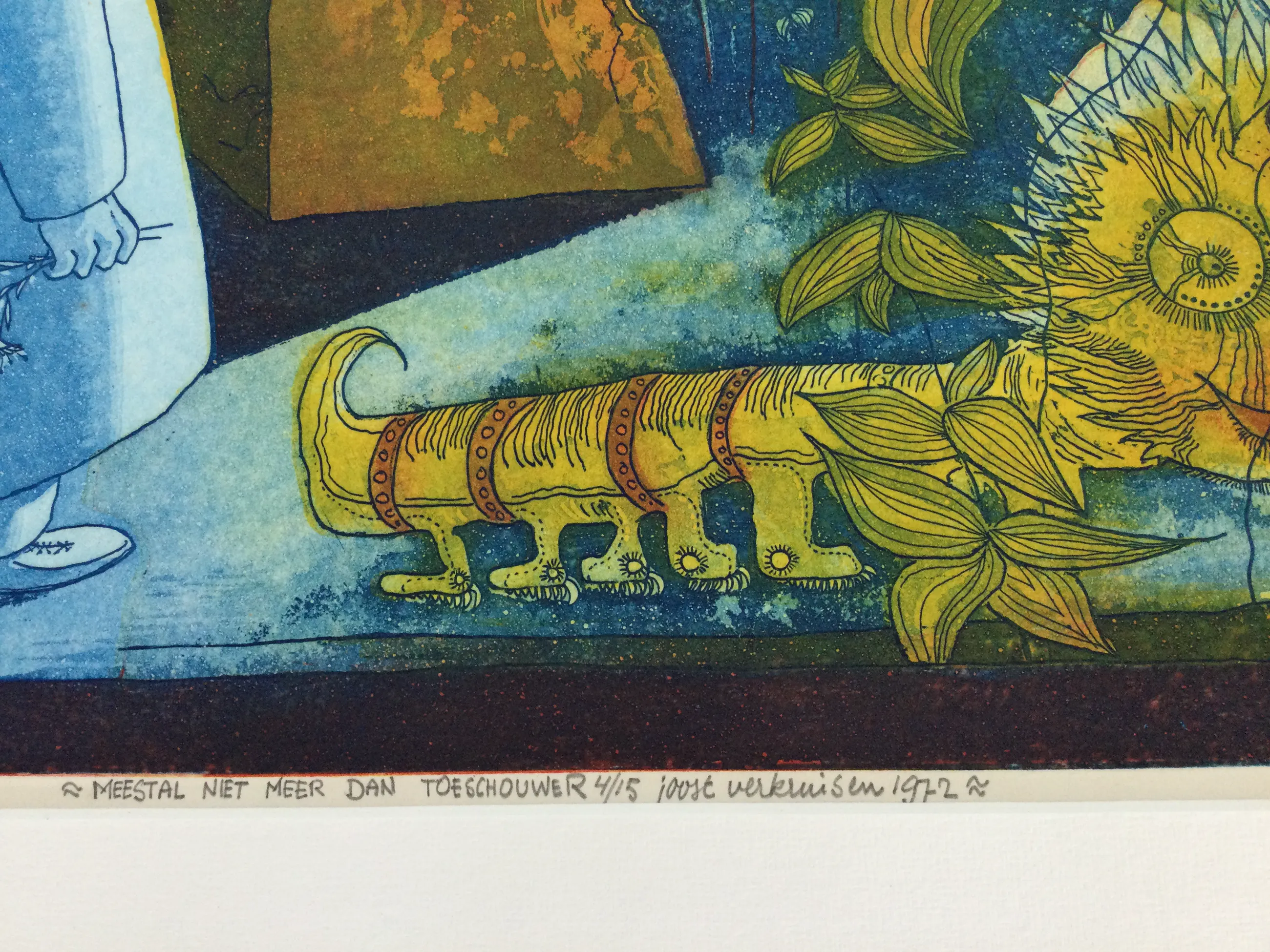 Grafiek van Joost Verkruisen in passepartout van 64,5 x 85. De kleuren zijn heel helder, in het creme gedeelte links boven van de plaat bevinden zich enkele kleine ouderdomsvlekjes.