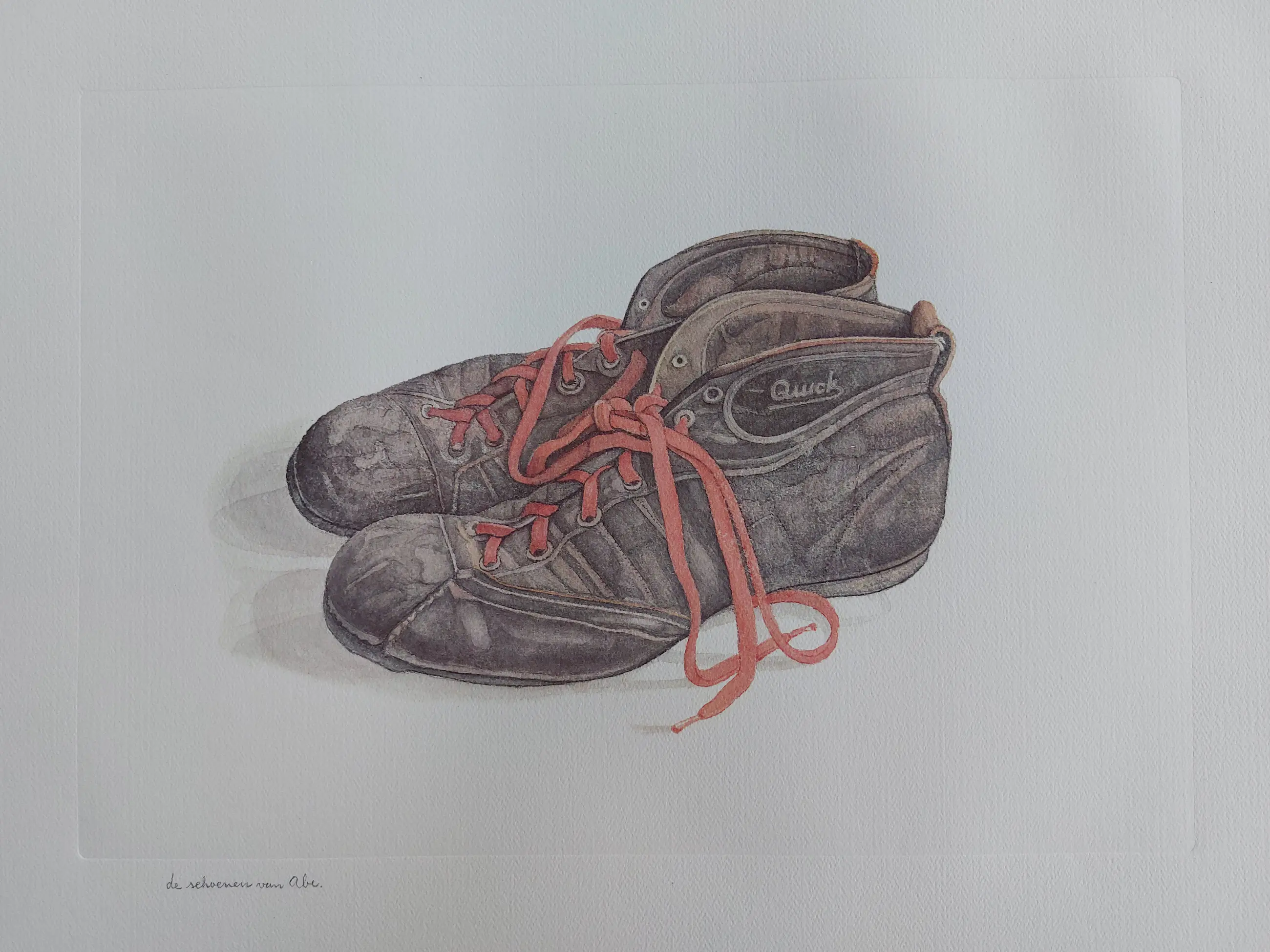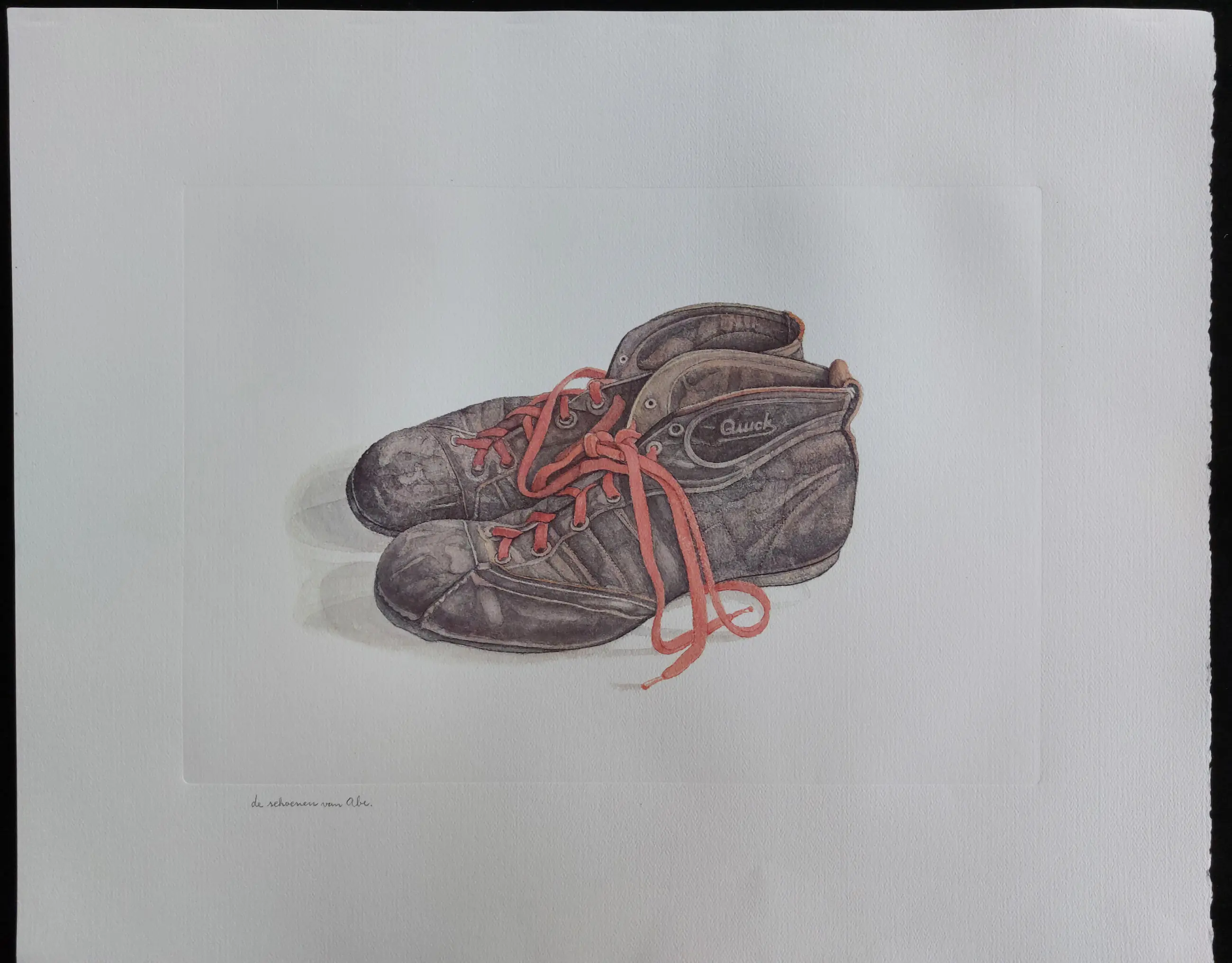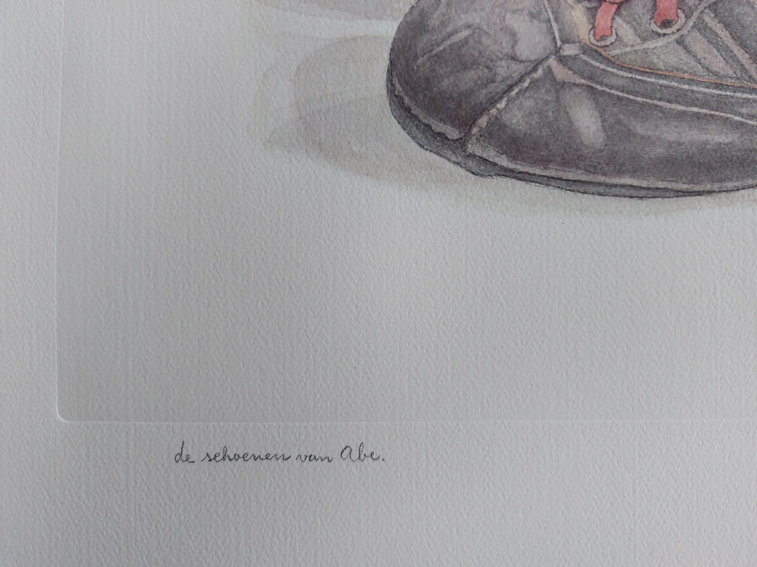 Grote lithografie van Jopie Huisman met afgebeeld de schoenen van Abe (Lenstra), de grootste Friese voetballer.