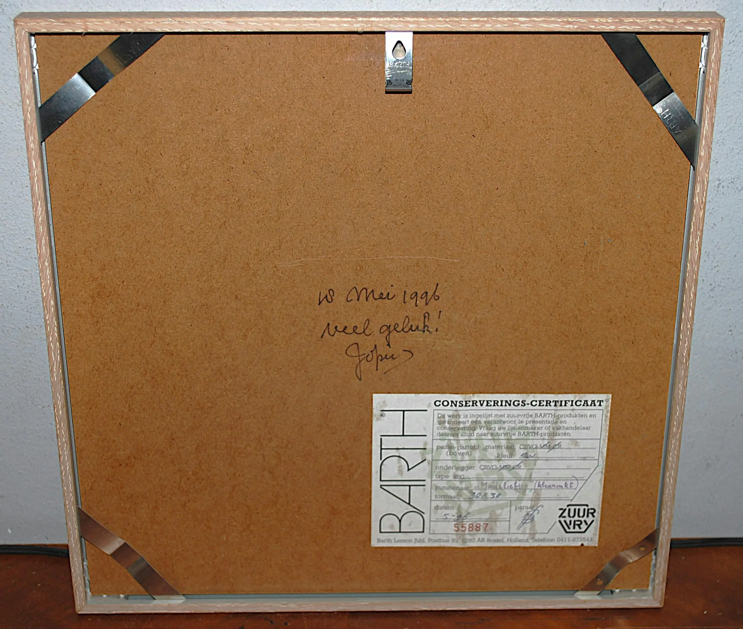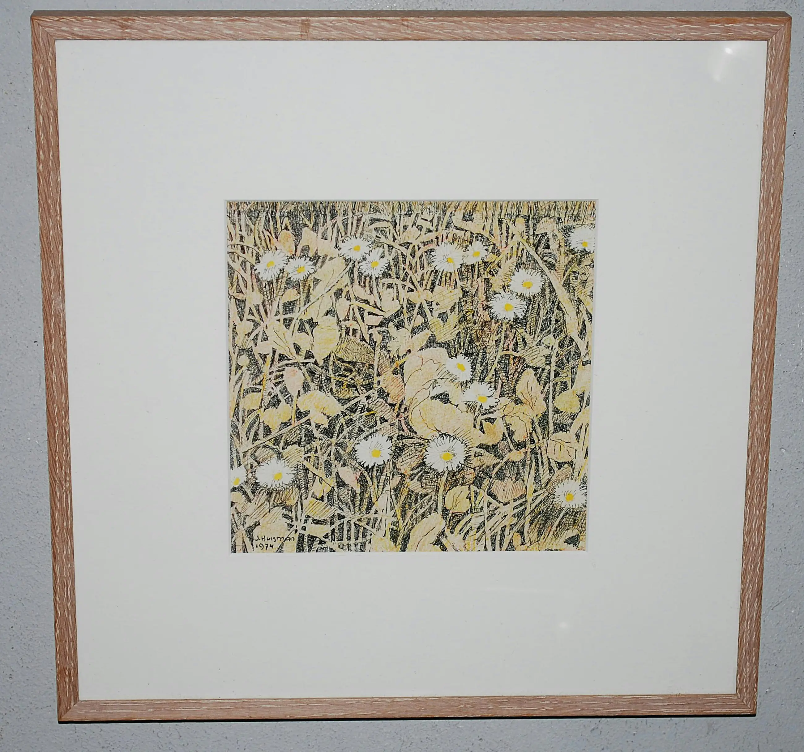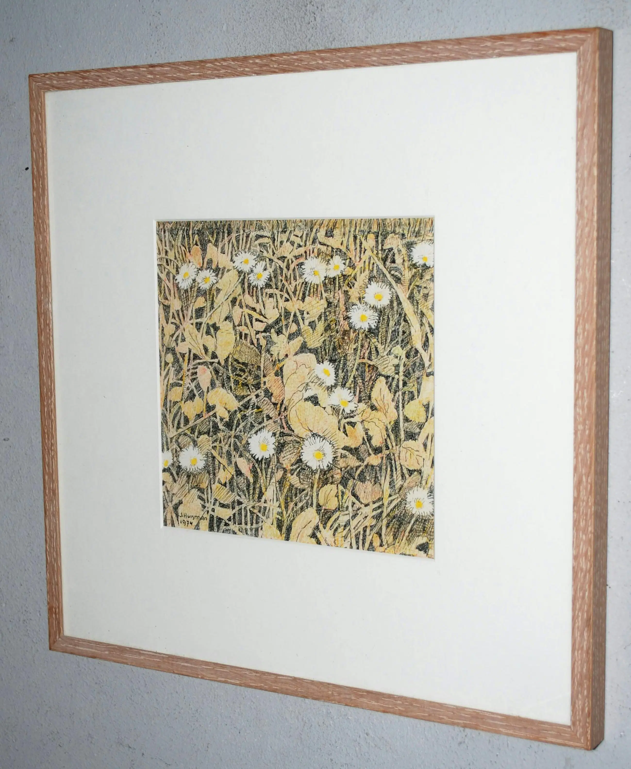 " Madeliefjes " . Bladmaat ca. 30x30 cm. Los geplaatst tussen zuurvrij karton/passepartout. Achter glas, in een fraaie houten Barth lijst. Gesigneerd aan de achterzijde. Het geheel verkeert in zeer goede staat! >>Extra het hardcover boek, met omslag, waar dit werk ook in staat vermeld, zie foto.