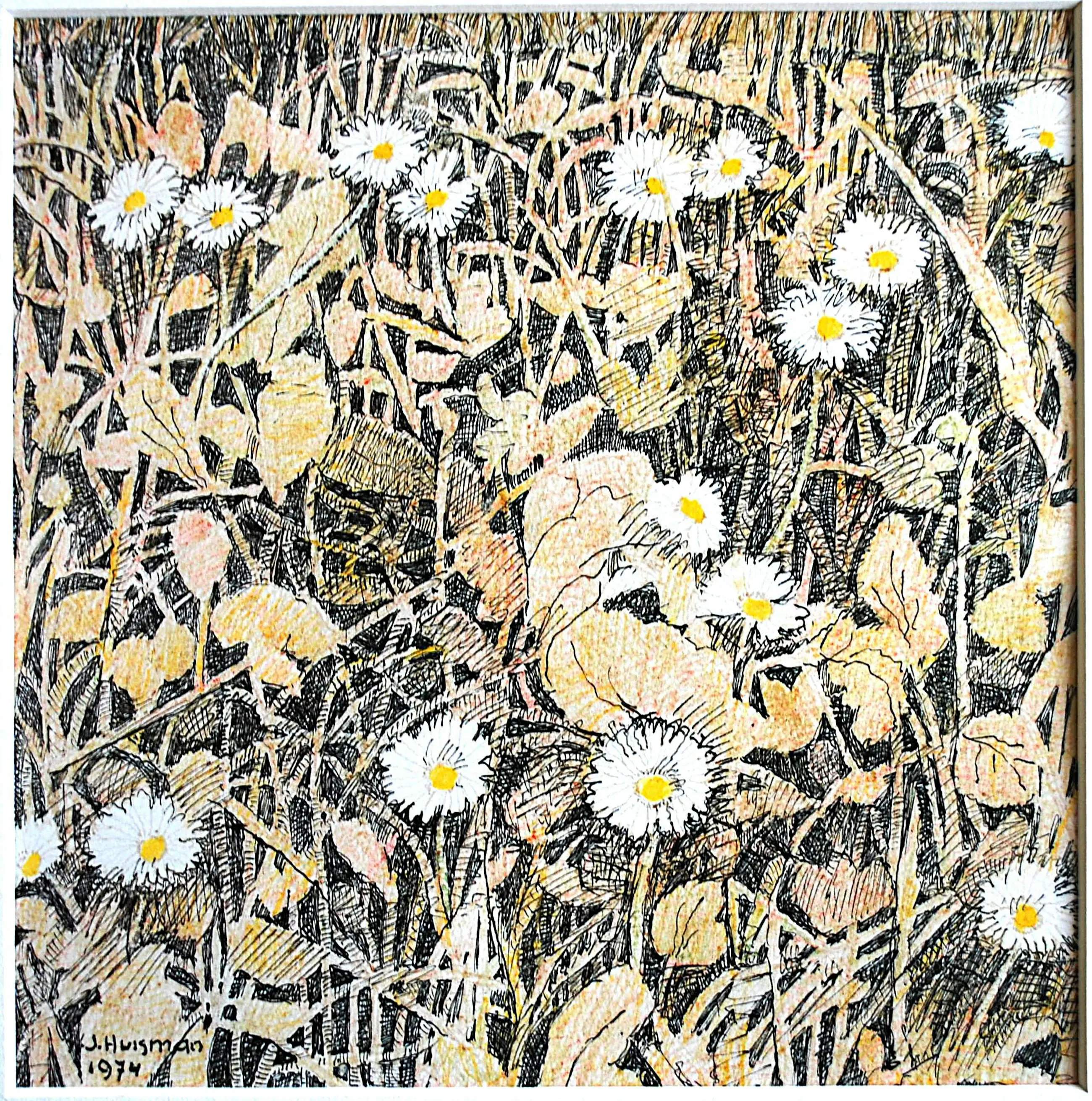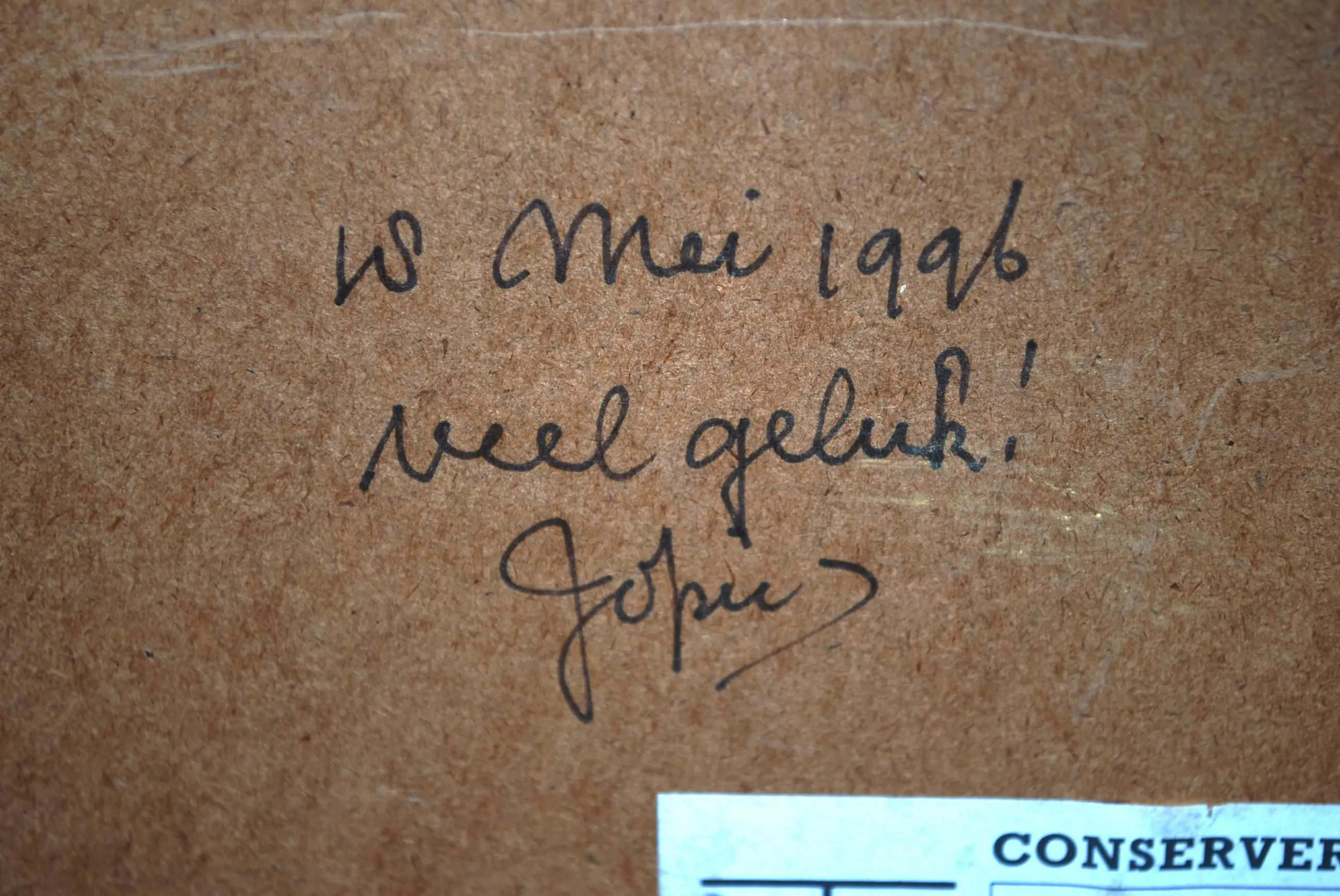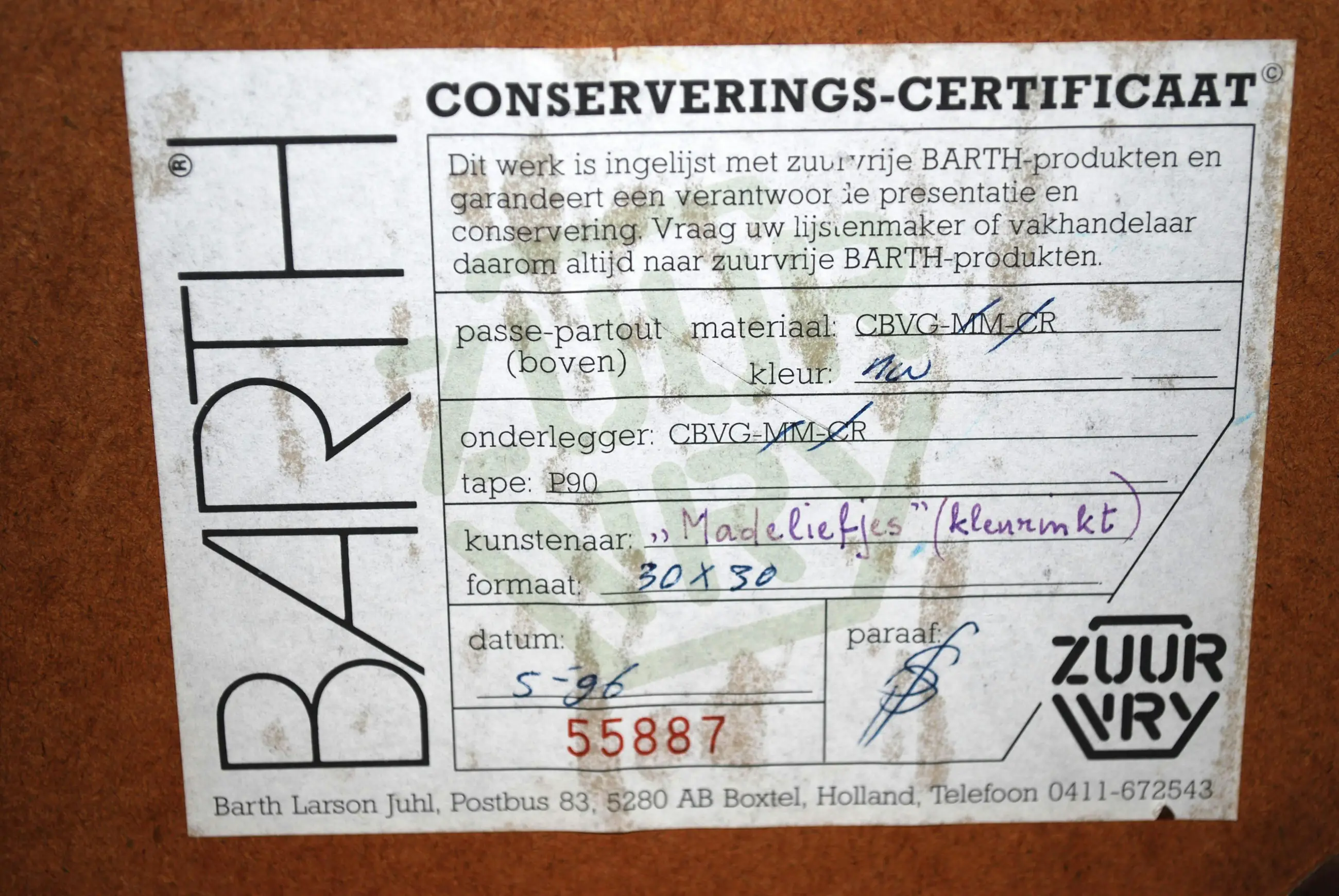 " Madeliefjes " . Bladmaat ca. 30x30 cm. Los geplaatst tussen zuurvrij karton/passepartout. Achter glas, in een fraaie houten Barth lijst. Gesigneerd aan de achterzijde. Het geheel verkeert in zeer goede staat! >>Extra het hardcover boek, met omslag, waar dit werk ook in staat vermeld, zie foto.
