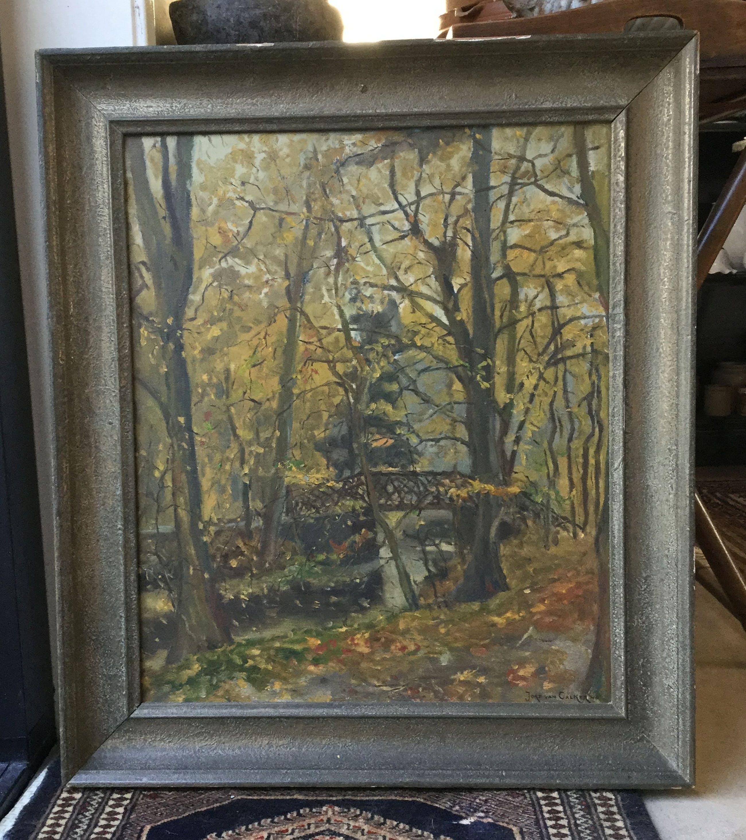 | Doek bevat oppervlaktevuil en verkleurde vernis door de tijd, doek is wat slap, de lijst bevat oppervlaktevuil en slijtschade door de tijd. | |