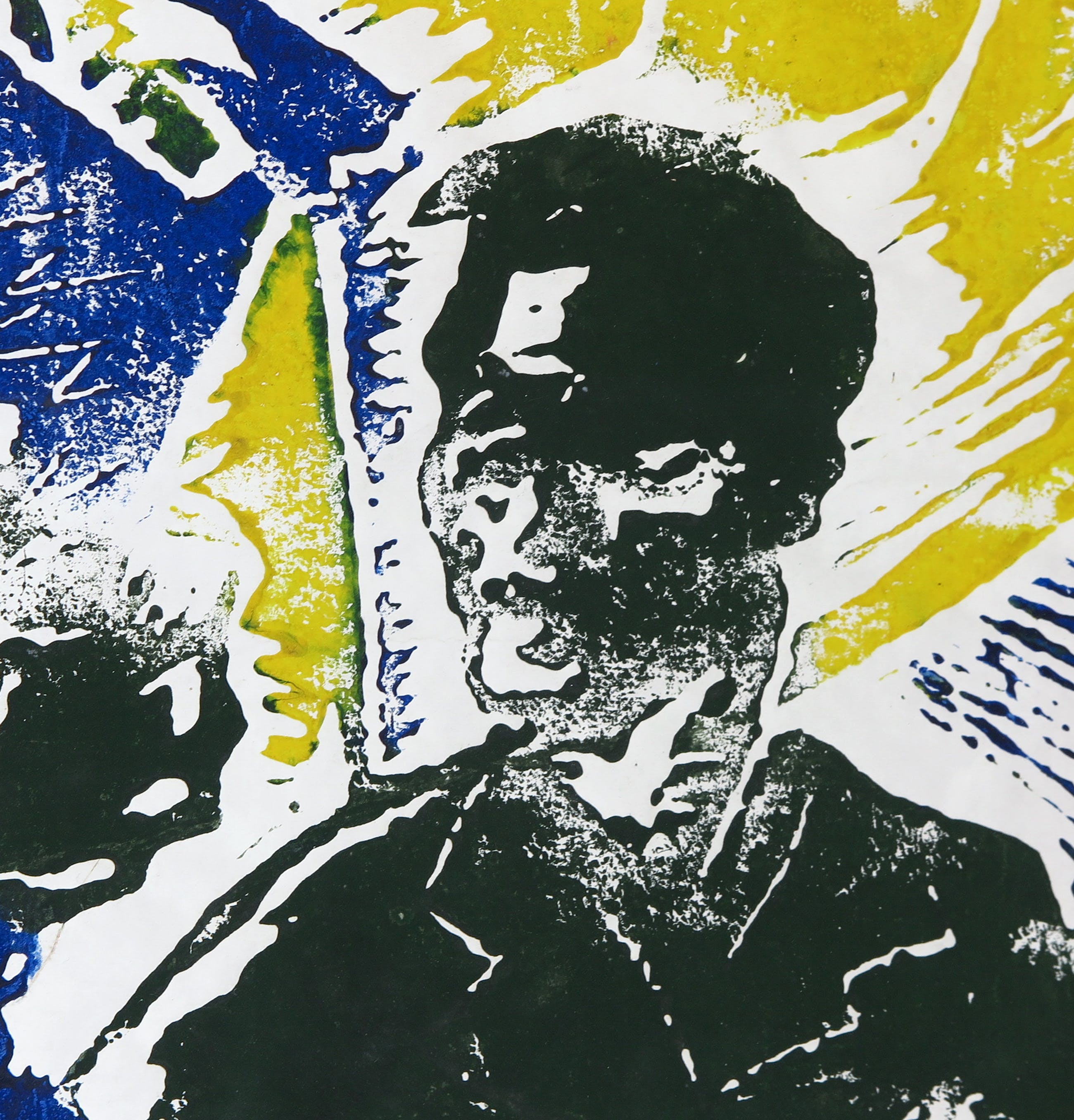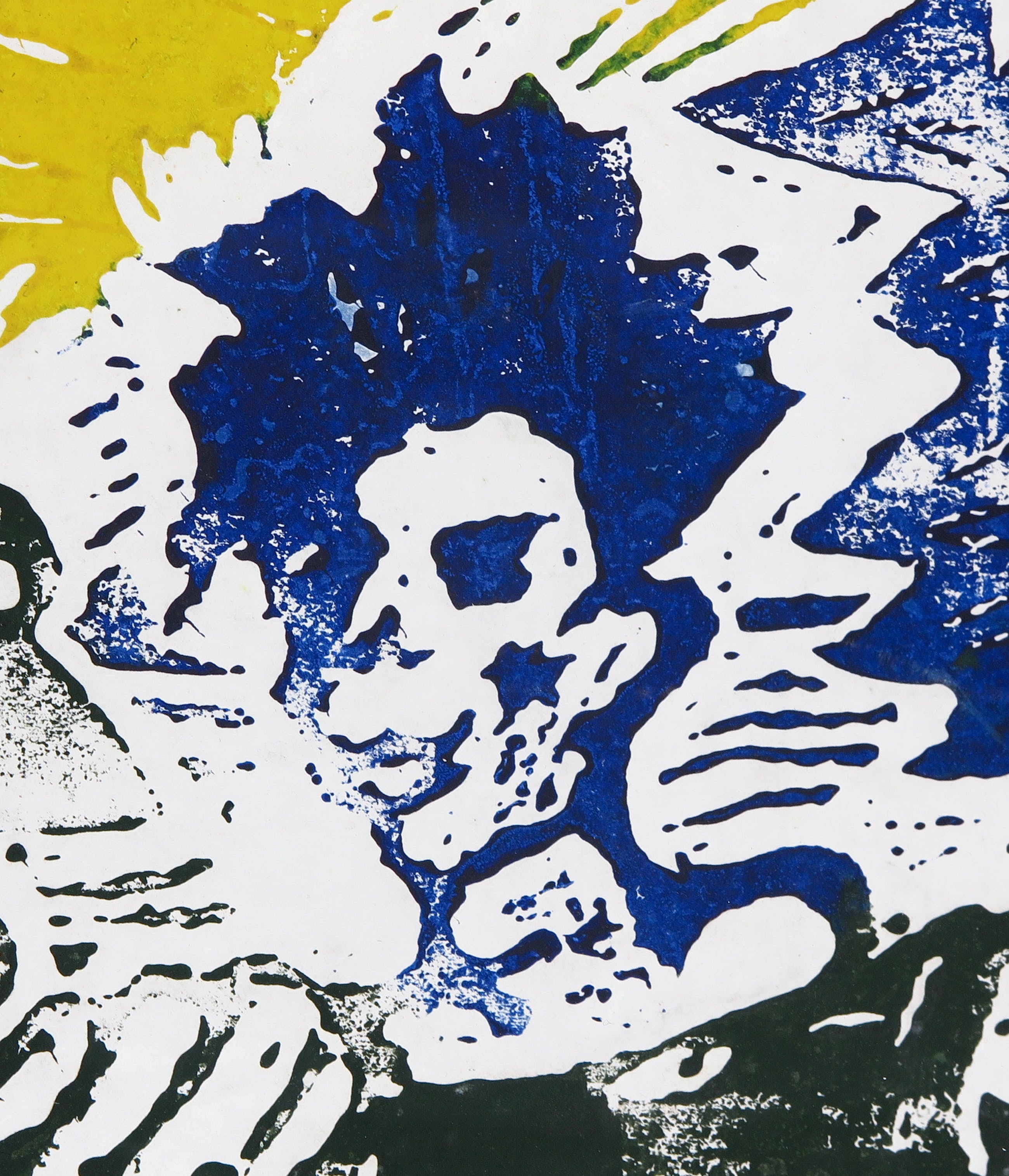 Immendorff heeft de linosnede uit de serie Café Deutschland - WIR KOMMEN in stukken gesneden en deze delen met acryl overschilderd. Hierdoor is ieder deel uniek.