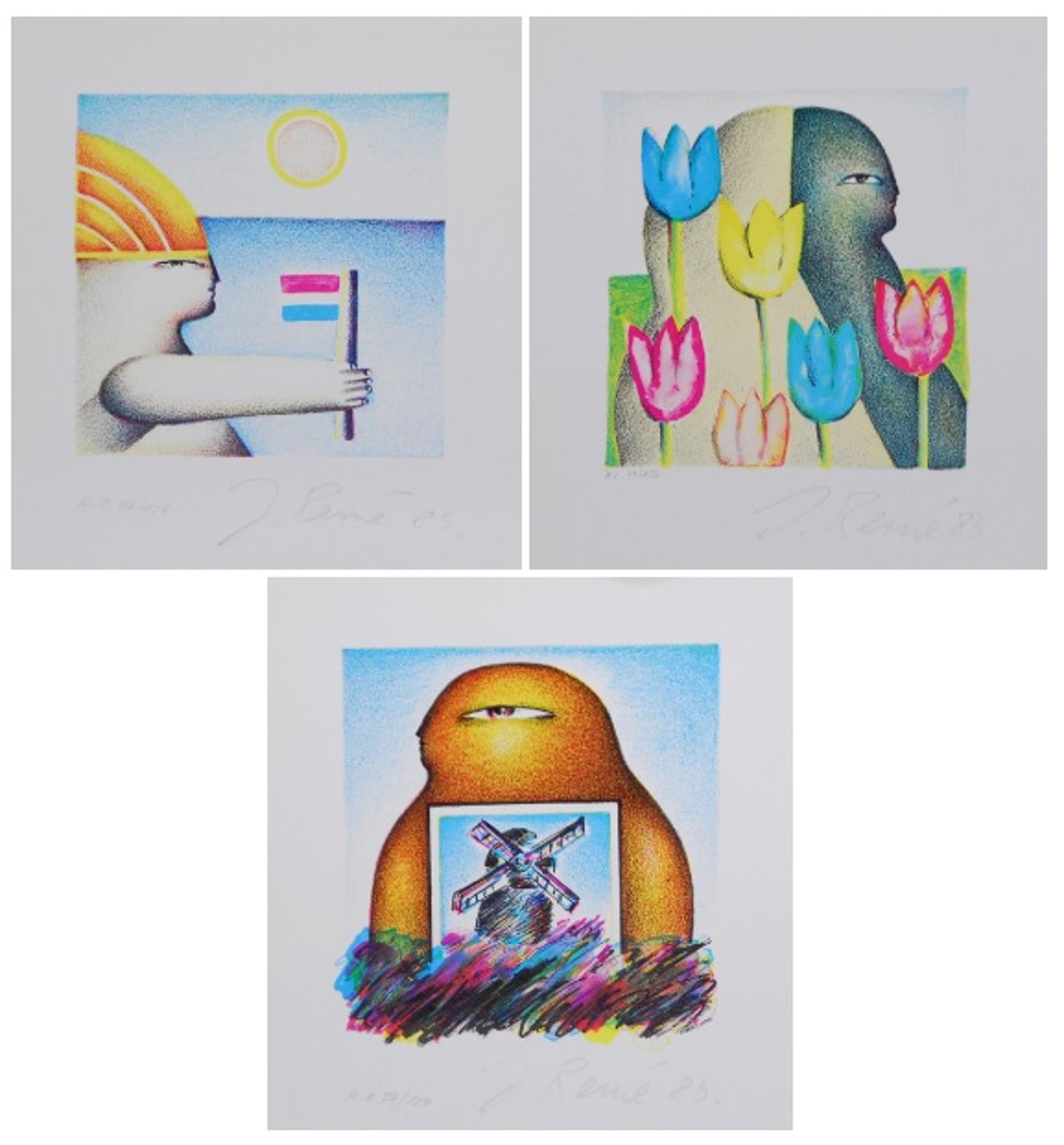 Jorg Reme - Drie handgesigneerde zeefdrukken: Figuur met molen, vlag, tulpen - Verkocht