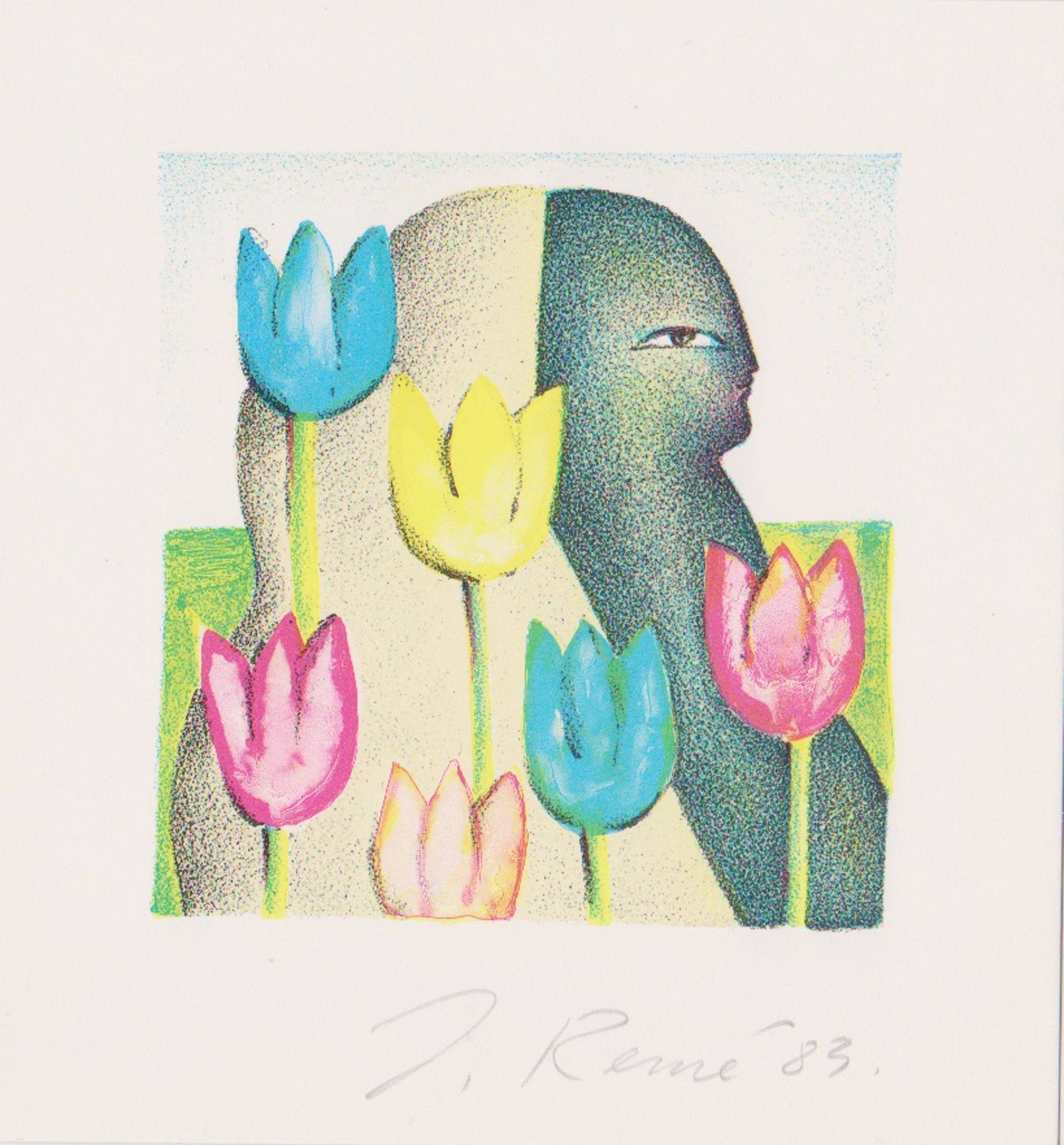 Fraaie handgesigneerde lithografie van Jorg Reme (1983). Titel: Figuur met Tulpen. Afmetingen: 15 x 14 cm.