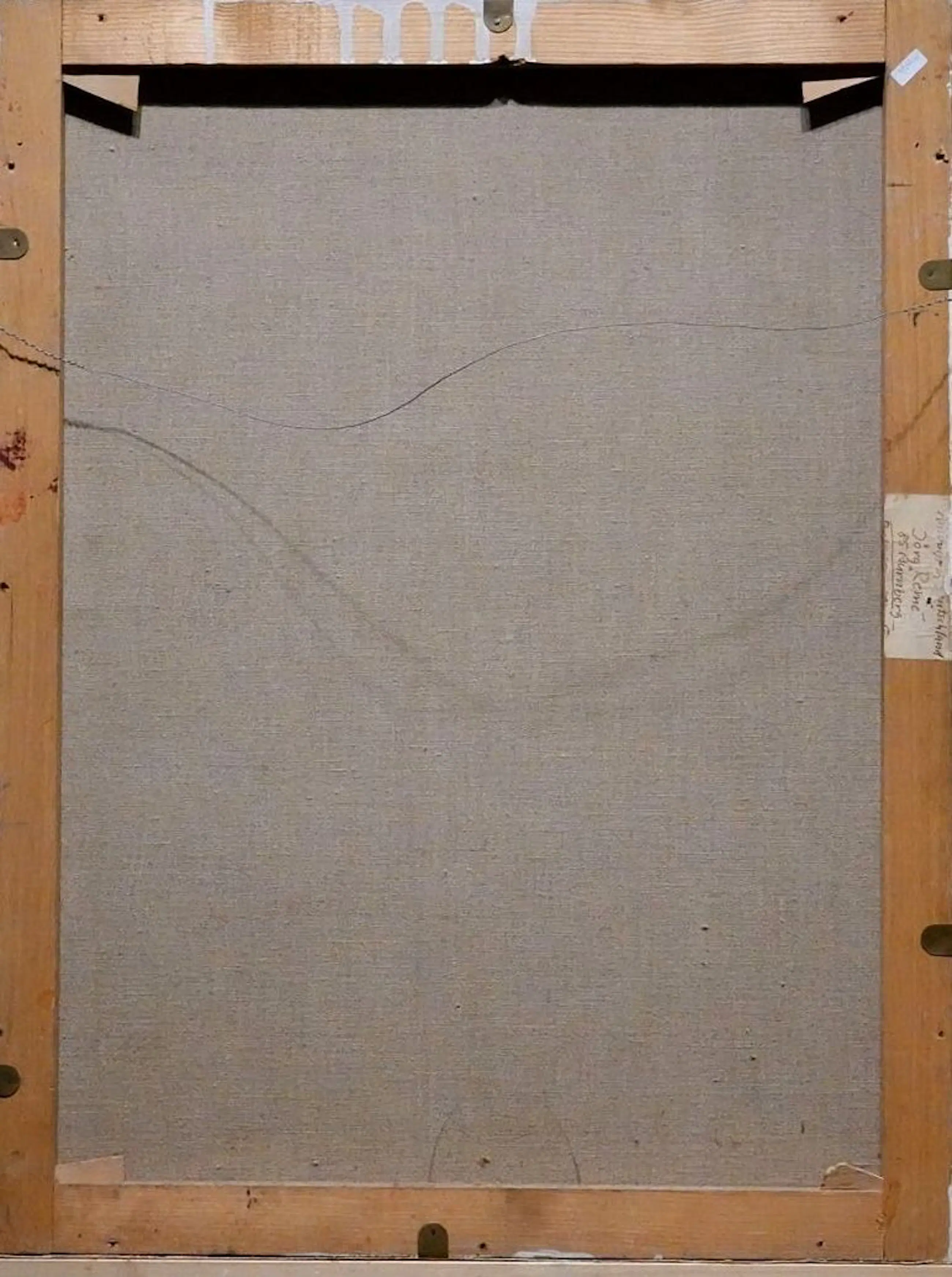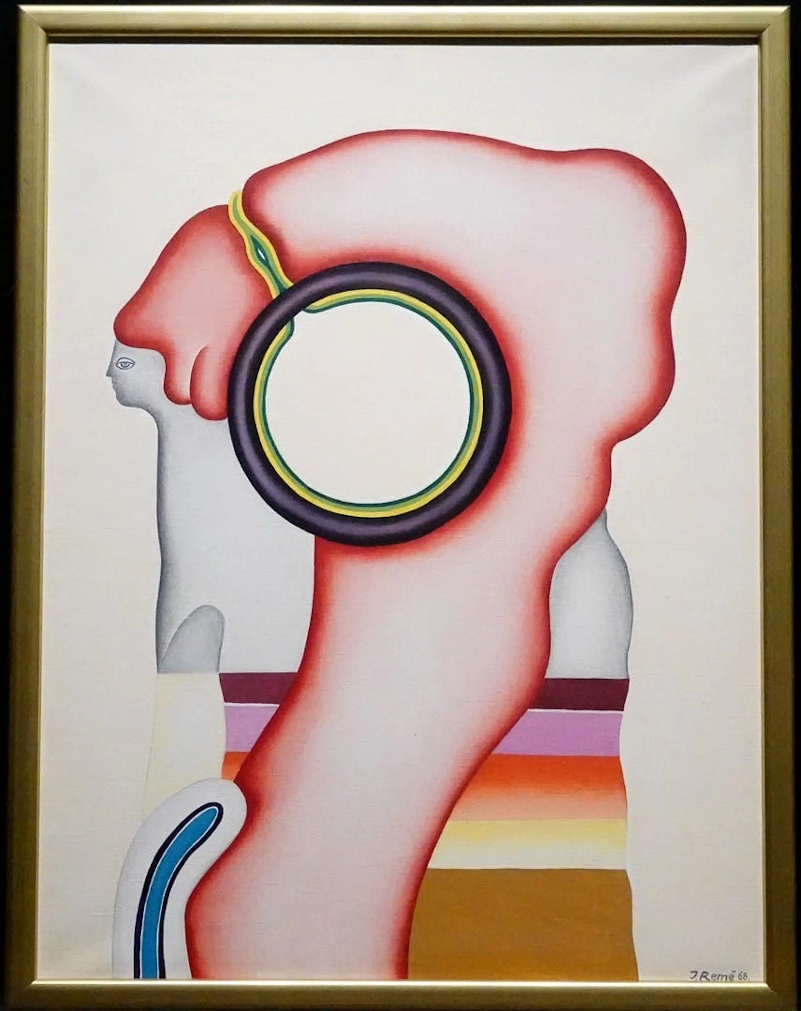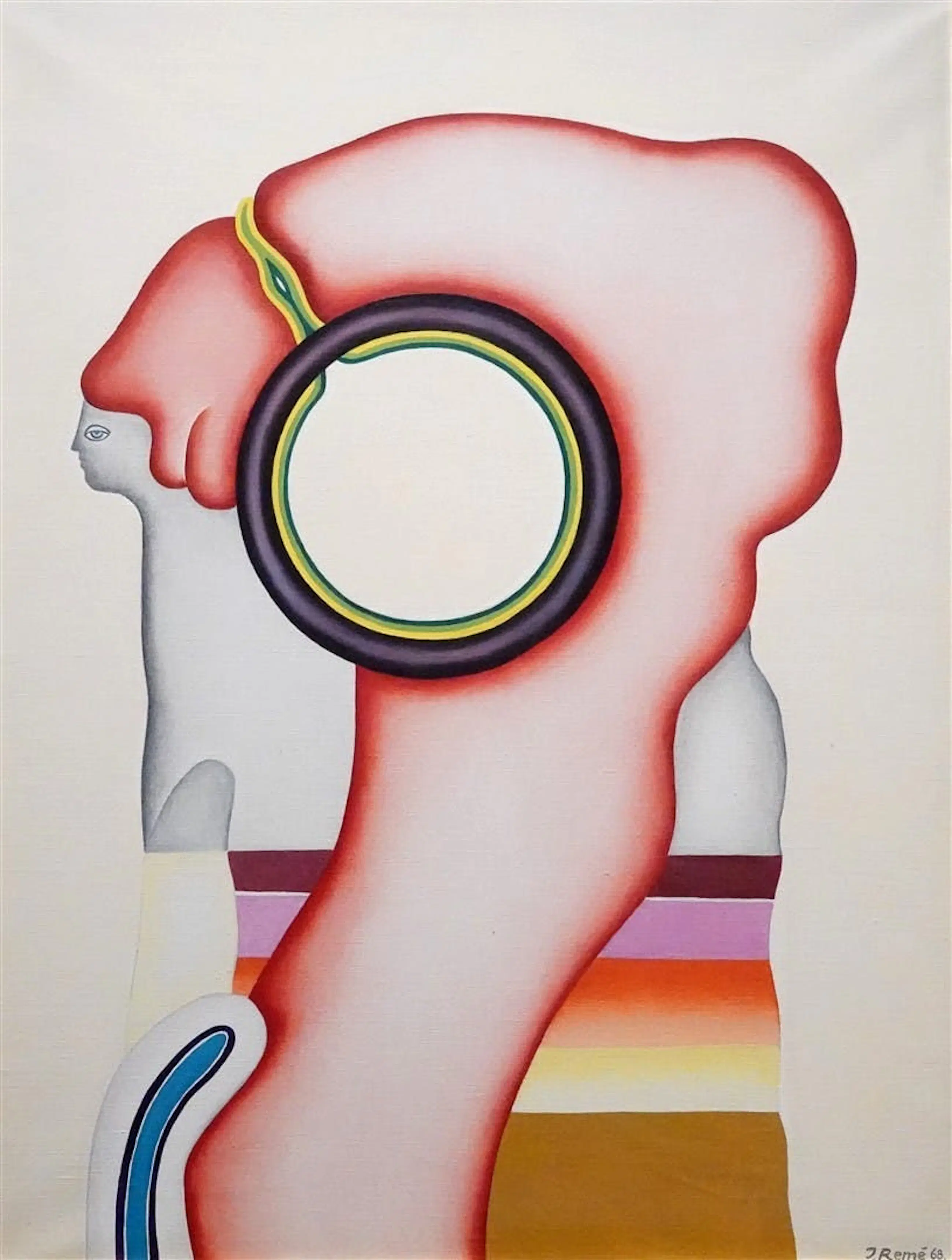 Ingelijste olieverf op doek van Jörg Remé. Compositie met figuur. Jaar: 1968. Afmetingen incl lijst: H90 x b70cm. Afmetingen voorstelling: H85 x B65cm.