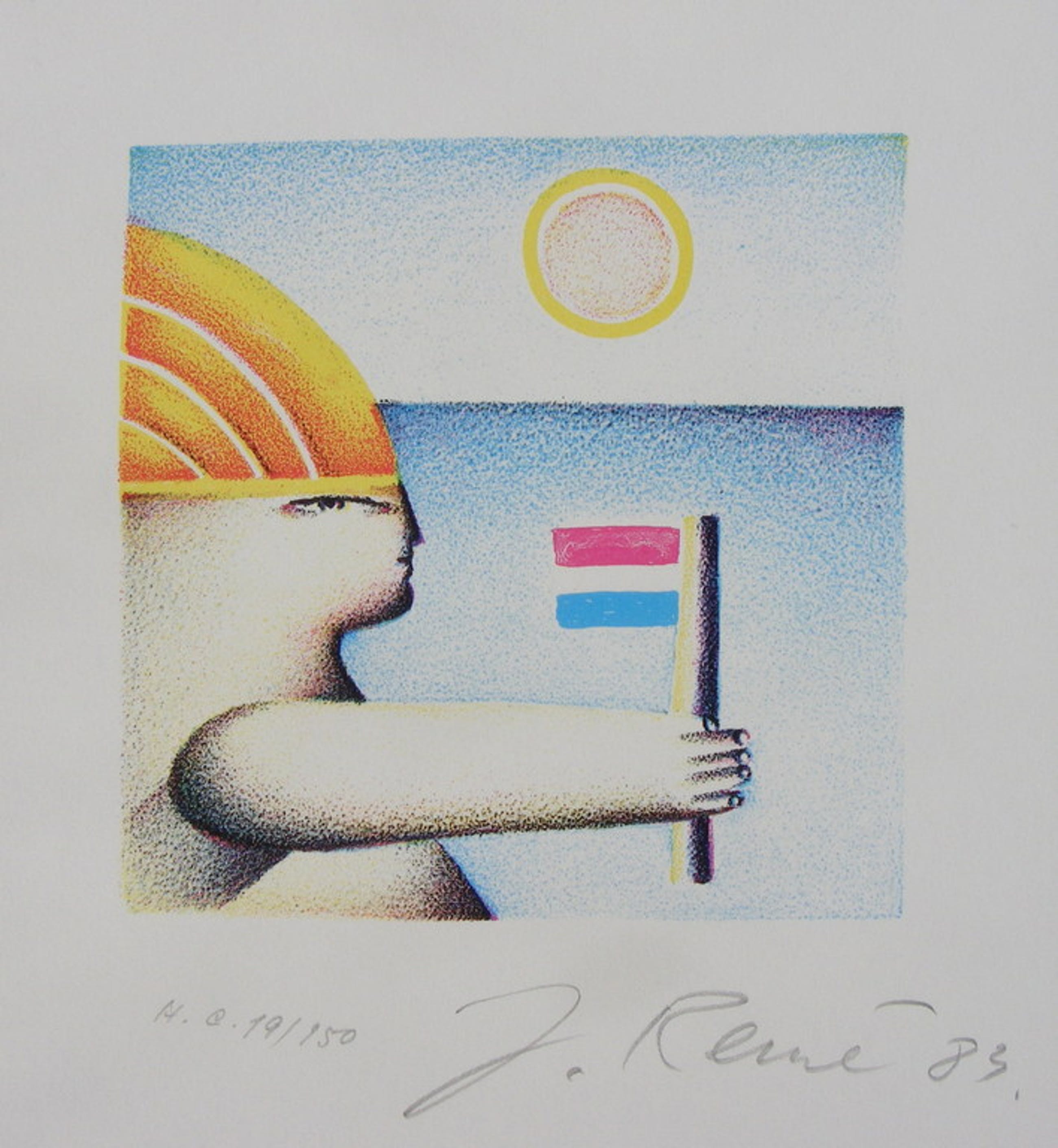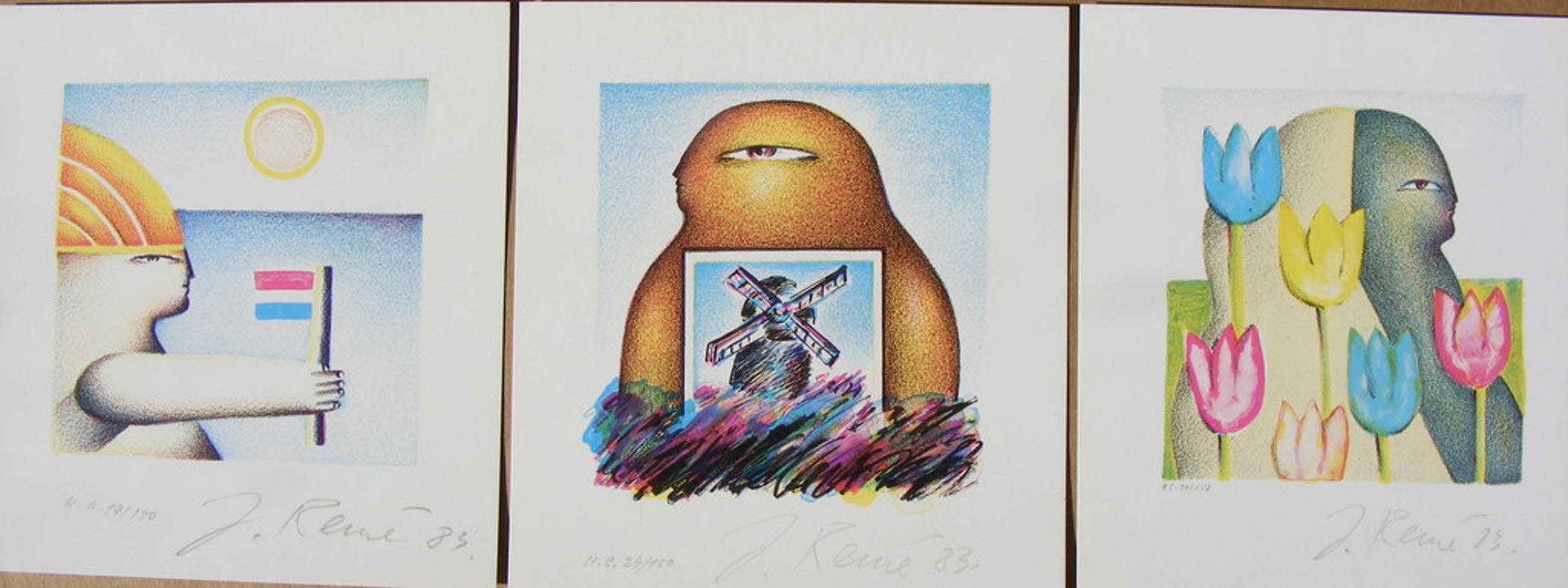 3 fraaie kleurenlitho's met vrolijke, Nederlandse onderwerpen, uit gelimiteerde oplage van Jörg Remé.