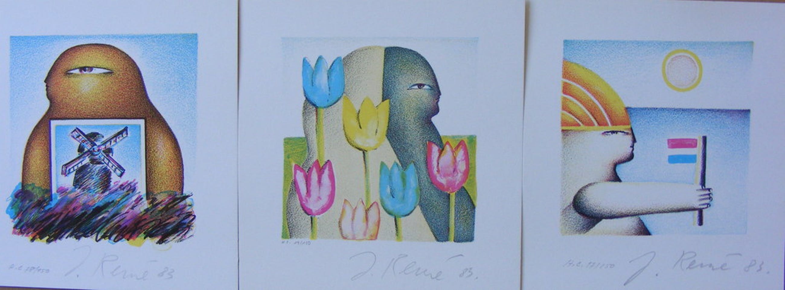 3 fraaie kleurenlitho's met vrolijke, Nederlandse onderwerpen, uit gelimiteerde oplage van Jörg Remé.