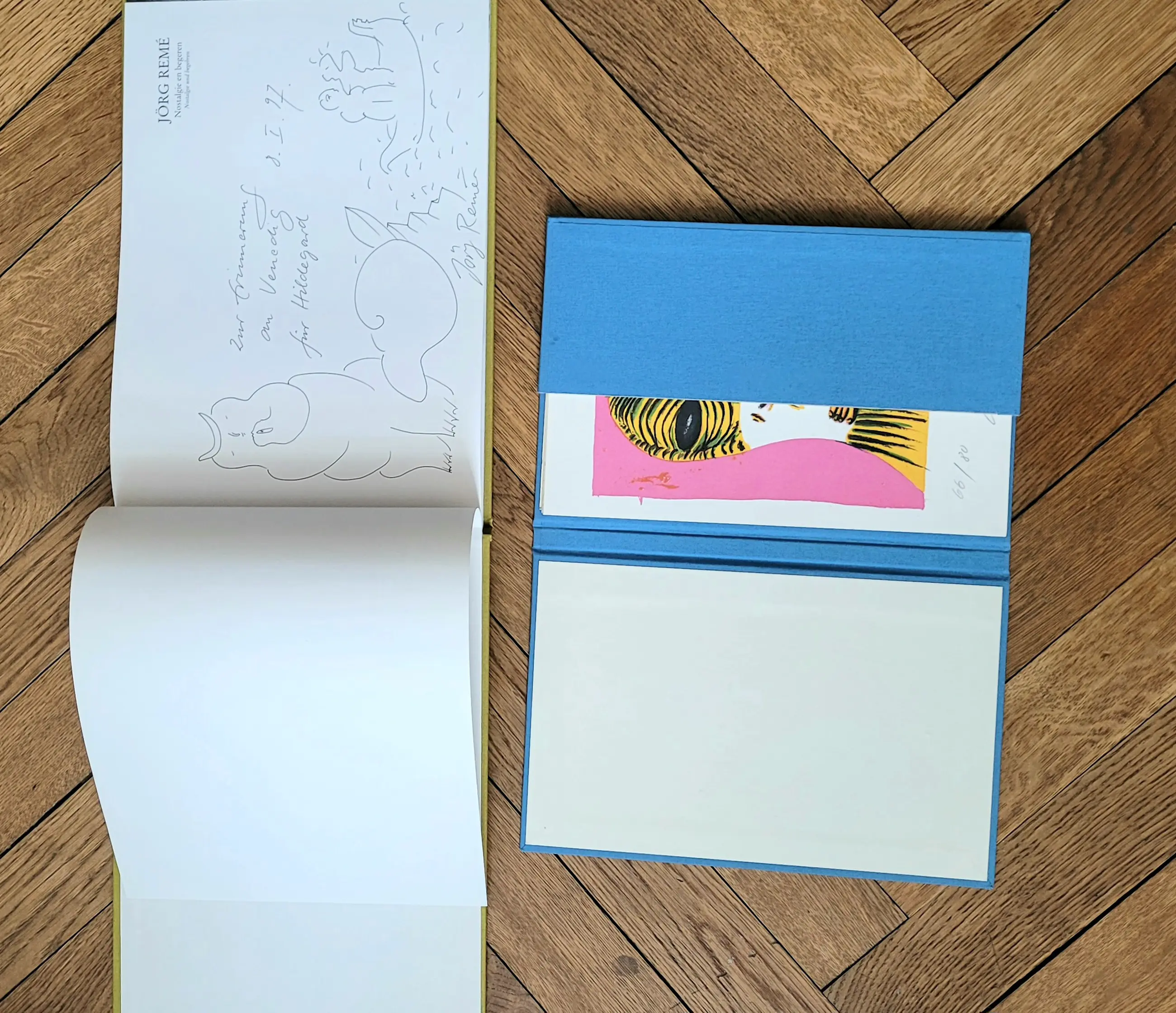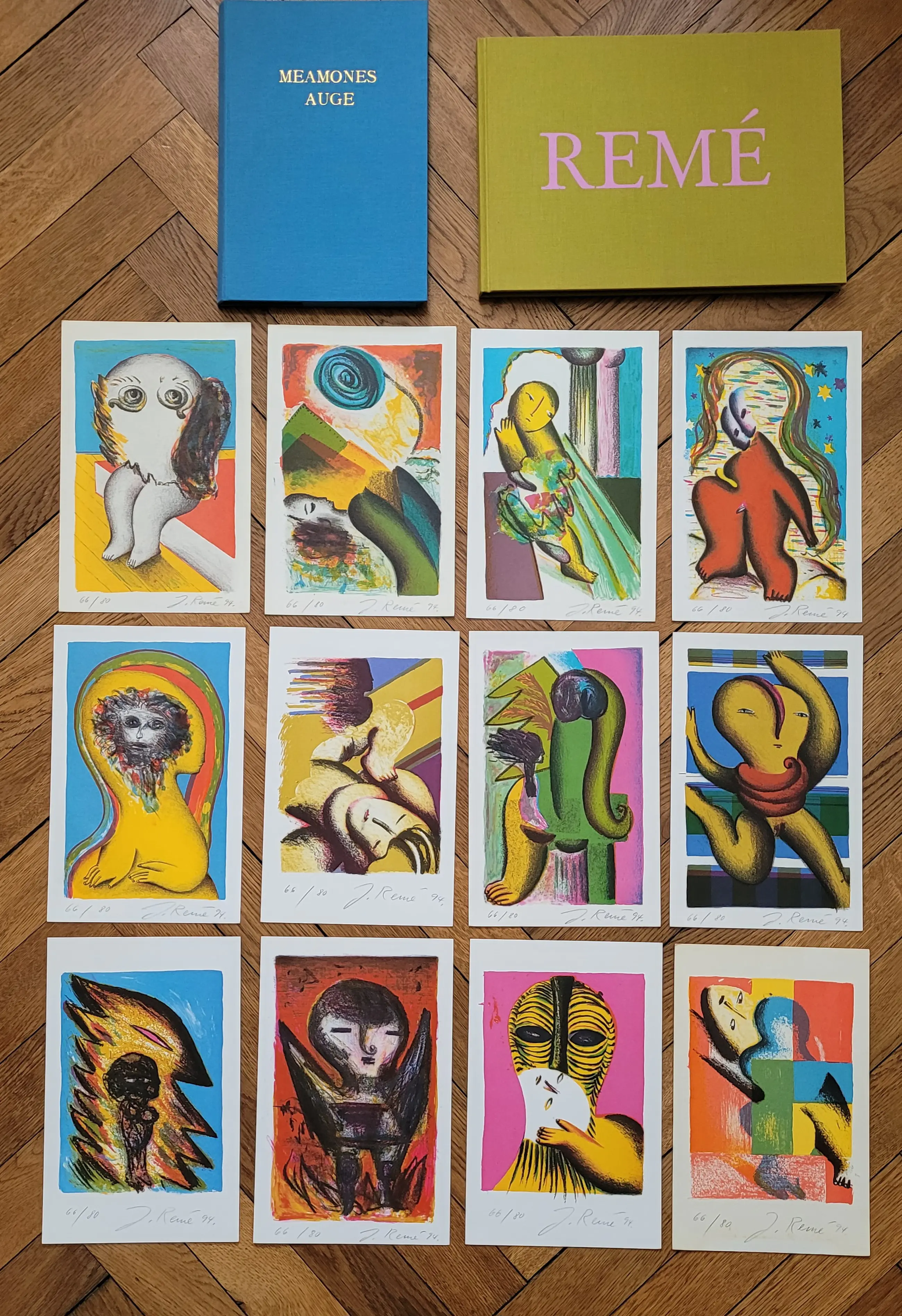 12 motieven van Jörg Reme in uitstekende staat als bundel in een lichtblauwe linnen map met in goud gegraveerde titel: MEAMONE'S EYE zijn hier te koop/veiling. Daarnaast is er gratis het werkboek in liggend formaat van de kunstenaar met een persoonlijke opdracht en tekening.