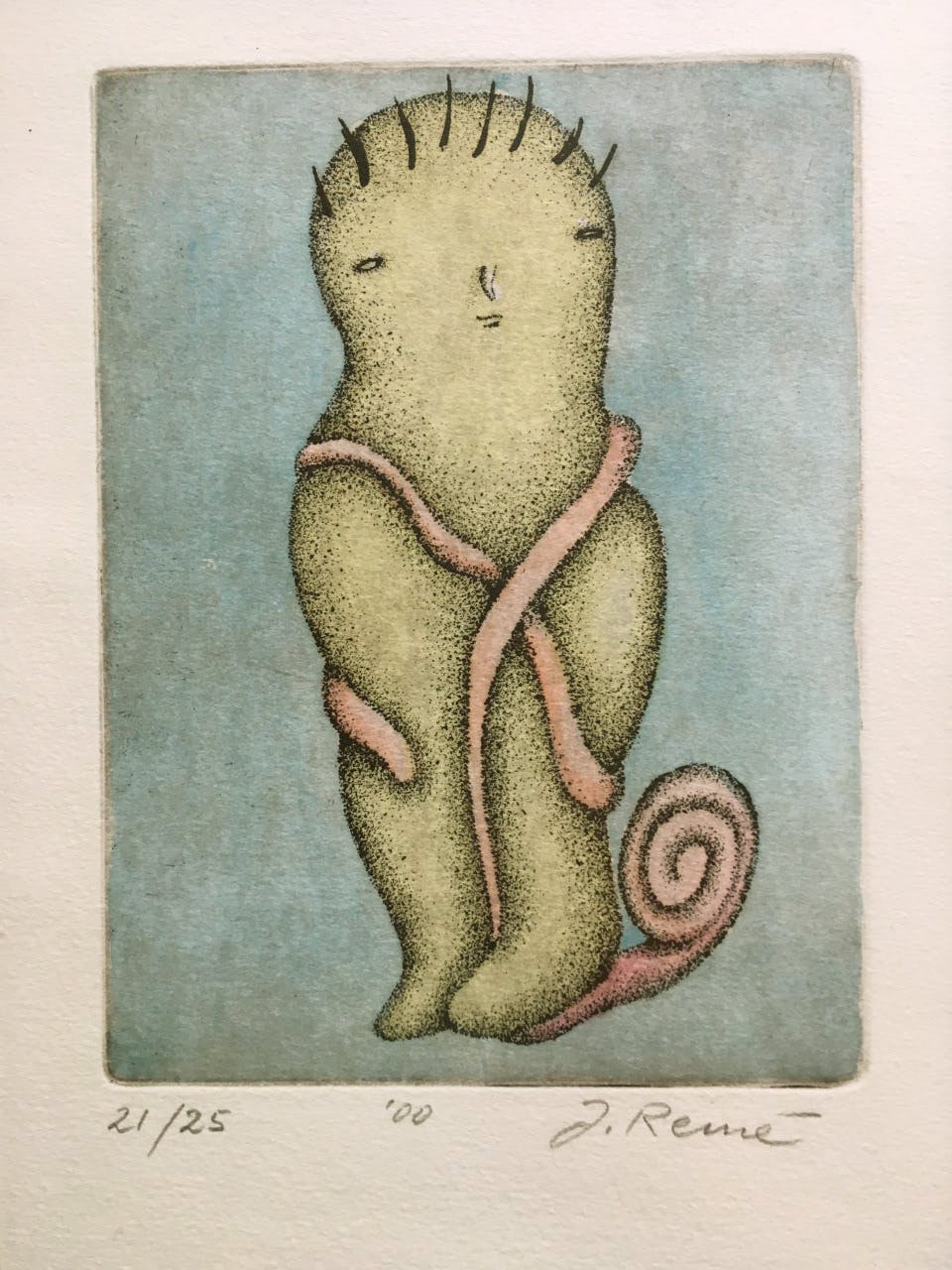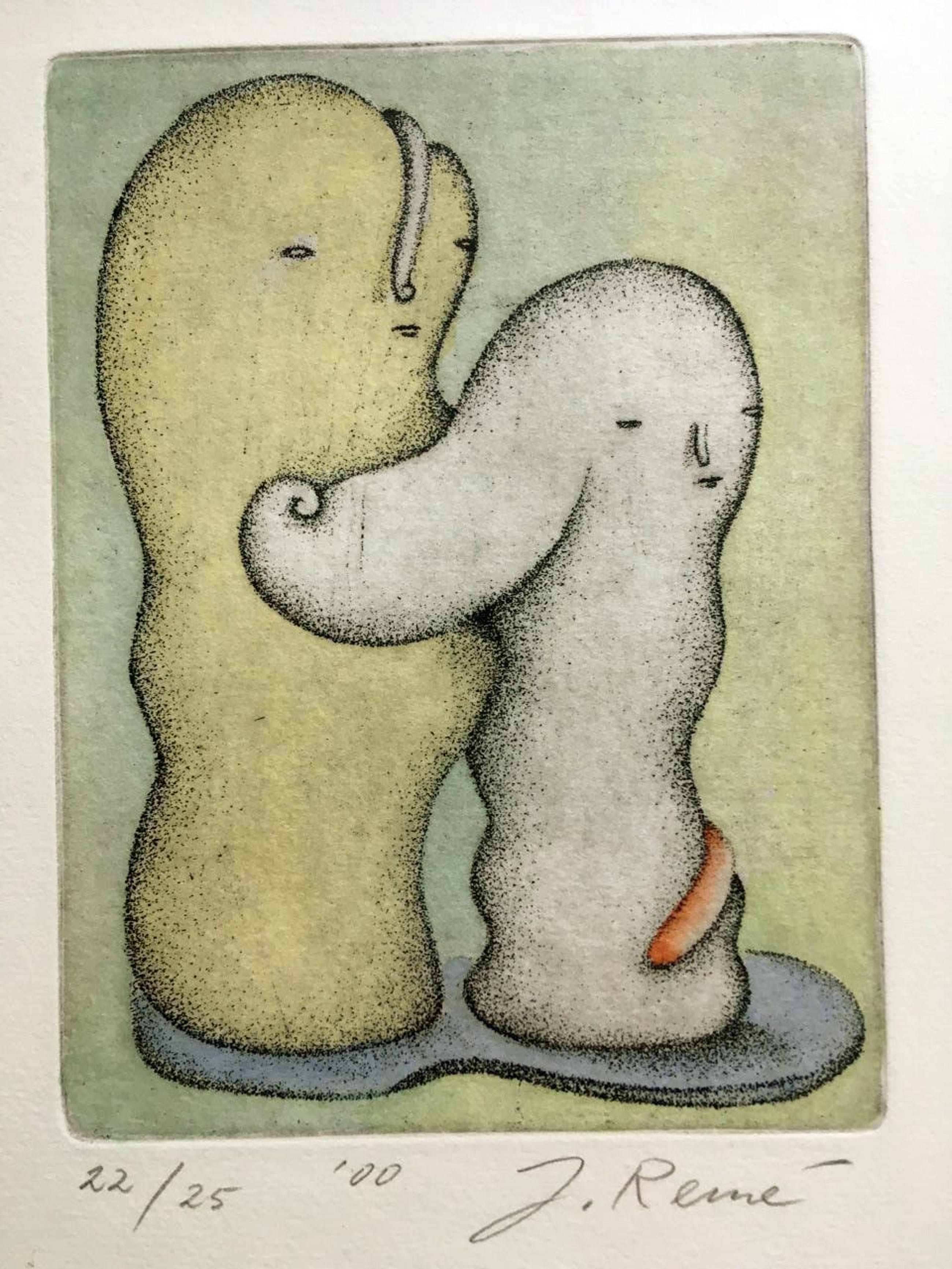 Combinatie van 4 verschillende kleuren etsen van Jorg Remé. Kleine oplage van 25 stuks: nrs. 13,18,21 en 22. Onderin potlood gesigneerd, genummerd en '00 gedateerd door de kunstenaar. In fraaie houten lijst met ontspiegeld glas. Formaat incl. 30,5 x 22 cm. Wordt zelden of nooit aangeboden.