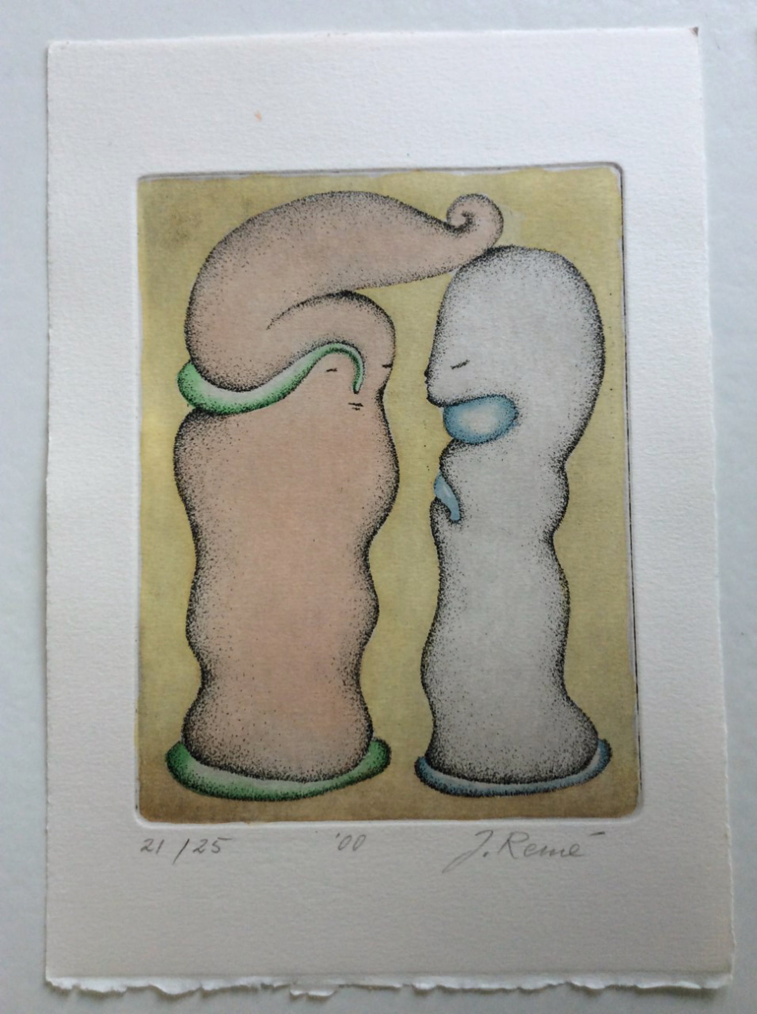 Combinatie van 4 verschillende kleuren etsen op geschept papier van Jorg Remé. Kleine oplage van 25 stuks, dit zijn oplagenrs. 10,18,20 en 21. Onderin potlood gesigneerd, genummerd en '00 gedateerd door de kunstenaar. Formaat 20 x 28 cm. Wordt zelden of nooit aangeboden
