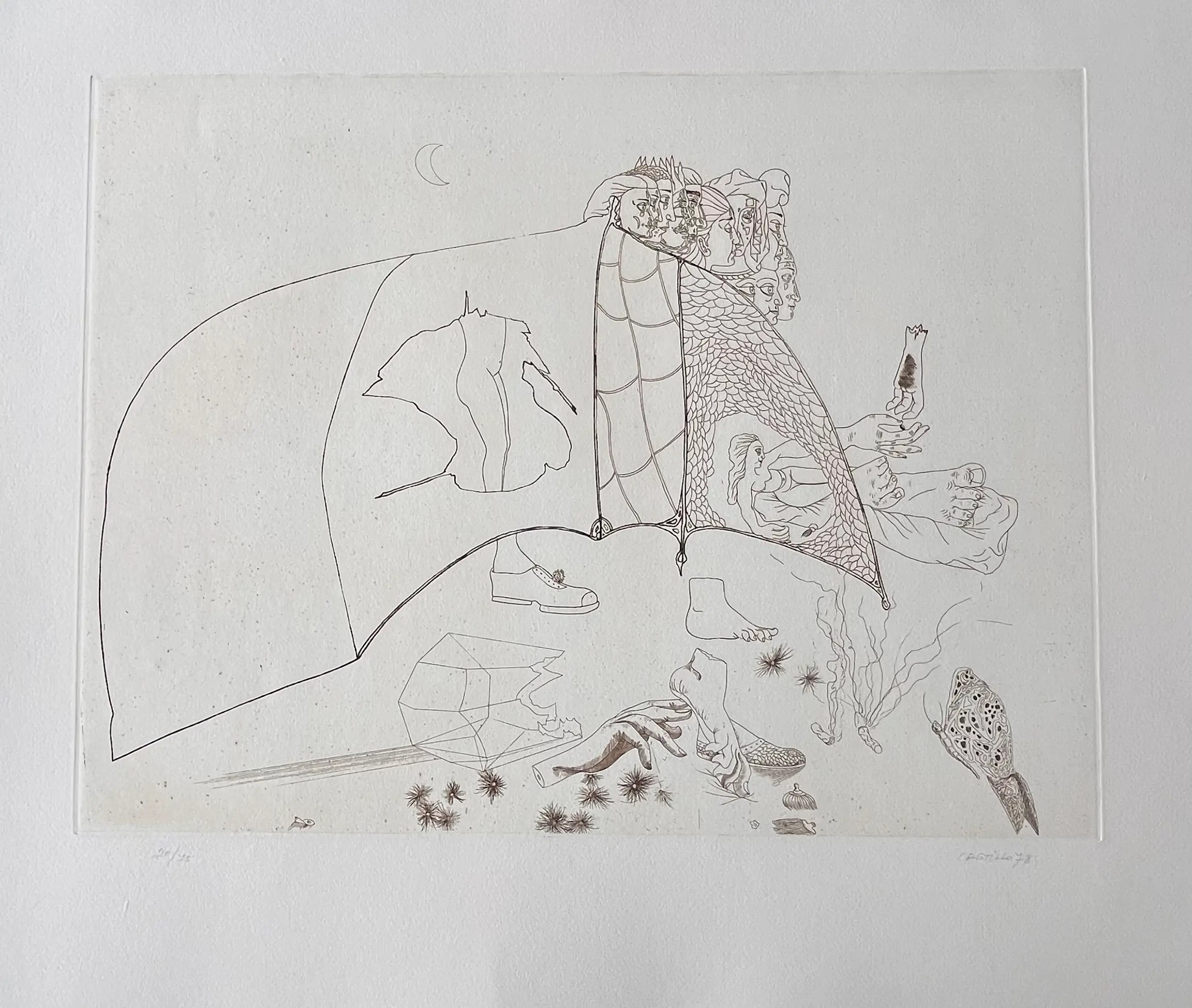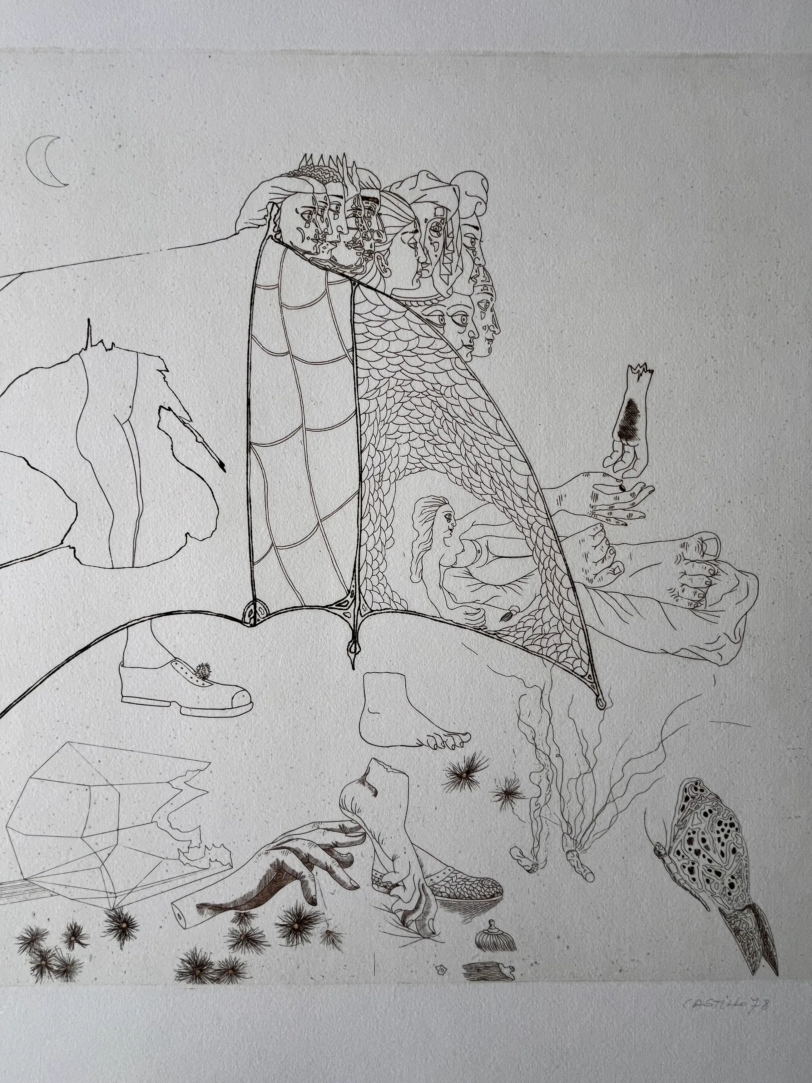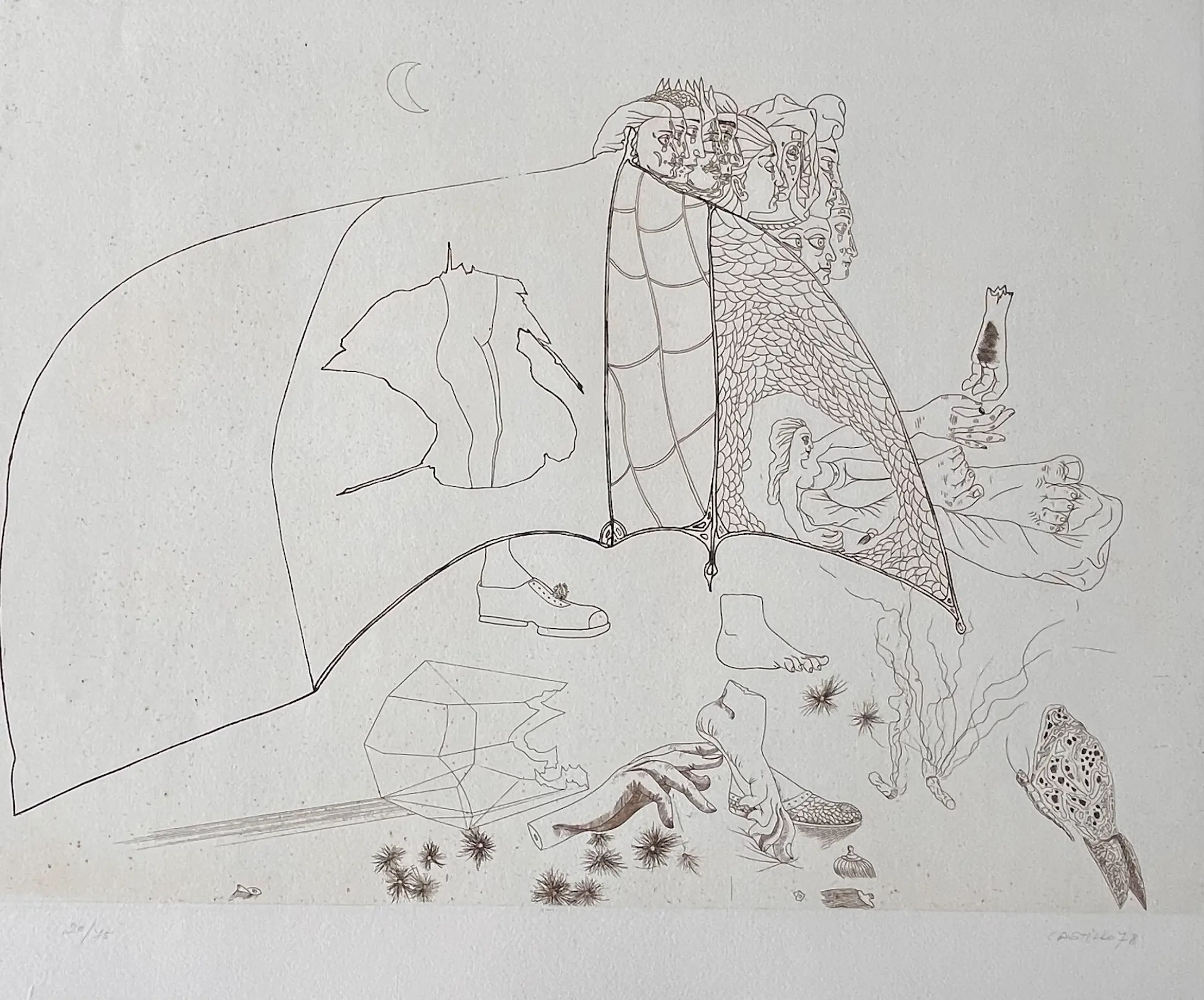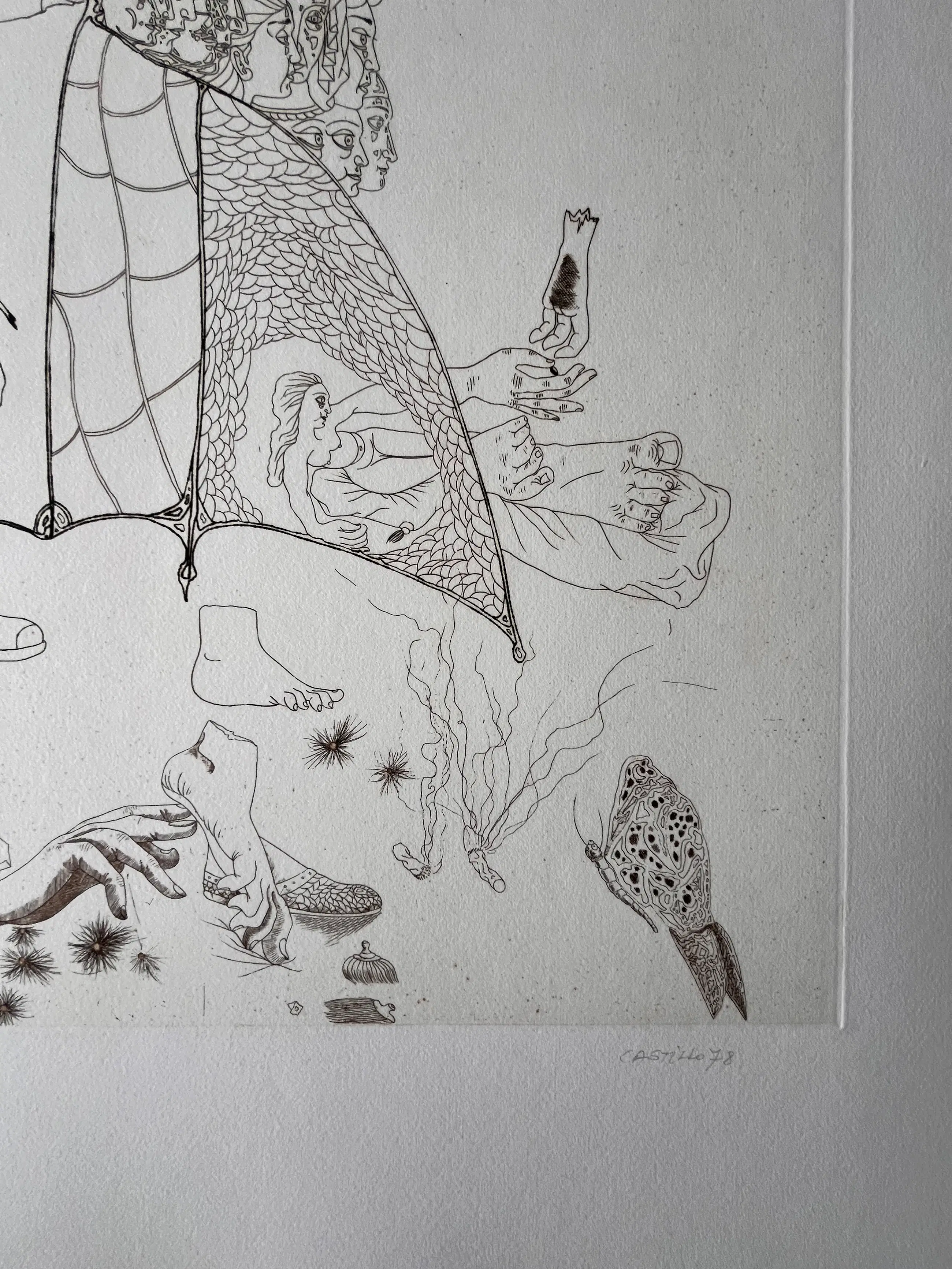 Originele ets van Jorge Castillo uit 1978 op GVARRO papier. Surrealistische compositie. Gesigneerd, gedateerd en genummerd in potlood door de kunstenaar. (oplage 20/75) Perfecte staat! Nooit ingelijst!