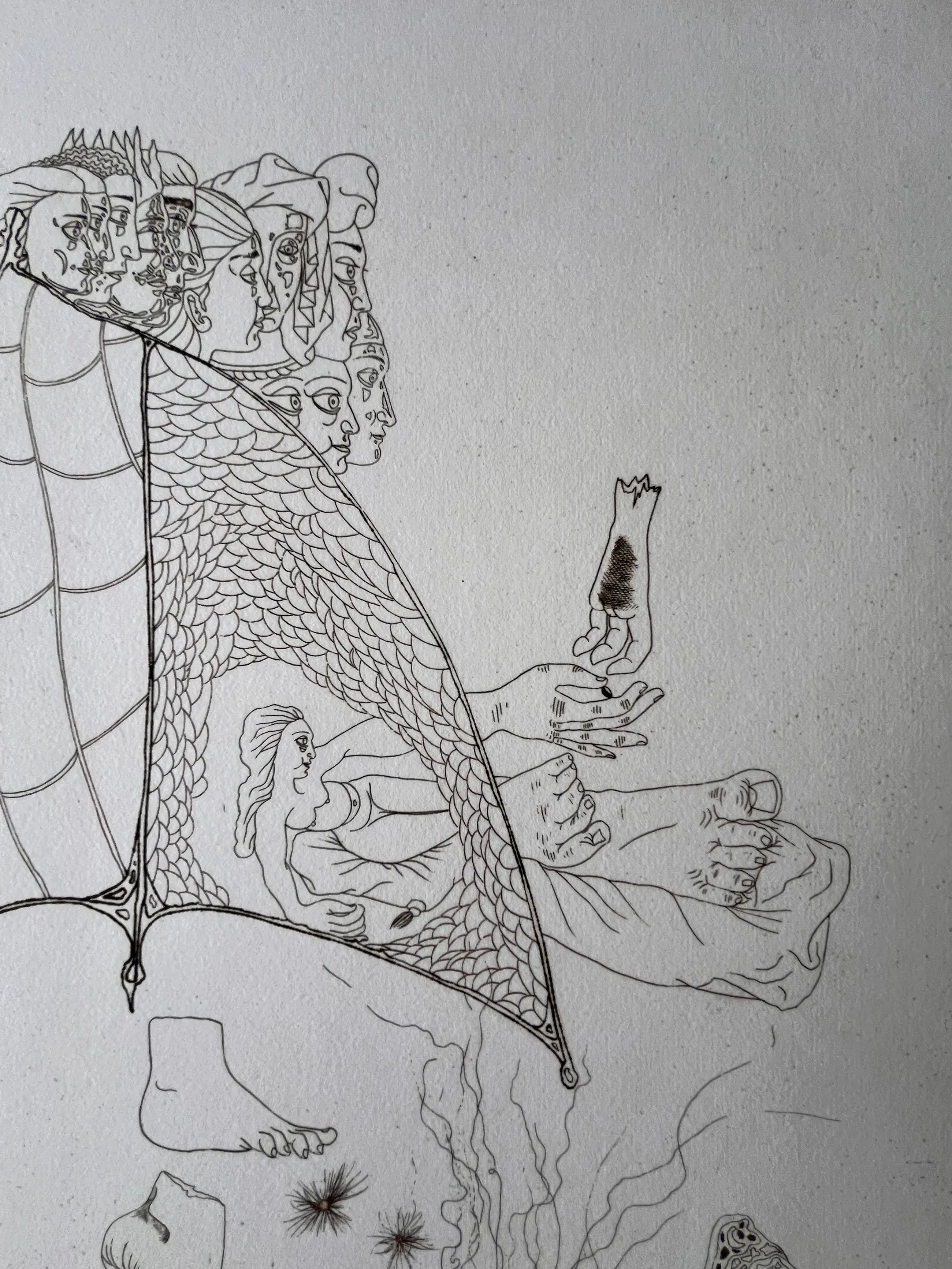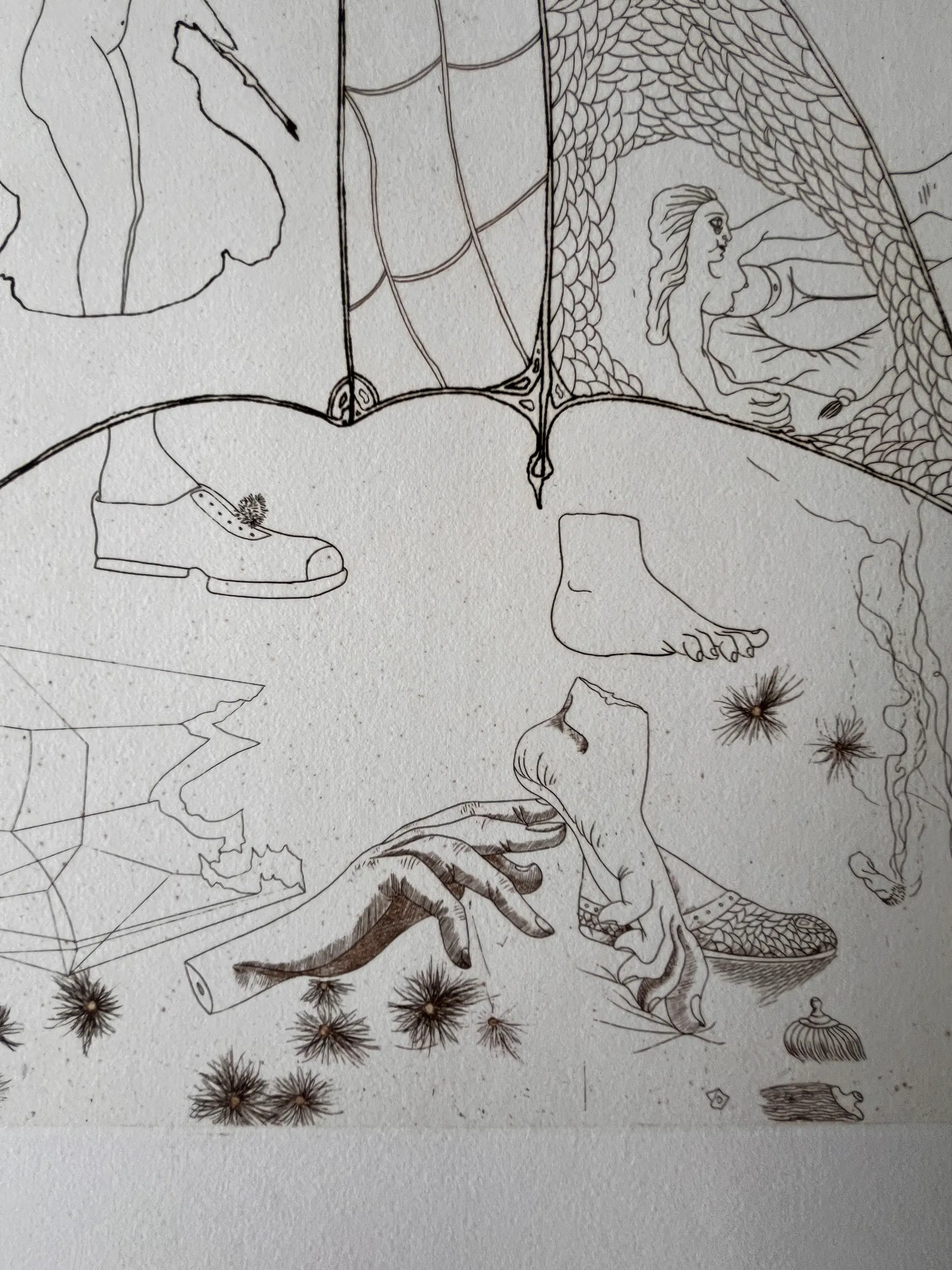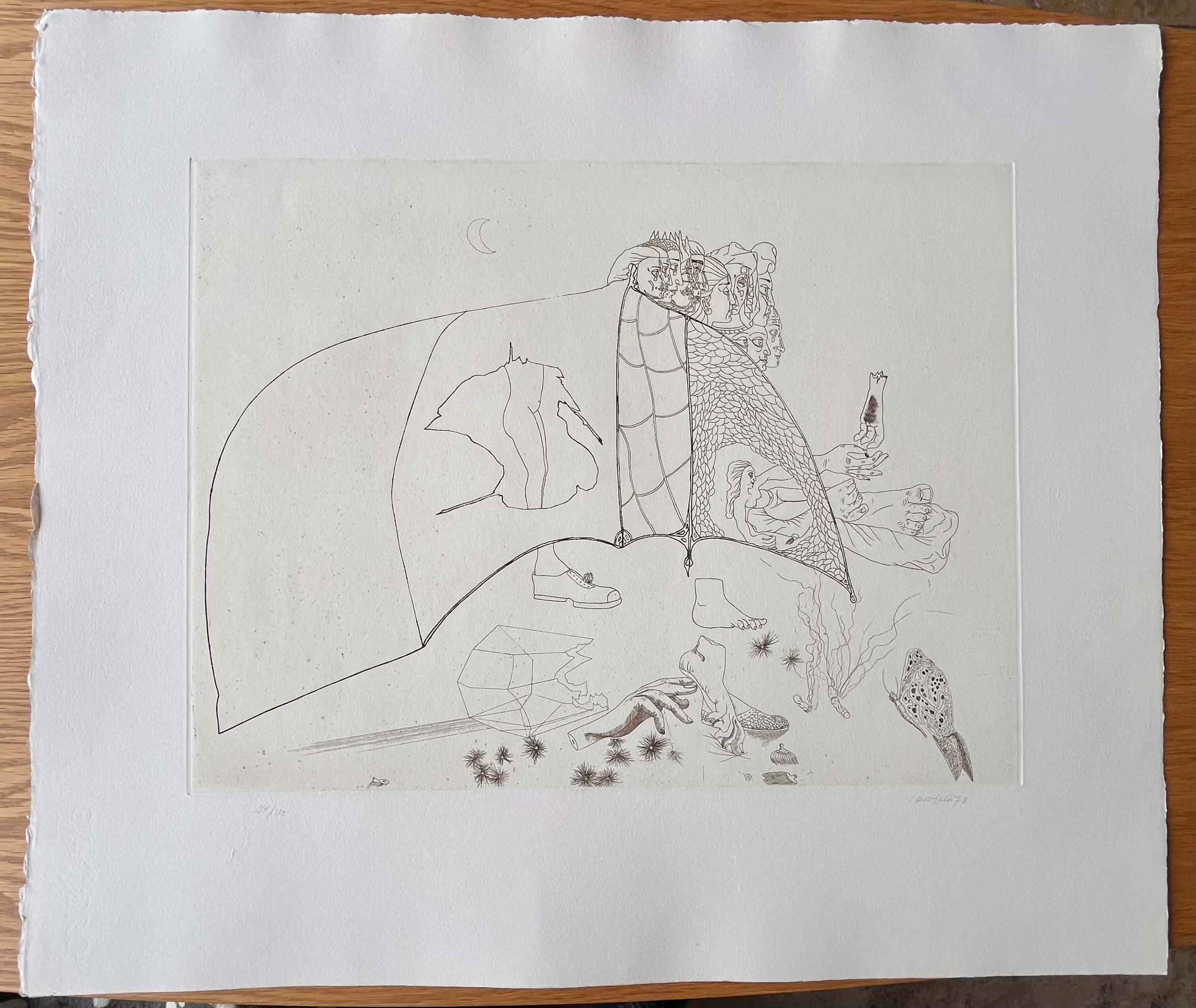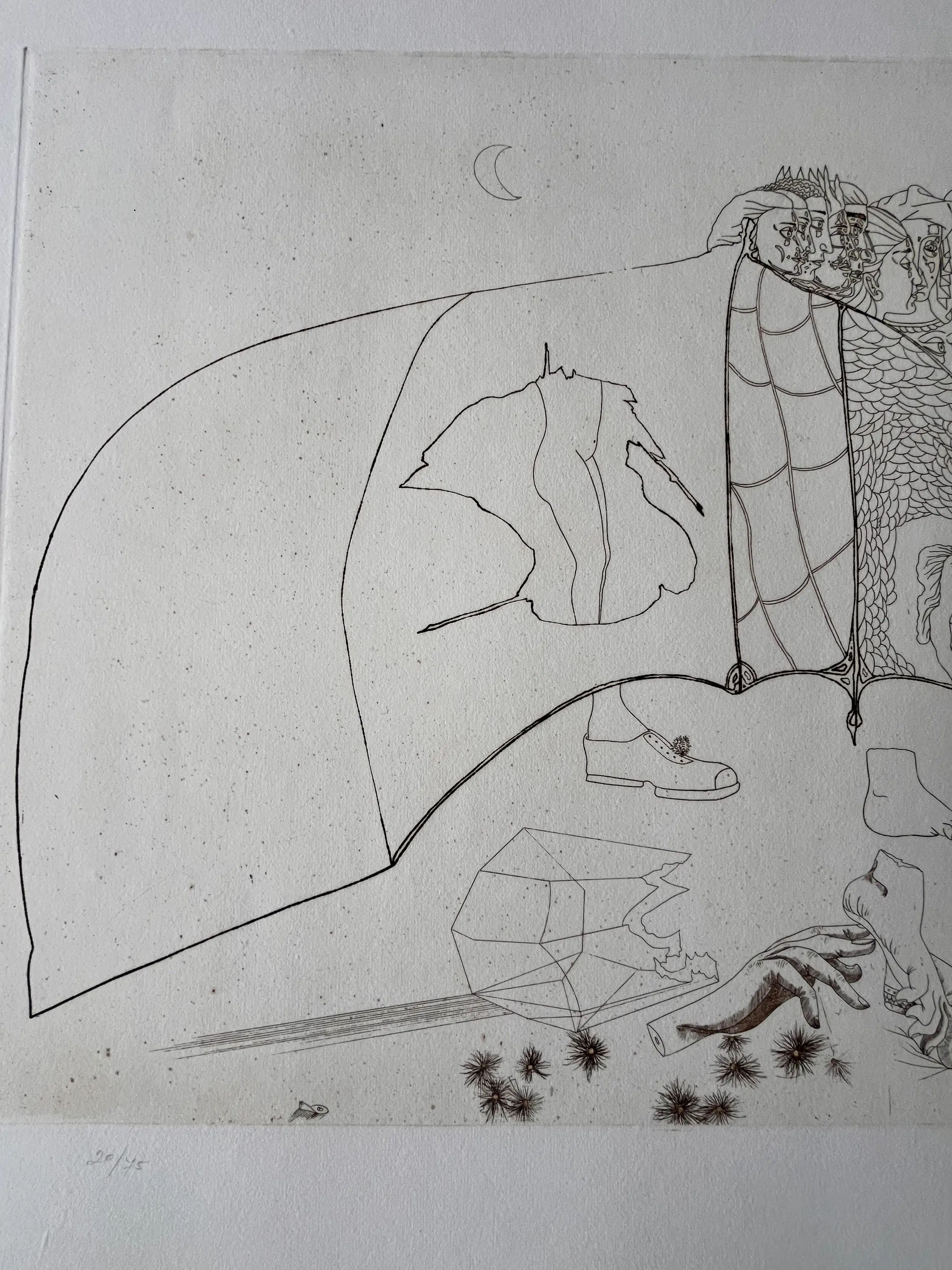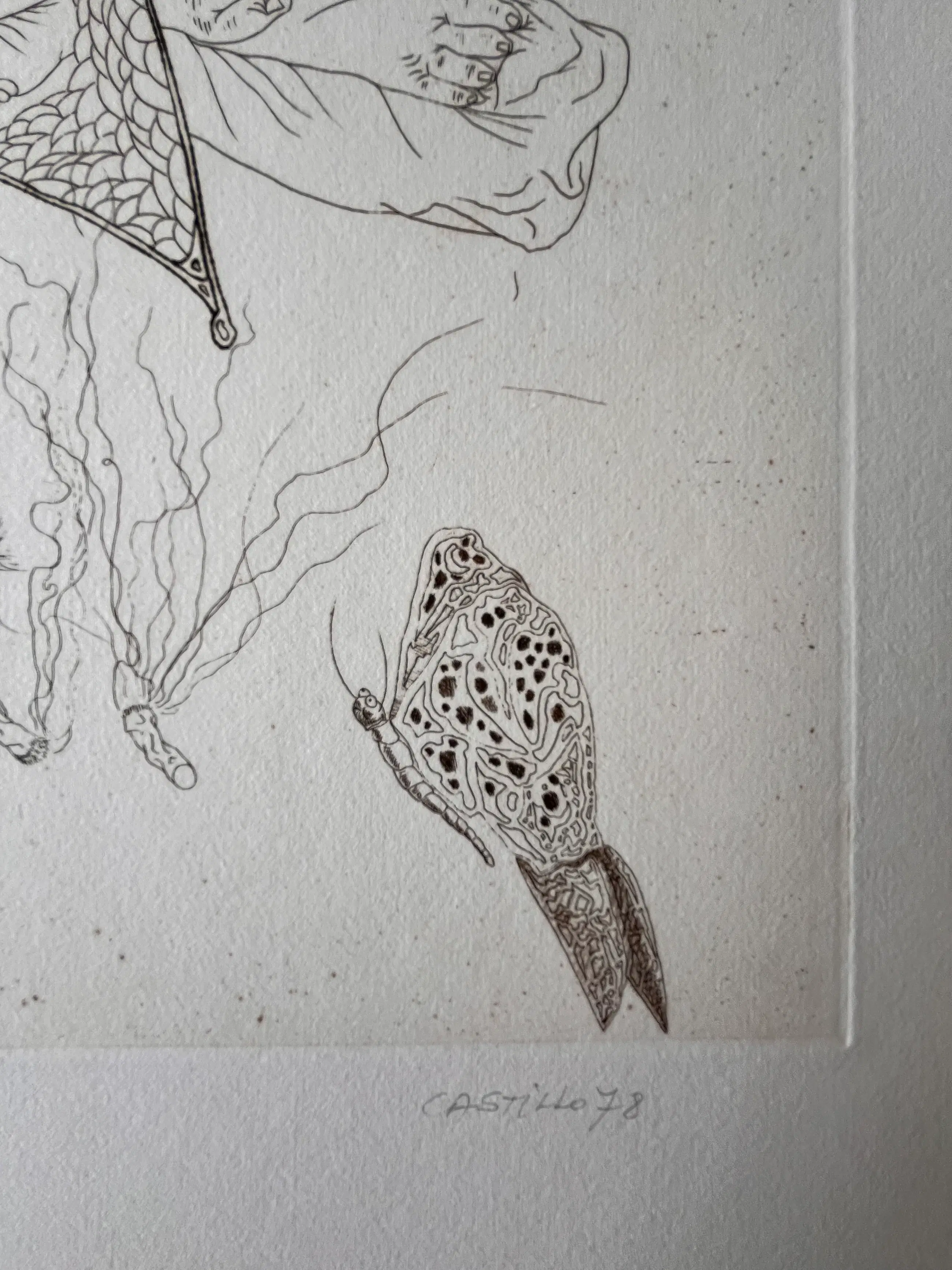 Originele ets van Jorge Castillo uit 1978 op GVARRO papier. Surrealistische compositie. Gesigneerd, gedateerd en genummerd in potlood door de kunstenaar. (oplage 20/75) Perfecte staat! Nooit ingelijst!