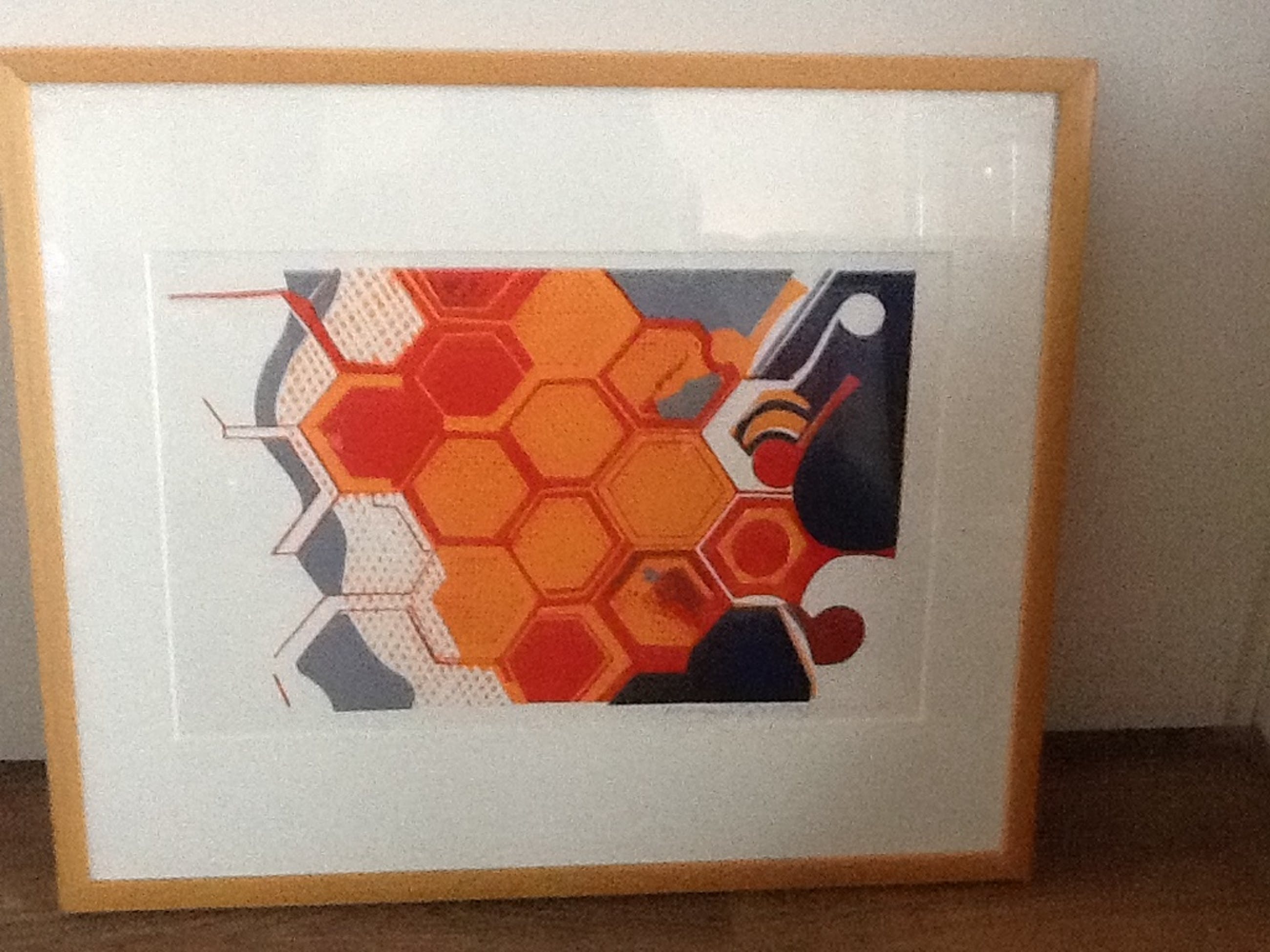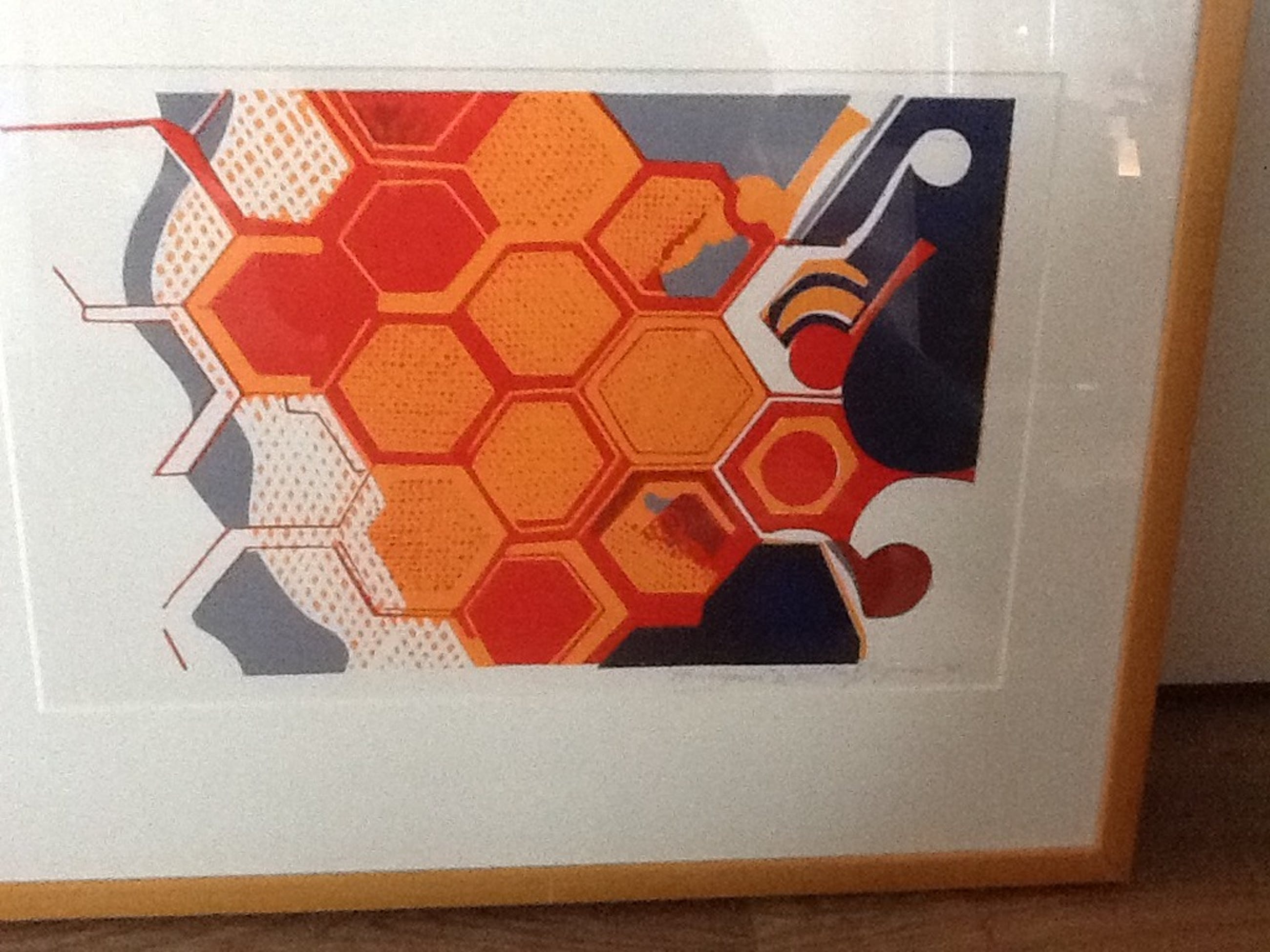 Linosnede afdruk. Ingelijst : ja, met glas en een houten lijst van 2 cm breed. Gesigneerd : ja, met B.J.Wigman' 00 r.o.met potlood. Genummerd : ja, 85/300. Titel : ja, Honingraat. Maten : Blad 63 x 53 cm en beeld 46 x 30 cm.