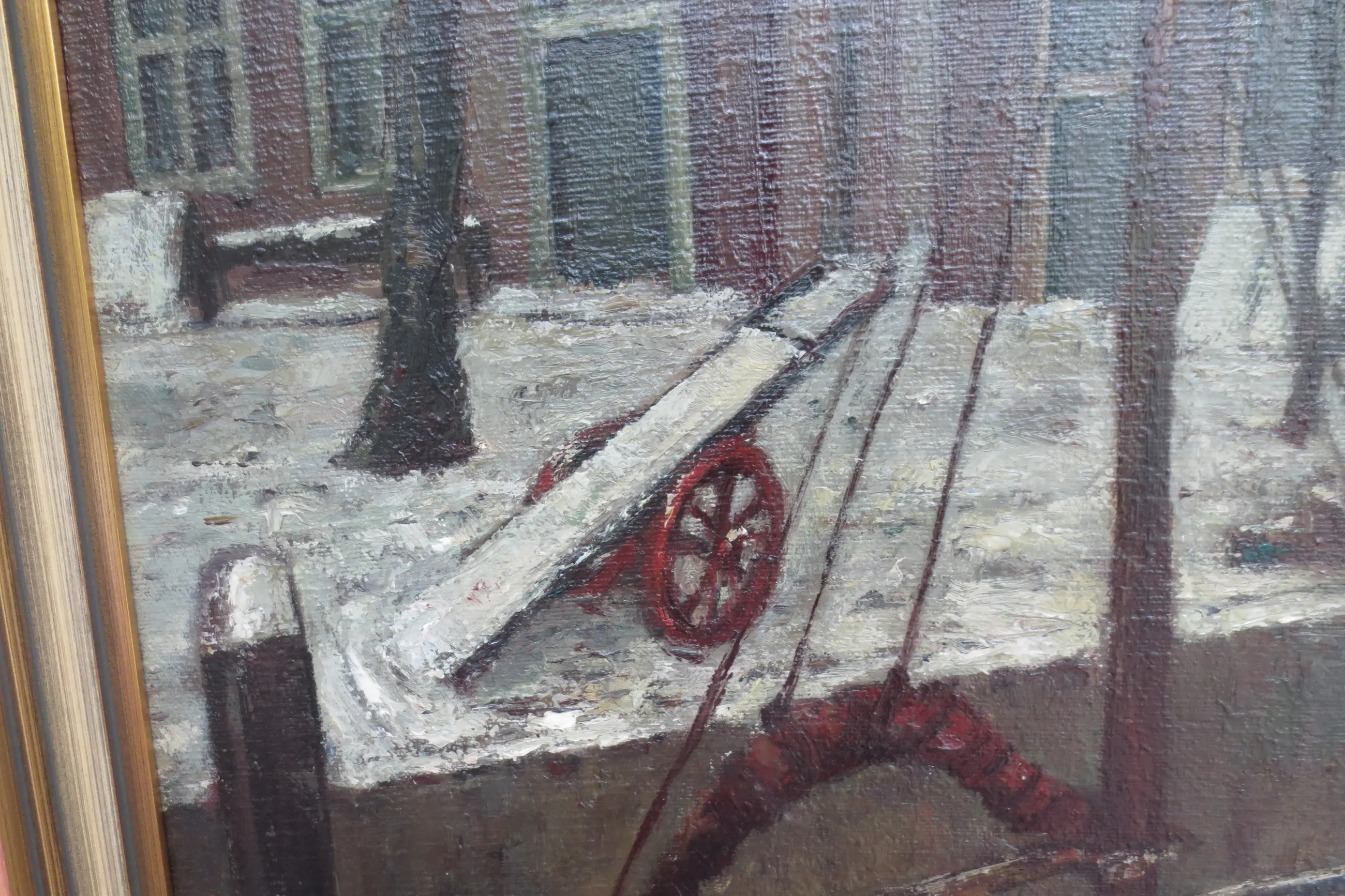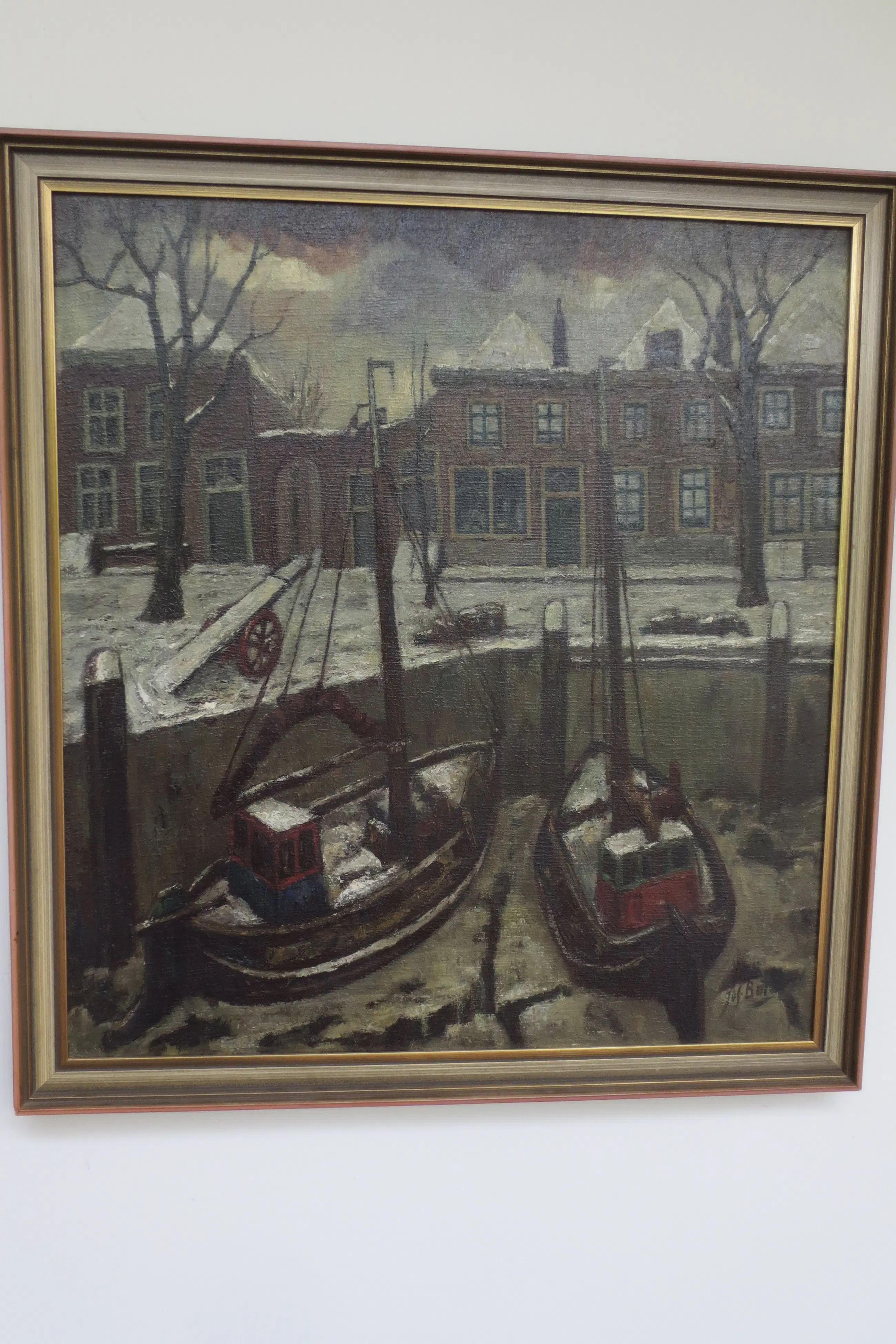 Schilderij van Jos But (1899 - 1980) die veel in Zeeland heeft gewerkt. Winters stadsgezicht op de Kaai in Veere.