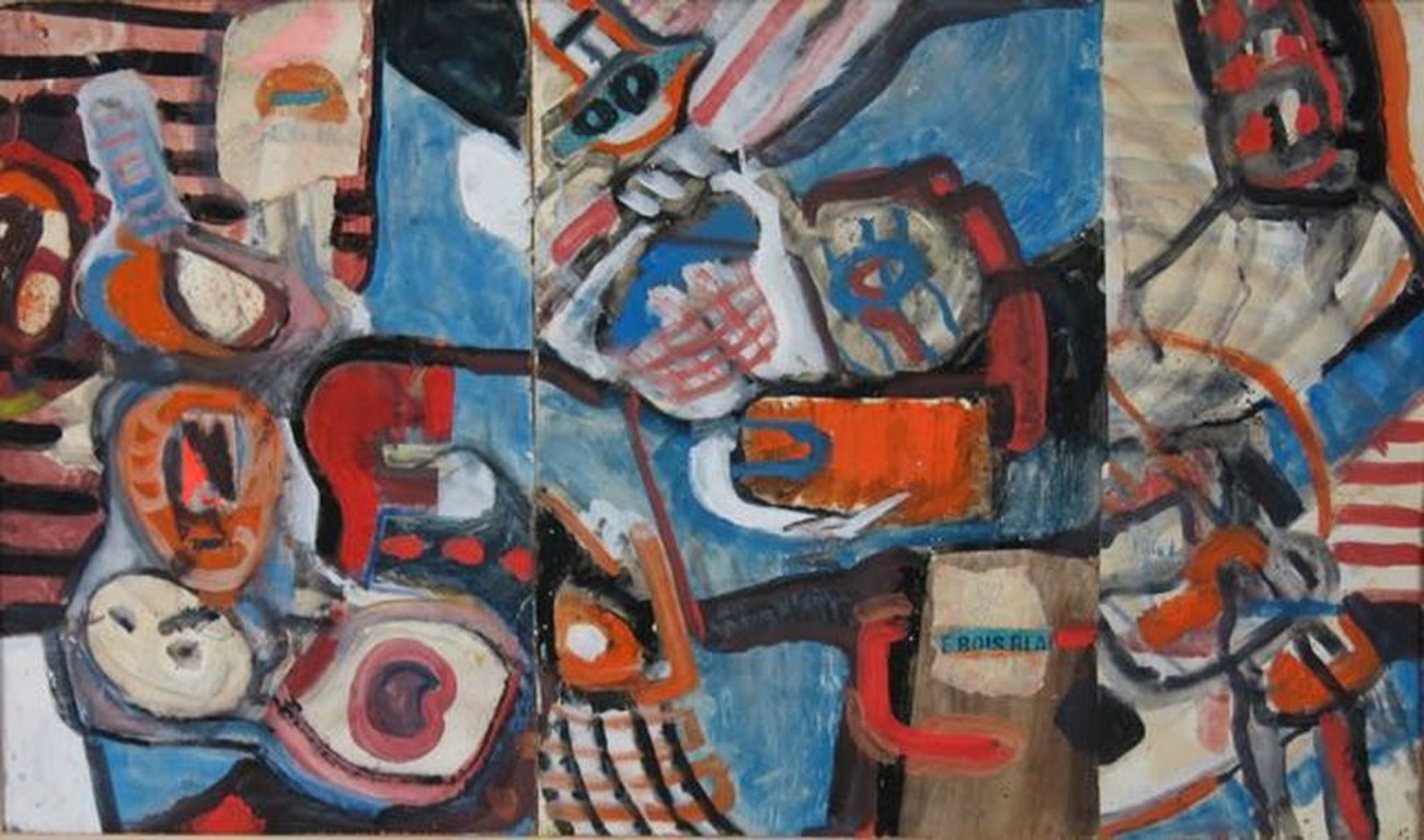 Materiaal, Collage,ecoline en acrylverf op papier,bevestigd op 3 board-platen