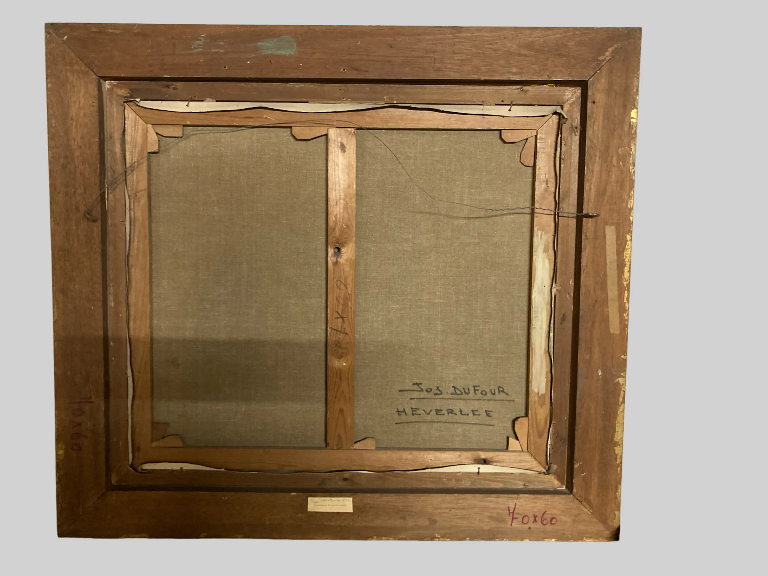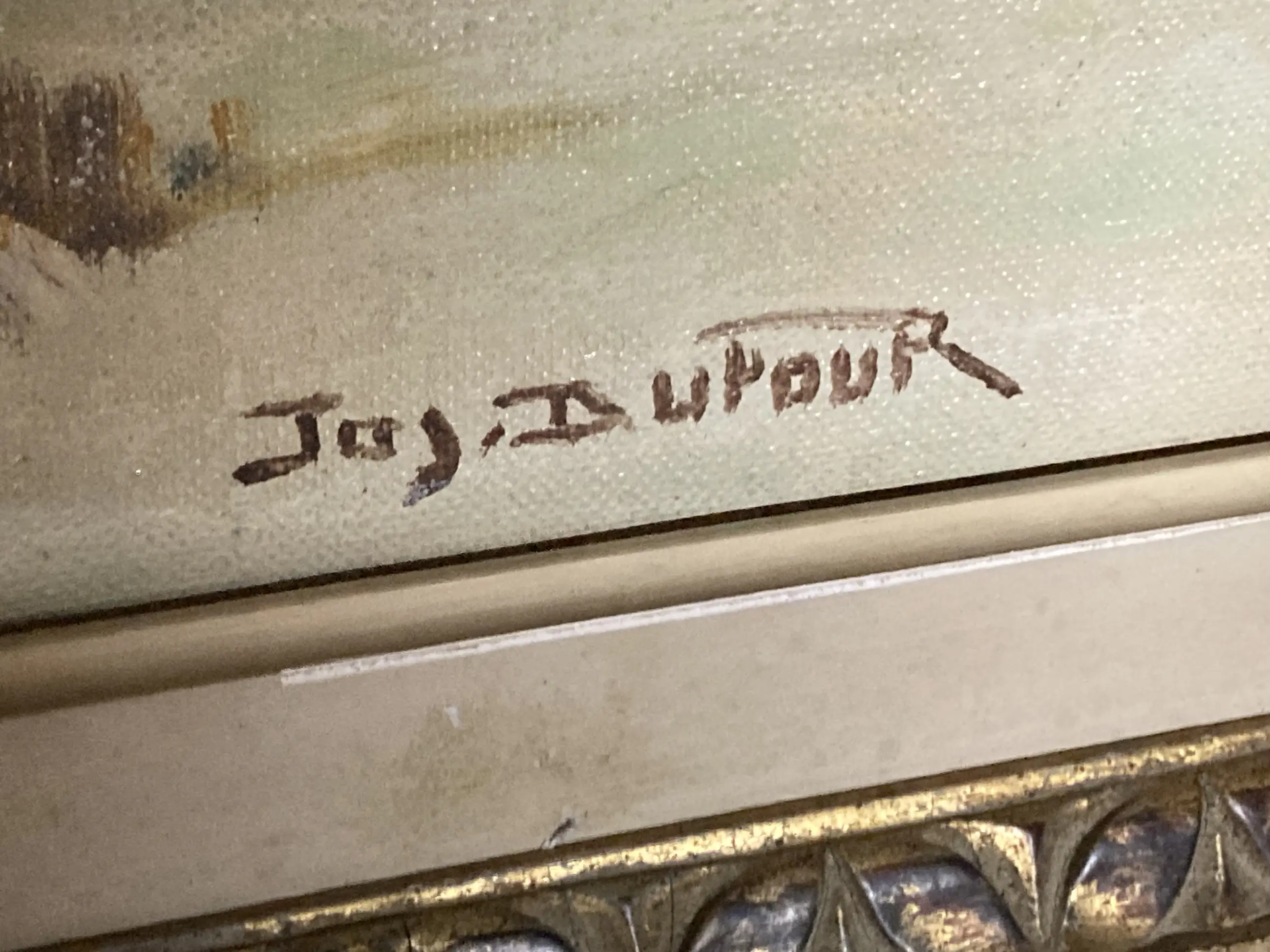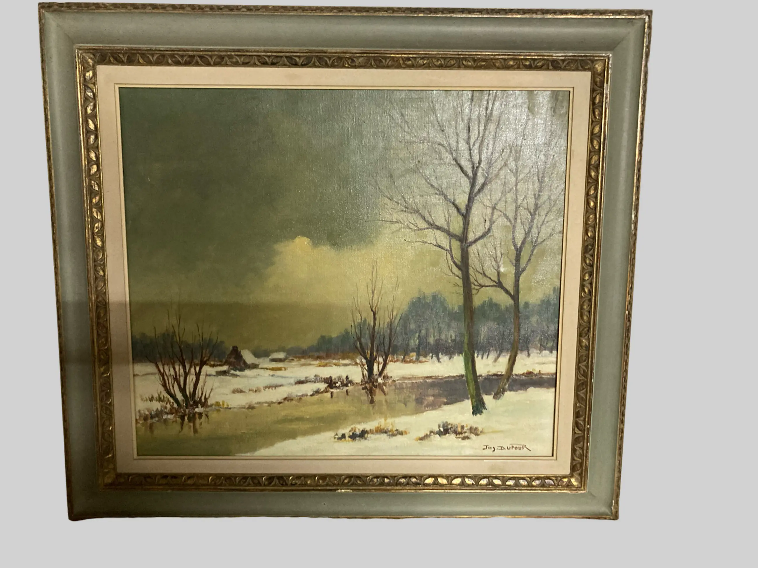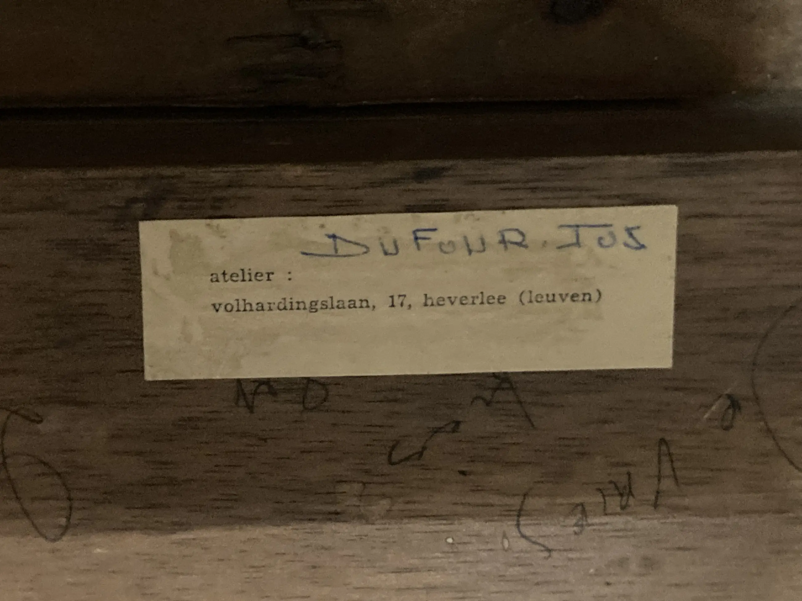 Jos Dufour was een Belgische kunstenaar, geboren te Leuven in 1896 en gestorven te Leuven in 1976. Hij was een schilder en pastellist. Opleiding volgde hij aan de Academie in Leuven, onder leiding van E. Faut, J. Hodru, L. Bosmans en O. Dierckx (1912-1916). Hij was van 1920 tot 1933 leerling van A. Delaunois. Hier hield hij zich ook bezig met smeedwerk. Hij plooide koper en ijzer met grote vaardigheid tot zeer expressieve gezichten: een clown, een blinde, een masker. Na de Tweede Wereldoorlog woonde hij enige tijd in Sint-Martens-Latem en kwam daar in contact met Permeke, De Saedeleer en Saverys. Hij werd er beïnvloed door zijn gevoel voor het mystieke en onderging in het begin ook invloeden van het Vlaams expressionisme. Hij debuteerde met (winter)landschappen, maar schilderde ook portretten, bloemstukken, haven- en zeegezichten. Hij hield van een lage horizonlijn om zo de grootsheid en de onrust van de wolkenvelden optimaal te kunnen weergeven. Uit de pers: ‘Zijn winterlandschappen op zichzelf zijn desolaat. Een schaarse boom of een kale struik op de voorgrond. Mensen, voor zover ze op zijn werken voorkomen, zijn slechts nietige en kwetsbare wezens, blootgesteld aan de krachten van de natuur. Het is vooral de bekoorlijkheid van het soms invallende licht dat deze vaak verwante onderwerpen differentieert.’ Jos Dufour evolueerde vanaf ongeveer de jaren 1960 naar het surrealisme en de fantastiek In 1965 werd hij lid van het Internationale Centrum voor Fantasmagorie. Er ontstonden toen hallucinante beelden uit zijn onderbewustzijn of verbeelding en opeenstapelingen van angstaanjagende wezens of motieven in schreeuwende kleuren. In 1965 behaalde hij een zilveren medaille op de Internationale Wedstrijd voor Schilderkunst in Villers-la-Ville. Hij had een atelier in Heverlee. Hij staat vermeld in BAS I en Twee eeuwen signaturen van belgische kunstenaars. (Piron)