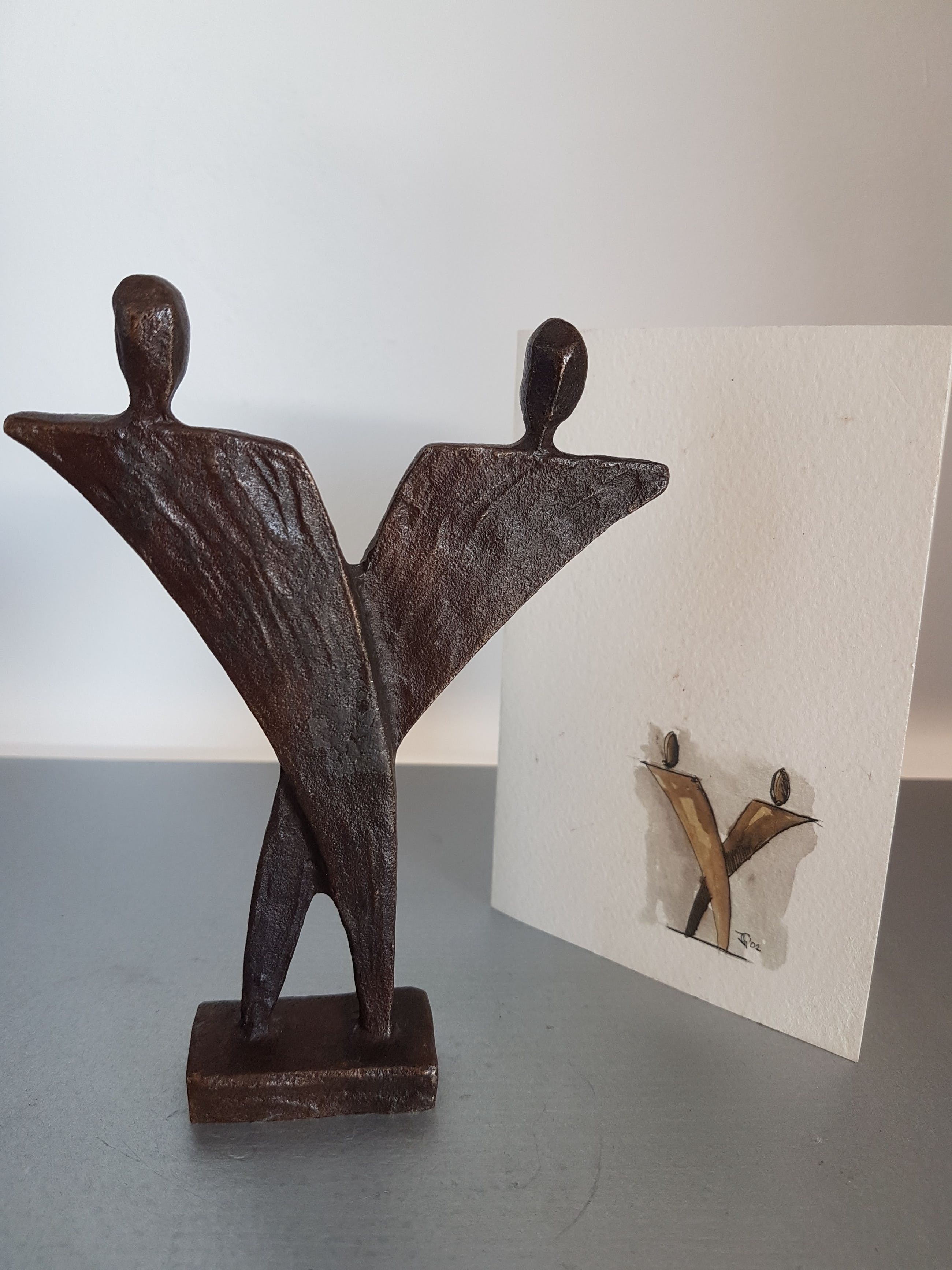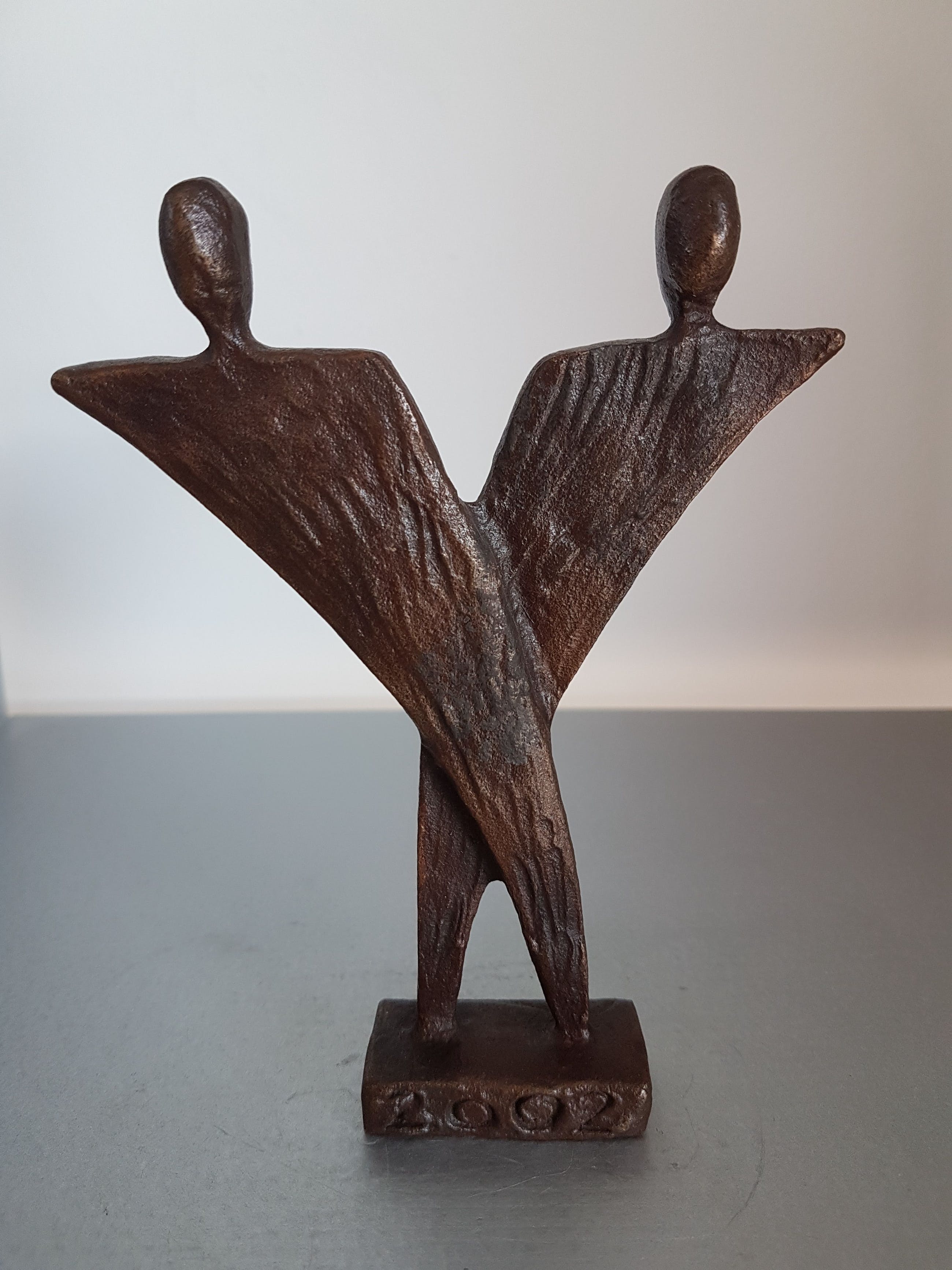 Vol brons sculptuur van twee figuren, die samen een eenheid vormen. Er is sprake van verbondenheid tussen beide figuren, zij vullen elkaar aan.