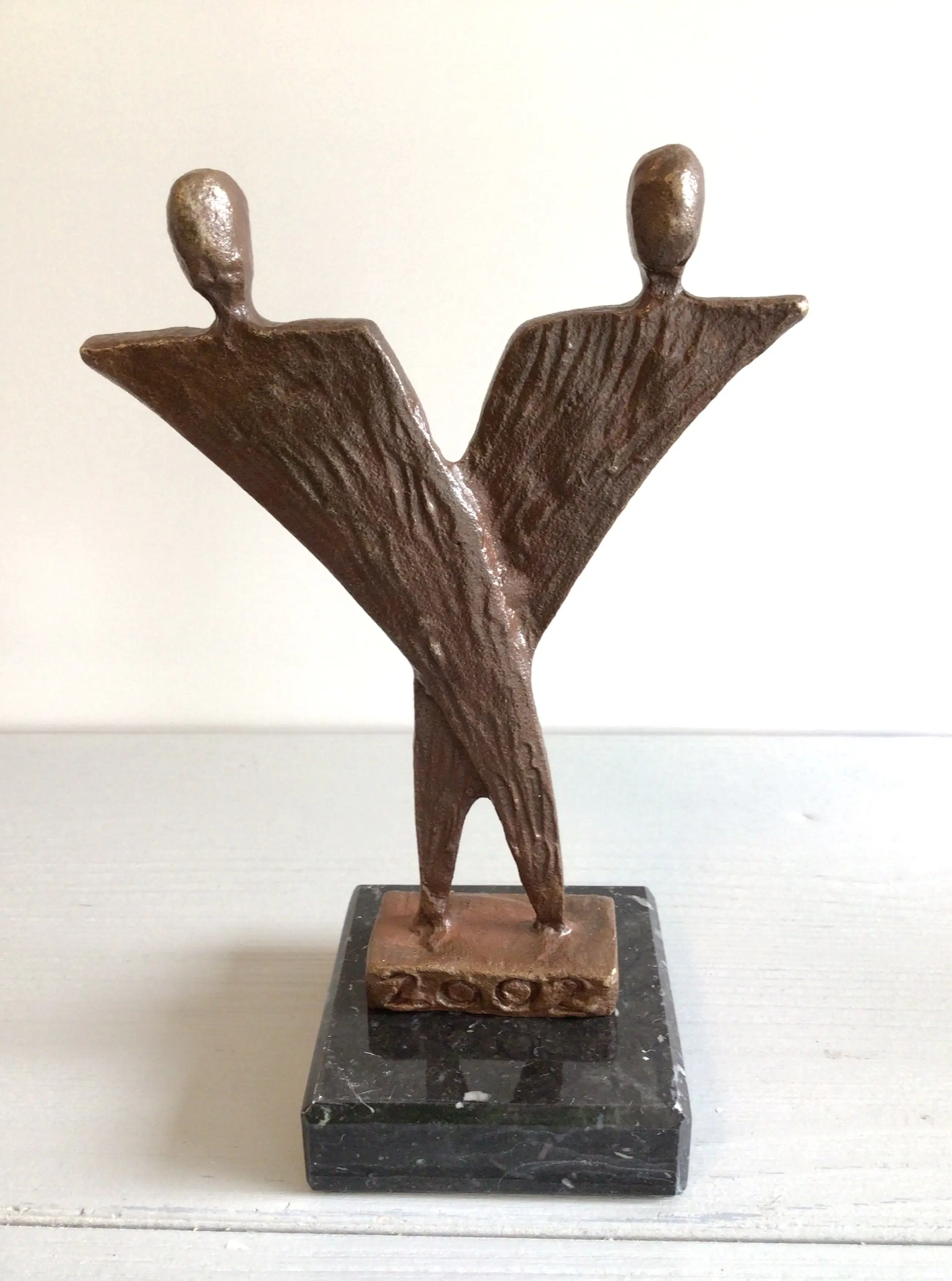 Zeer fraai vormgegeven symbolisch sculptuur van twee mensfiguren die onderaan de basis een geheel vormen, ze zijn onlosmakelijk met elkaar verbonden Het beeld is onderaan gesigneerd: 2002 Kunstenaar : Jos Gielen Titel “ Vriendschap “ Achtergrondgedachte “ Dit sculptuur symboliseert de verbondenheid, liefde en vriendschap die twee mensen met elkaar kunnen hebben “ Hoogte : 16 cm ( inclusief sokkel) Materiaal: brons Het sculptuur staat los op de sokkel zodat u zelf kunt bepalen of u deze wilt gebruiken of niet. Het verkeert in zeer goede staat en wordt zorgvuldig verpakt verzonden