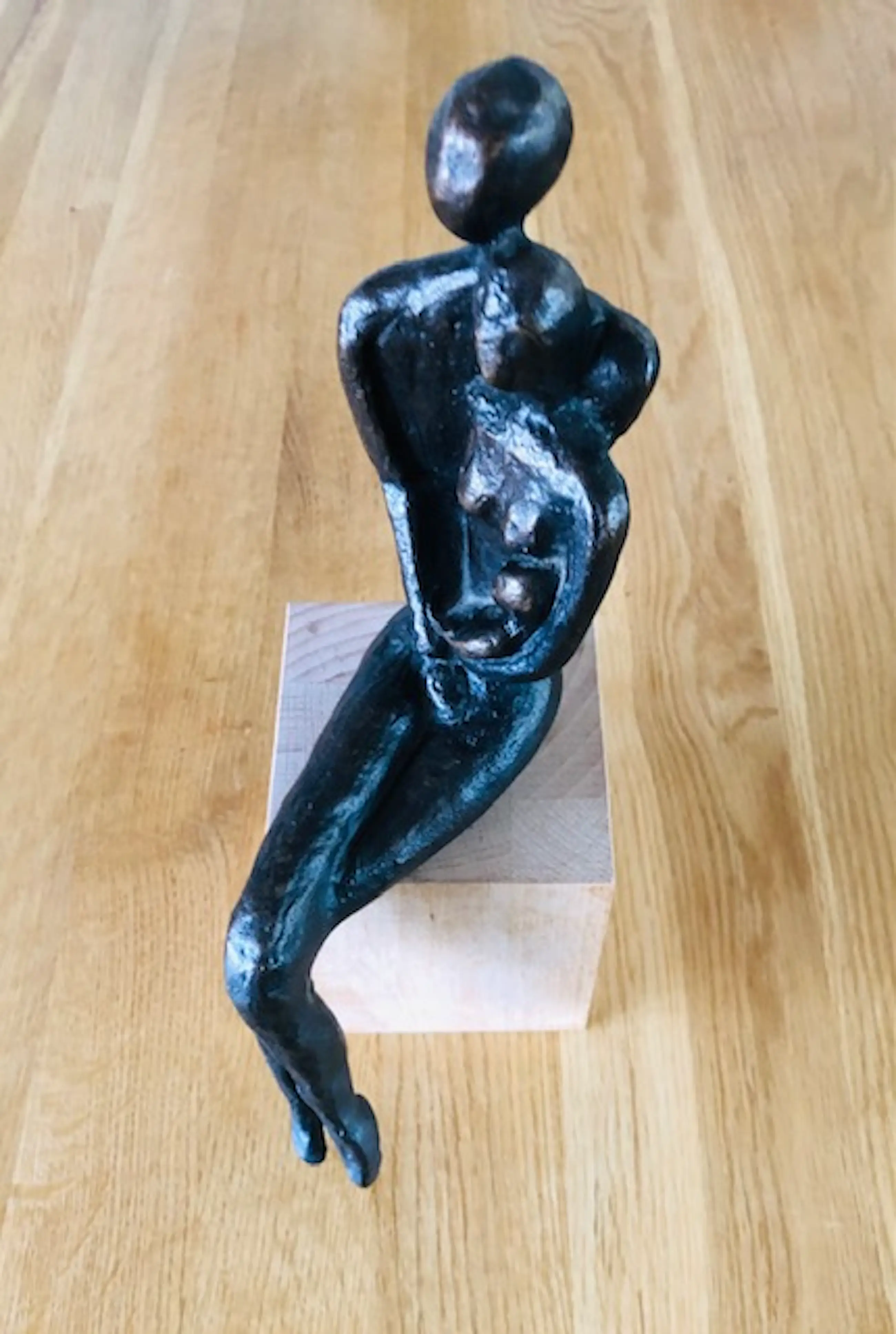 Prachtig beeld voorstelling gezin vader moeder en baby. Beeld is geplaats op eikenhouten sokkel. Beeld en sokkel zijn in perfecte conditie. Gesigneerd J G = Jos Gielen.