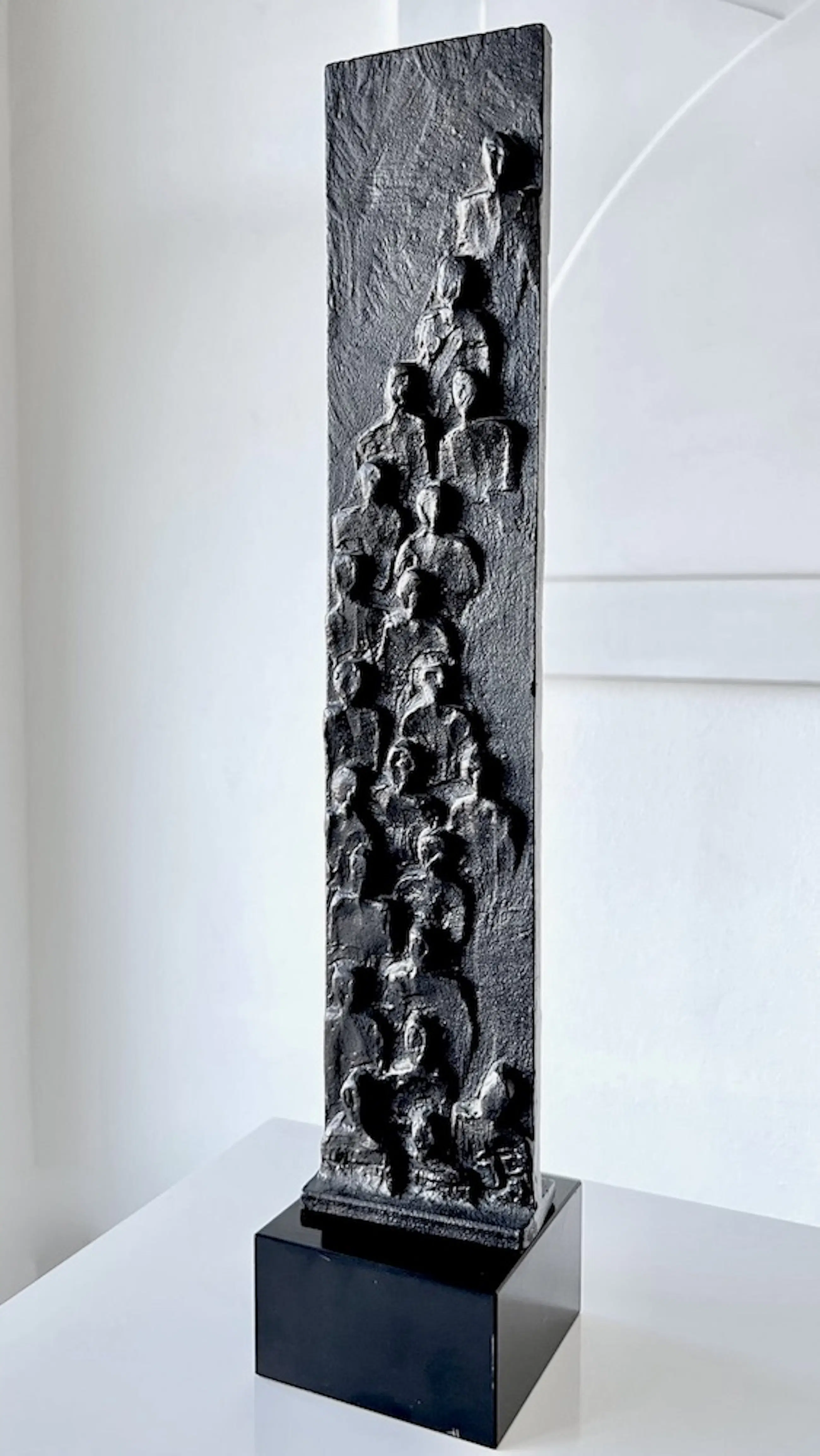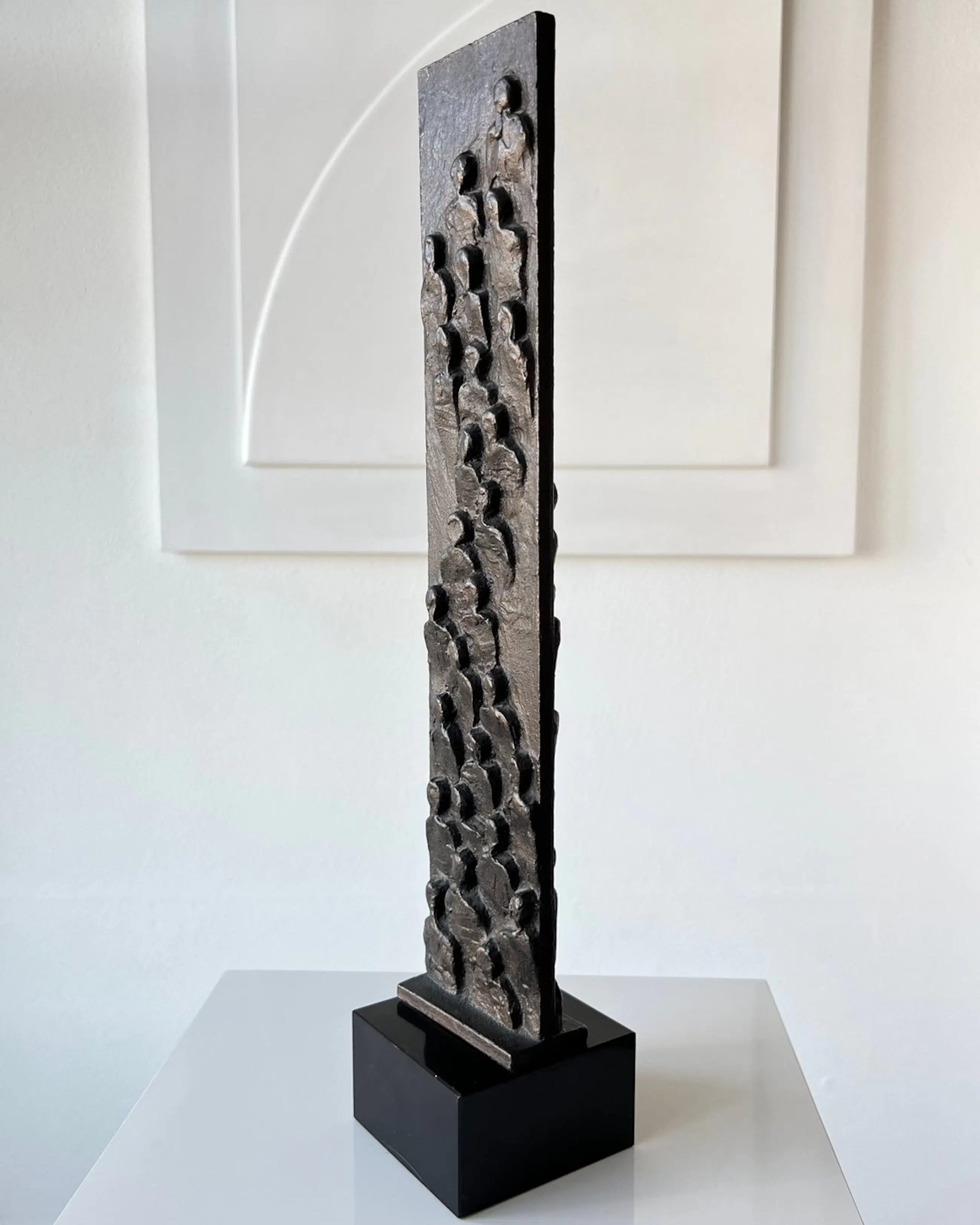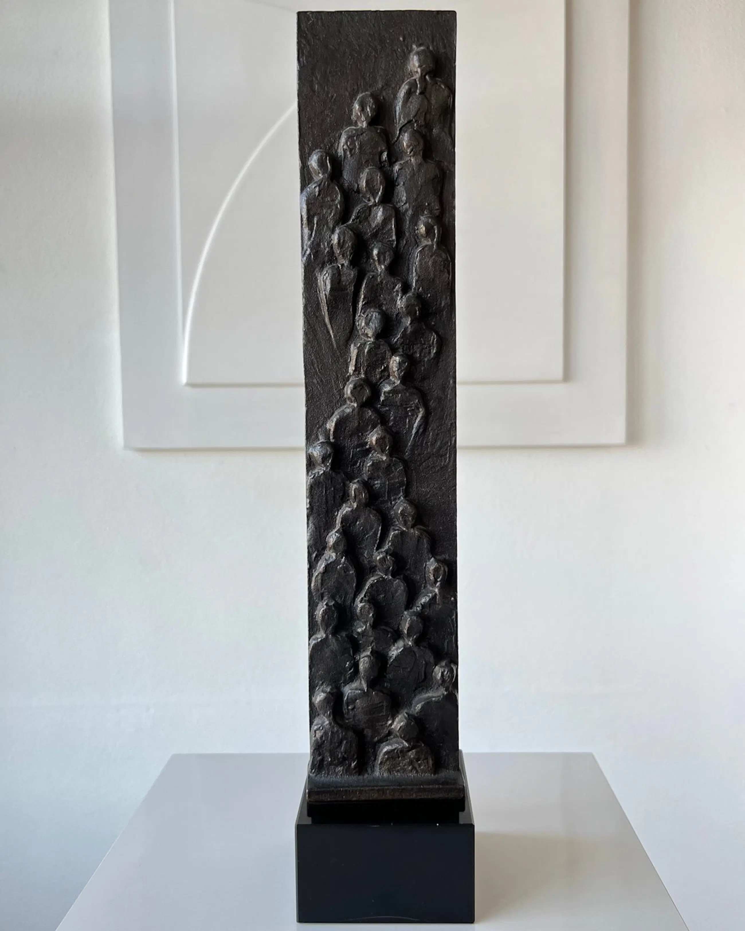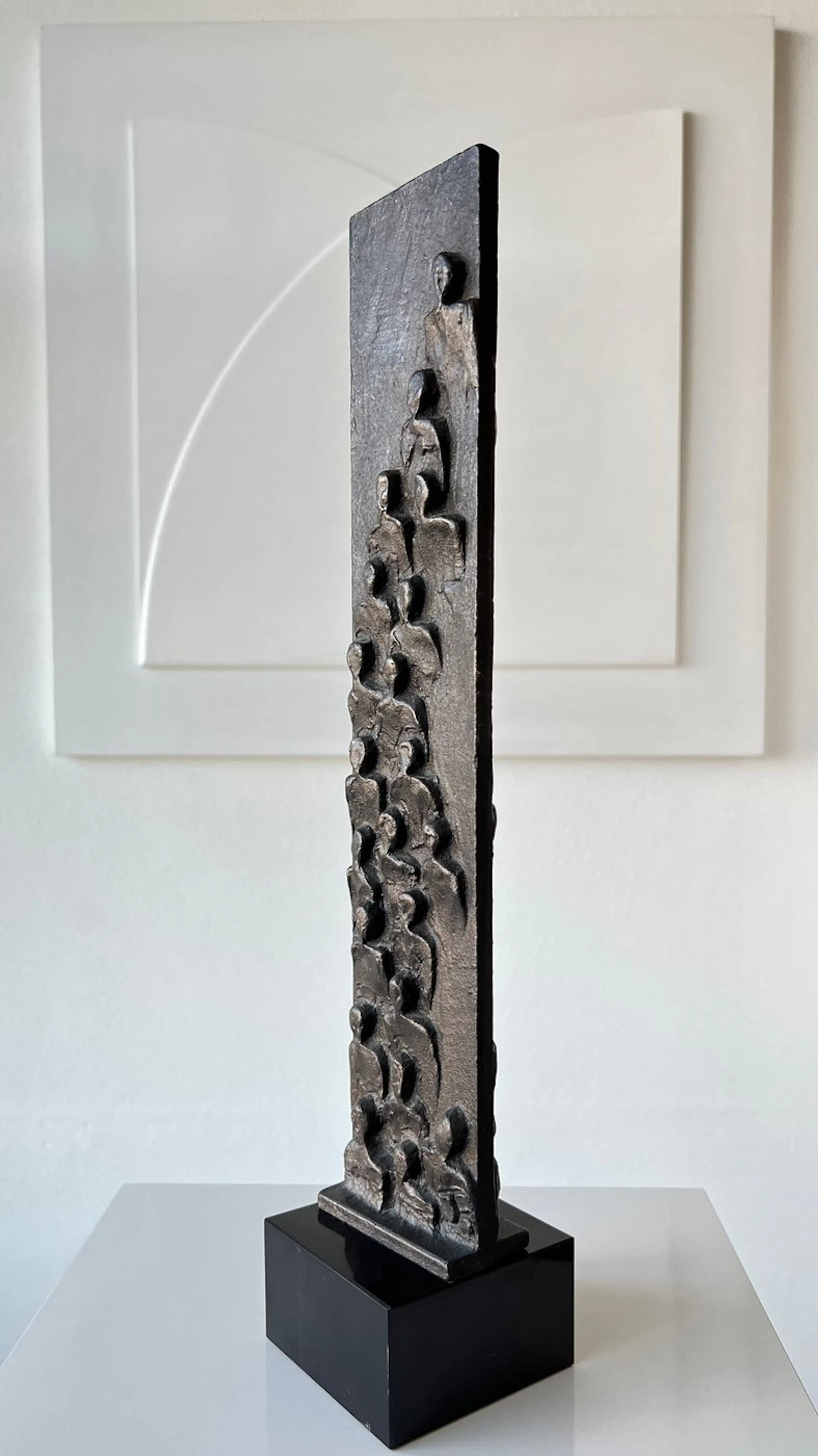 Een prachtig en uniek abstract hoog vol brons sculptuur van Nederlands beeldhouwer Jos Gielen (1952) op een Belgisch hardstenen sokkel. Het werk kreeg als titel 'Samen op weg' en gemaakt rond 2000.