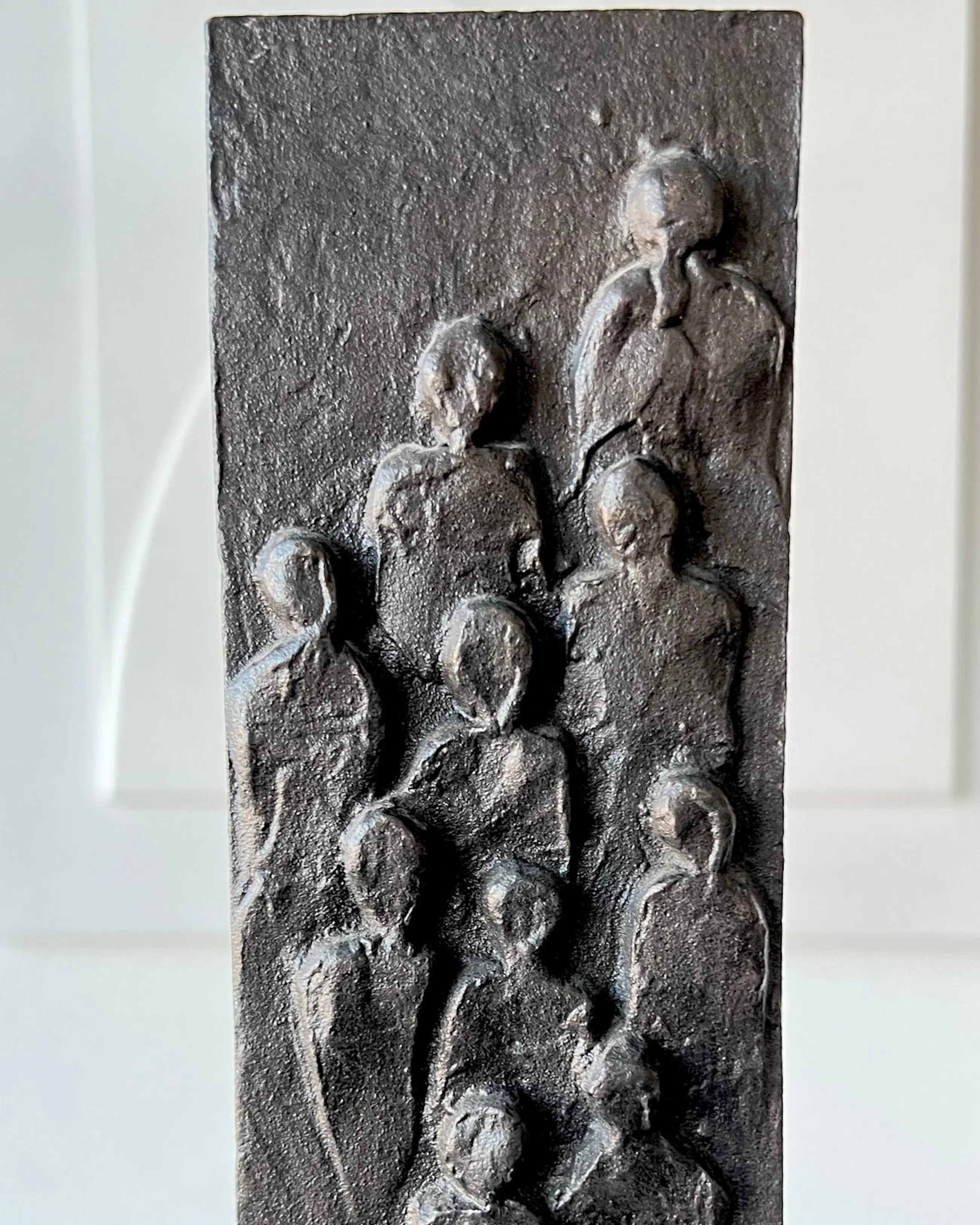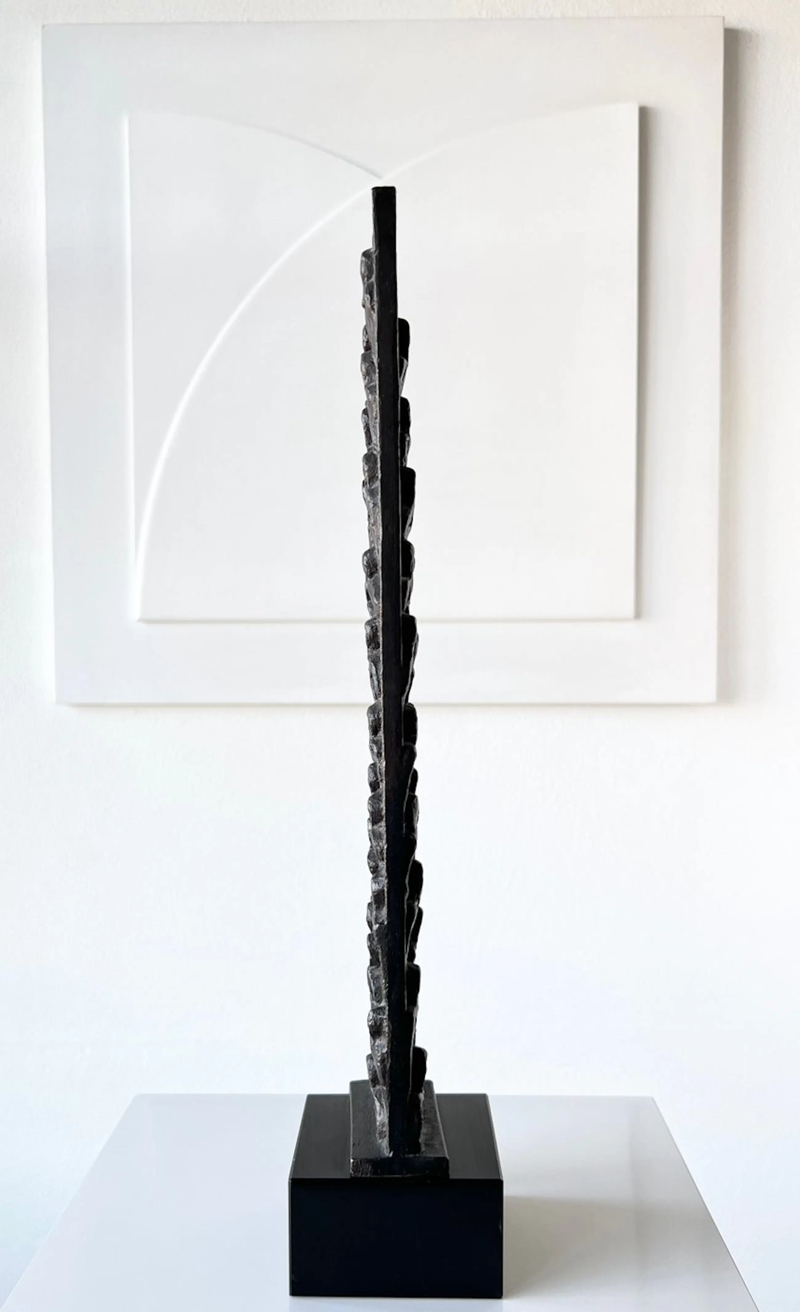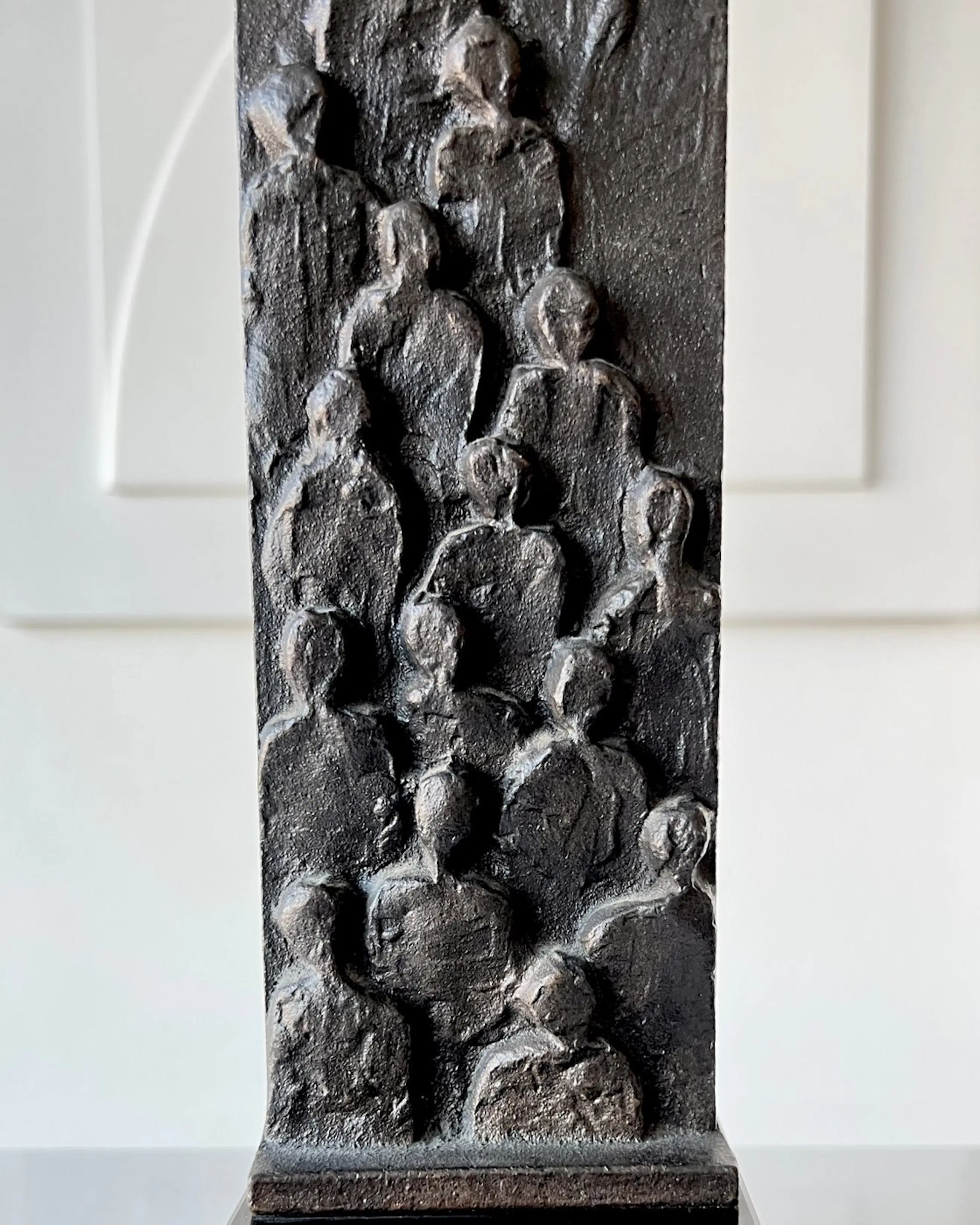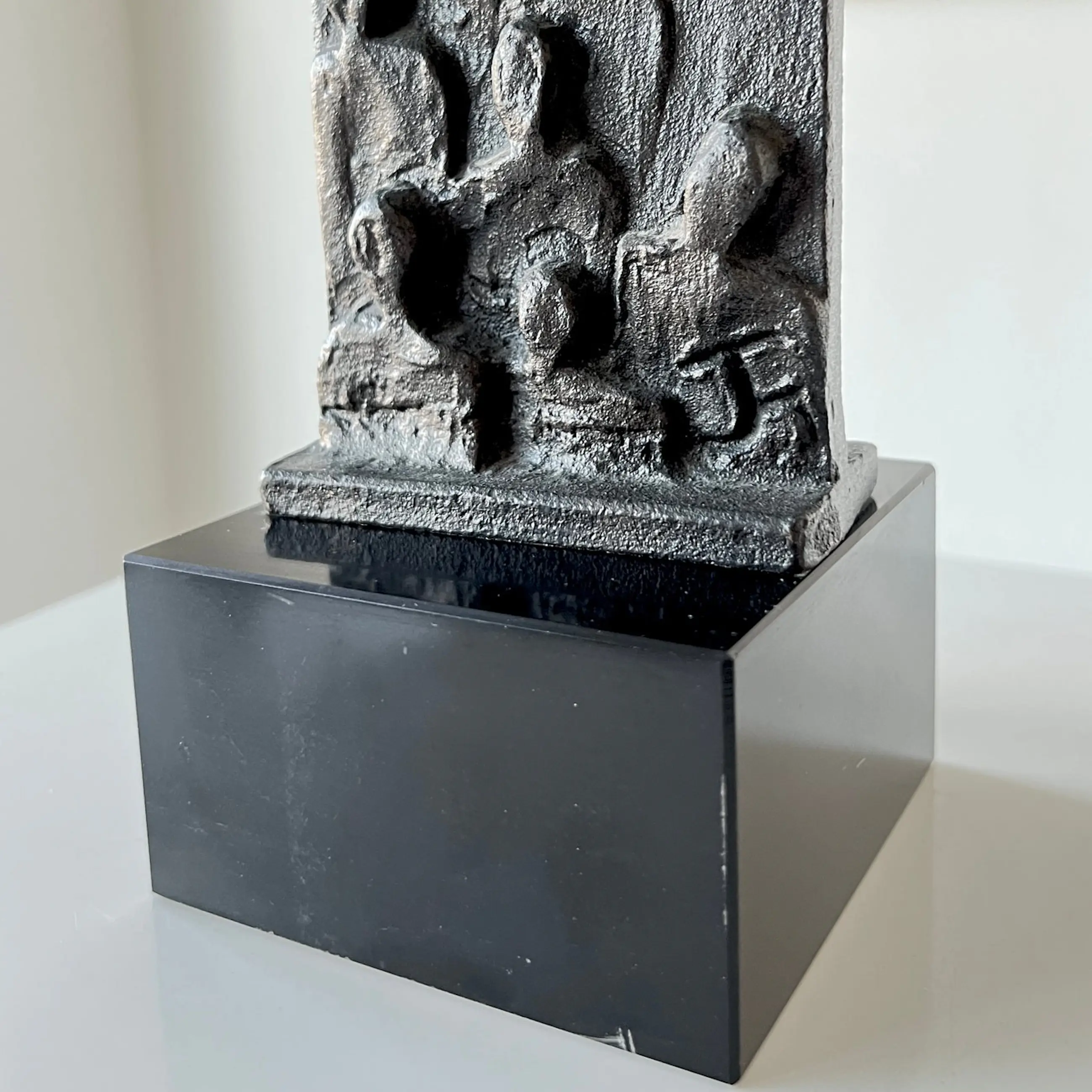 Een prachtig en uniek abstract hoog vol brons sculptuur van Nederlands beeldhouwer Jos Gielen (1952) op een Belgisch hardstenen sokkel. Het werk kreeg als titel 'Samen op weg' en gemaakt rond 2000.