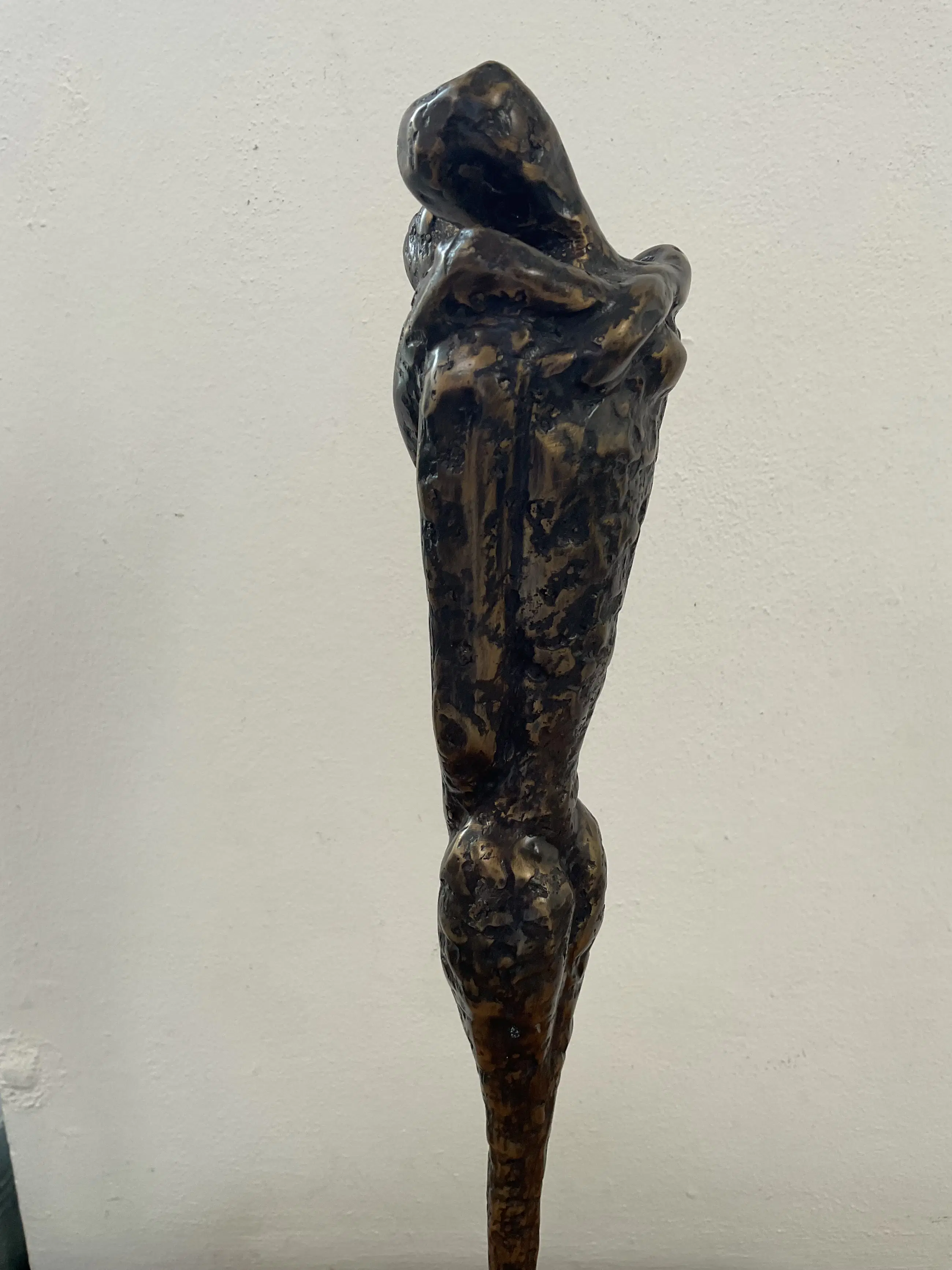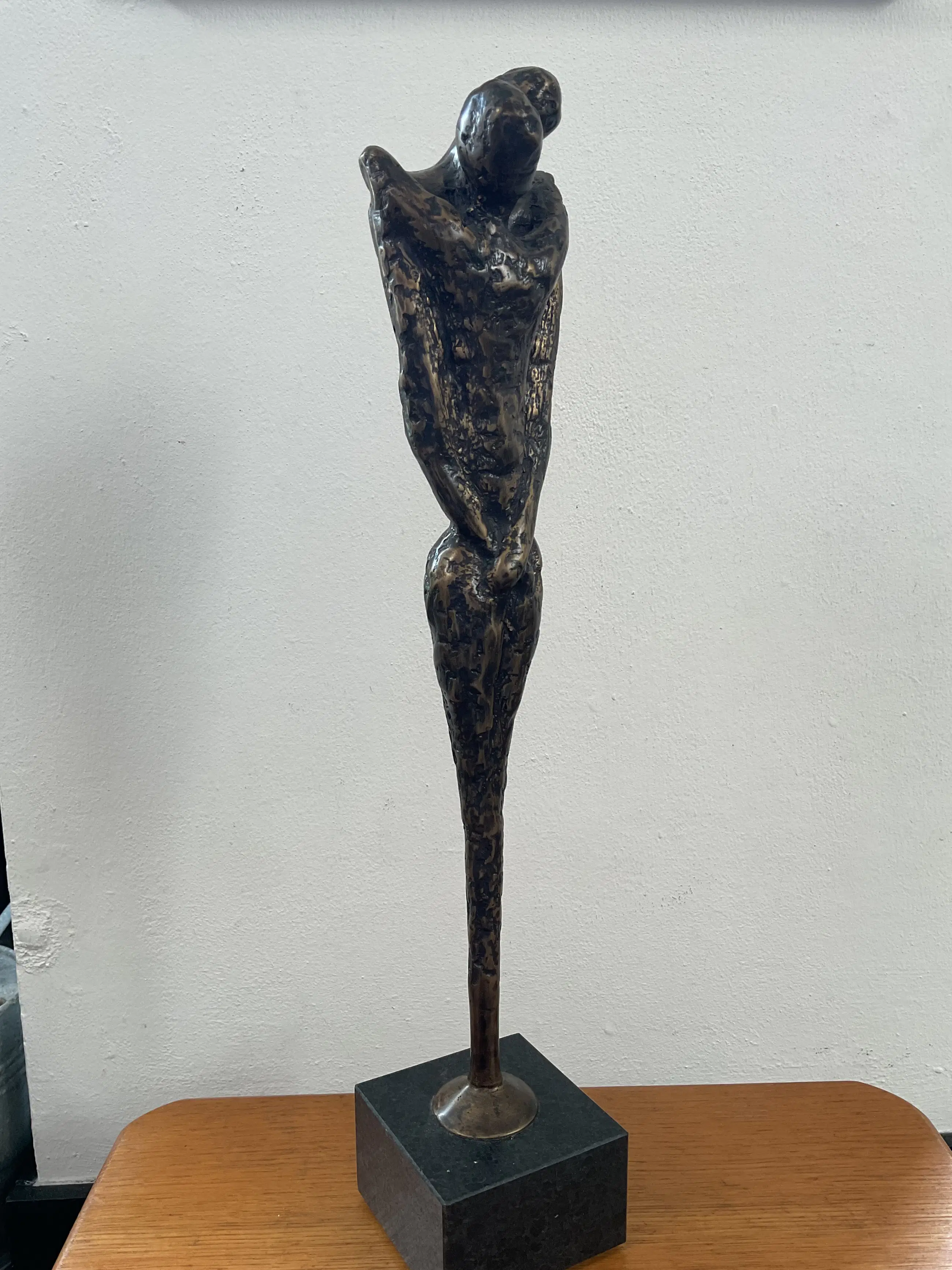 Jos Gielen(1952) is een veelzijdig kunstenaar. Zijn bronzen beelden zijn van een herkenbare stijl. Dit werk beeld een letterlijk innig ineengesmolten paar uit. Hij heeft dit thema vaker gebruikt. Perfect in conditie op een gave hardstenen sokkel.