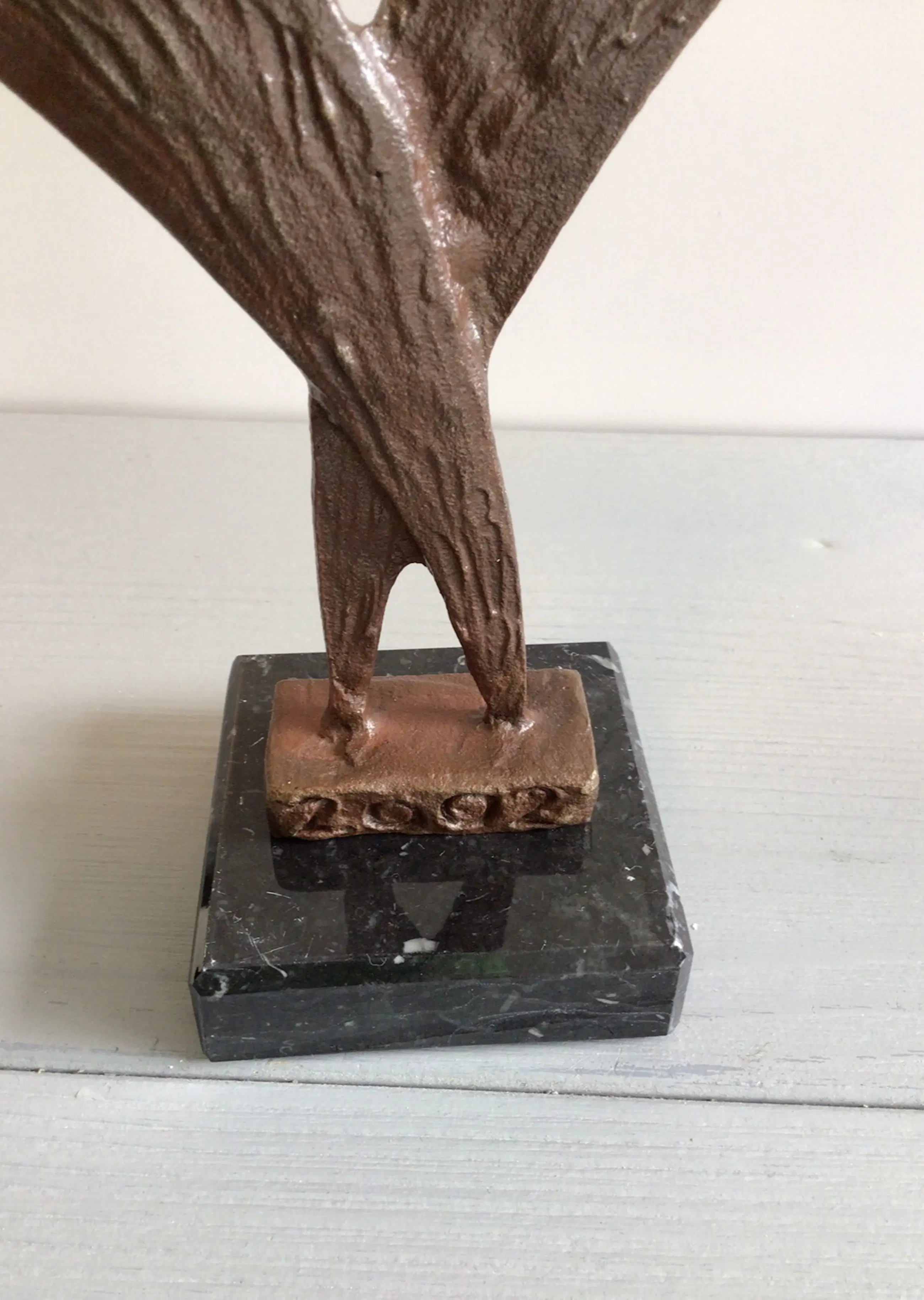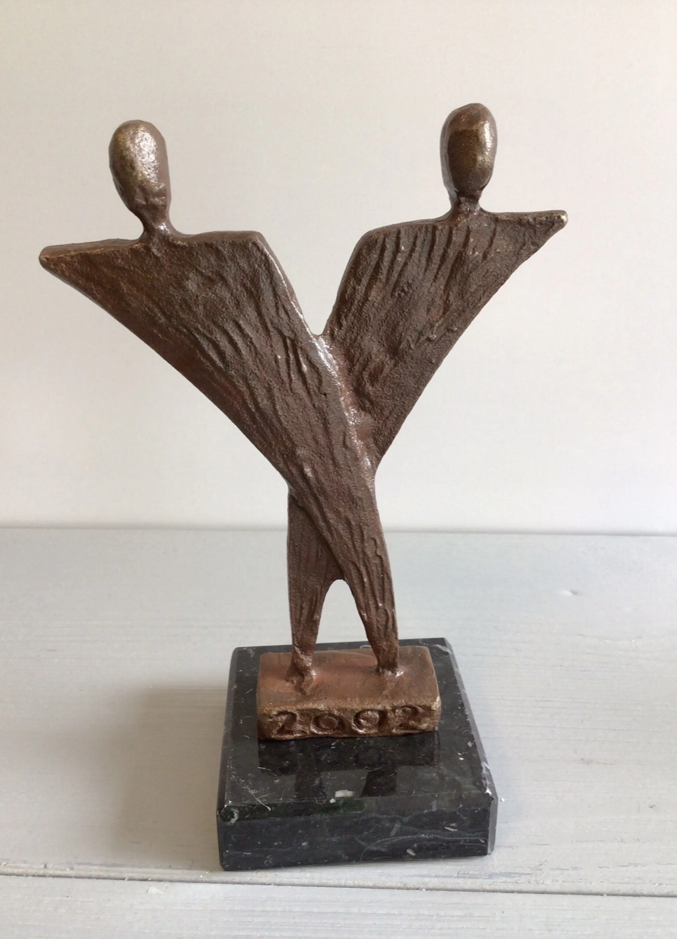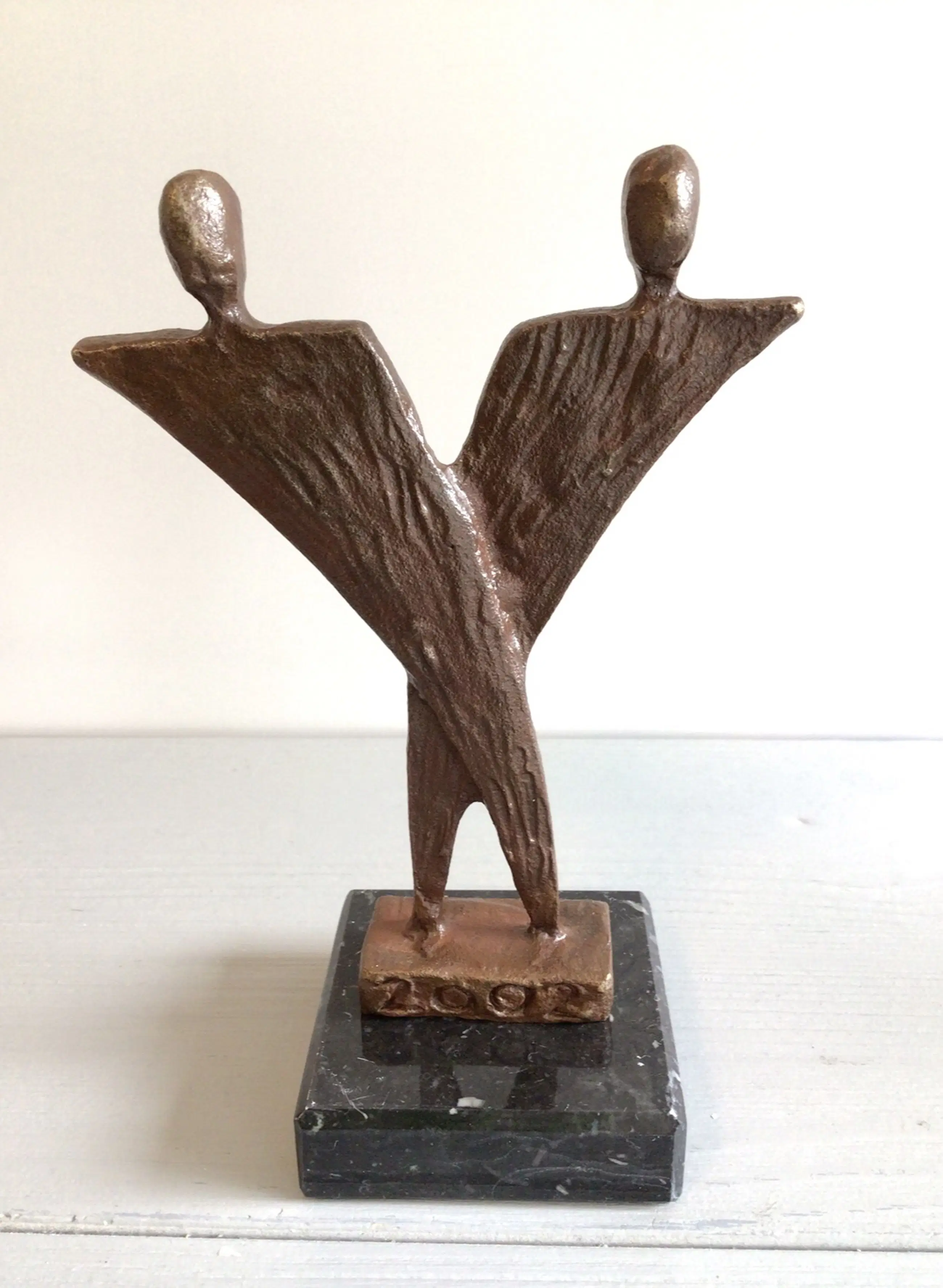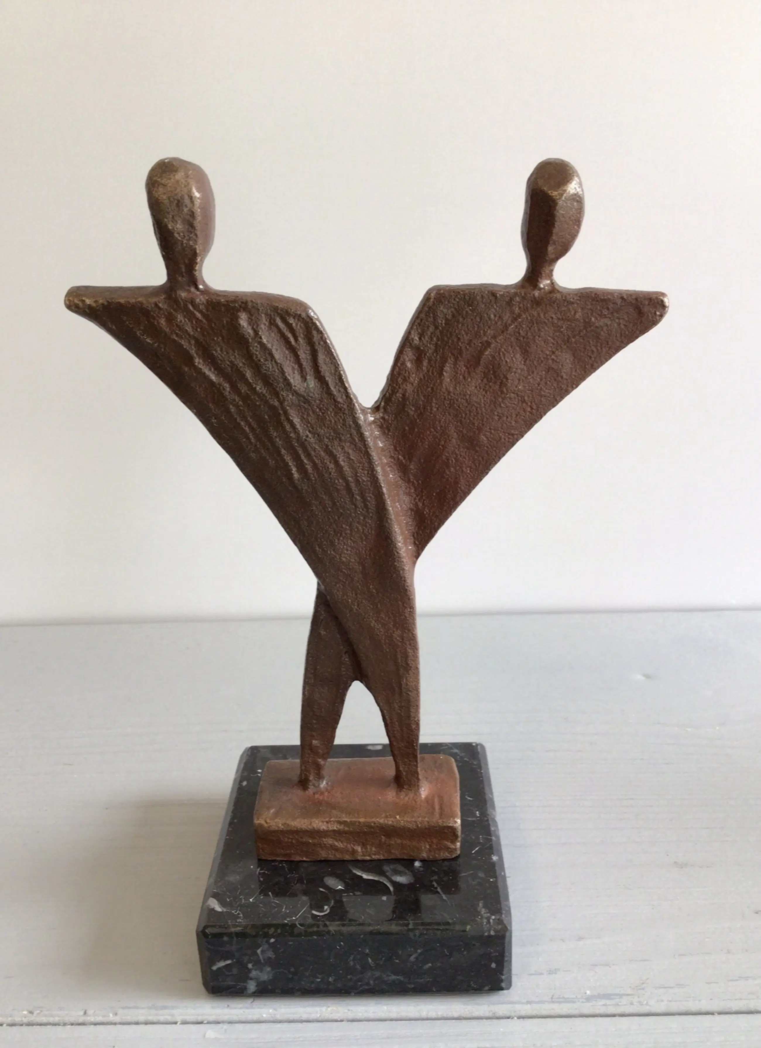 Zeer fraai vormgegeven symbolisch sculptuur van twee mensfiguren die onderaan de basis een geheel vormen, ze zijn onlosmakelijk met elkaar verbonden Het beeld is onderaan gesigneerd: 2002 Kunstenaar : Jos Gielen Titel “ Vriendschap “ Achtergrondgedachte “ Dit sculptuur symboliseert de verbondenheid, liefde en vriendschap die twee mensen met elkaar kunnen hebben “ Hoogte : 16 cm ( inclusief sokkel) Materiaal: brons Het sculptuur staat los op de sokkel zodat u zelf kunt bepalen of u deze wilt gebruiken of niet. Het verkeert in zeer goede staat en wordt zorgvuldig verpakt verzonden